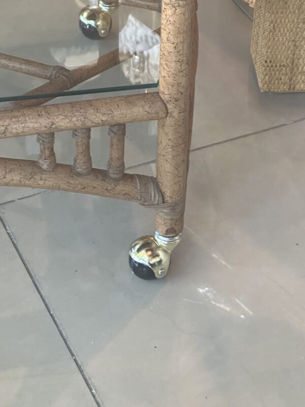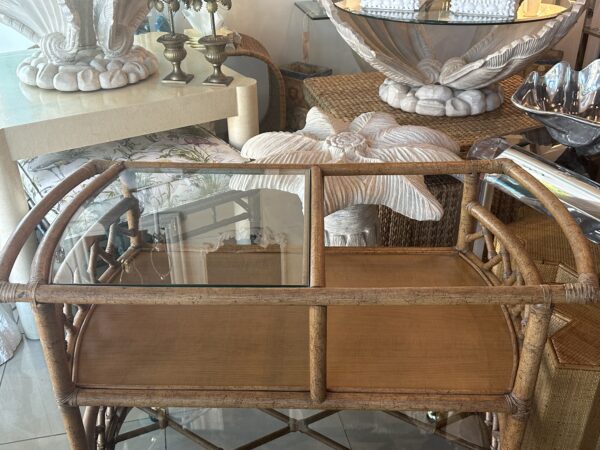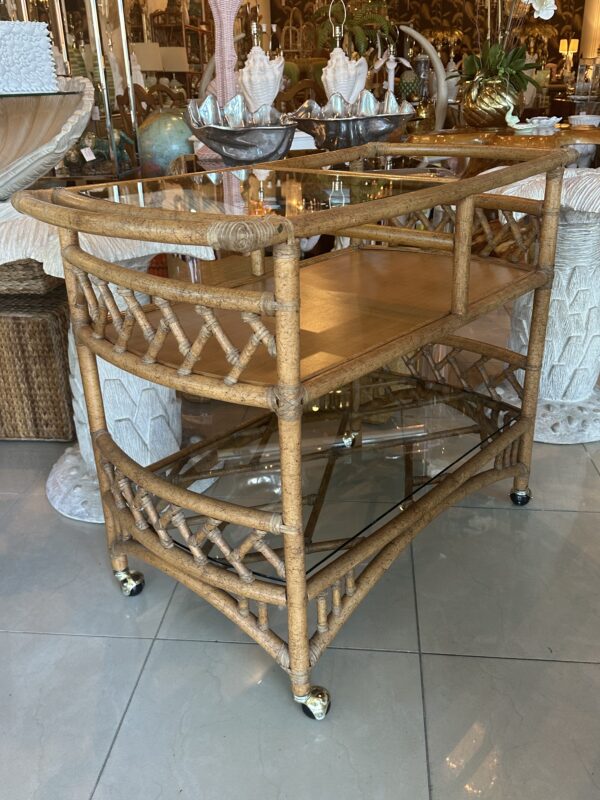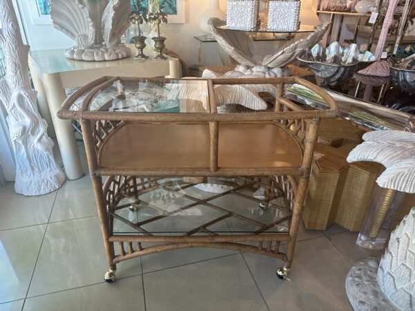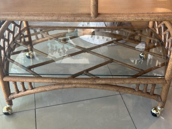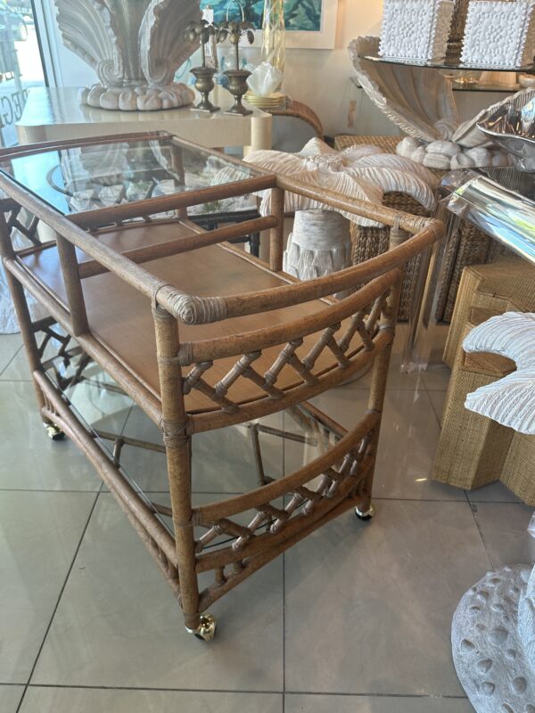 Vintage Ficks Reed large rattan bamboo bar cart. Lots of storage on this cart! Top glass will be replaced. Bottom glass is vintage & may have minor scratches. We installed new brass castors on this piece. No damaged rattan. Dimensions: 32.5 H x 42 W x 20.5 D.