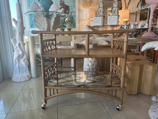 Vintage Ficks Reed Palm Beach Tropical Rattan & Bamboo Bar Cart Barcart Glass Top