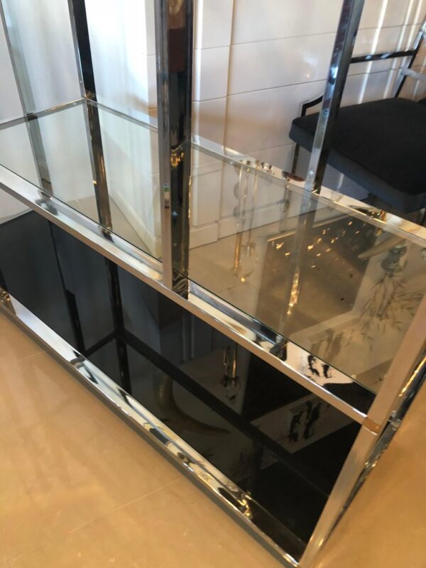 Vintage arched chrome with brass accents display shelf shelves etagere. Chrome has been polished. Glass is new with the exception of the original dark colored glass bottom shelves. In the style of Milo Baughman.