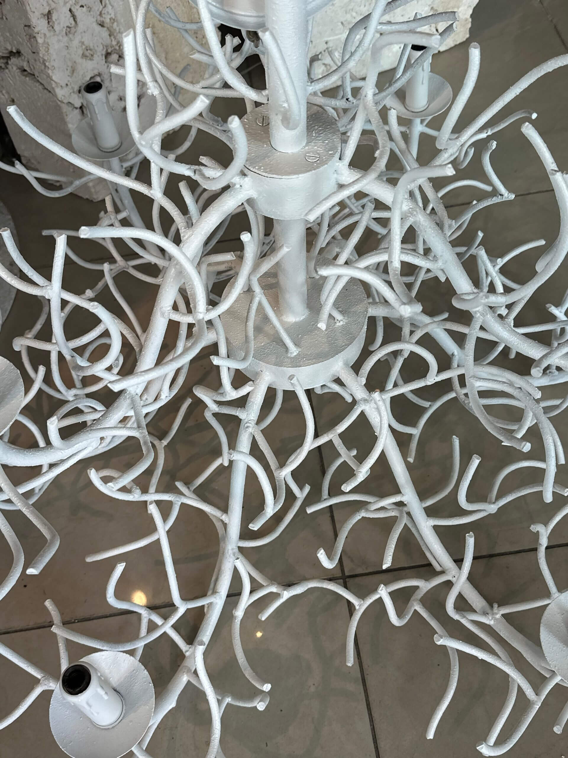 Vintage two tier faux coral iron white metal chandelier. 9 lights. Tested, working order. Newly lacquered white. New drip wax style candelabra white covers. Comes with original ceiling cap. Dimensions: 26 H x 36 D.