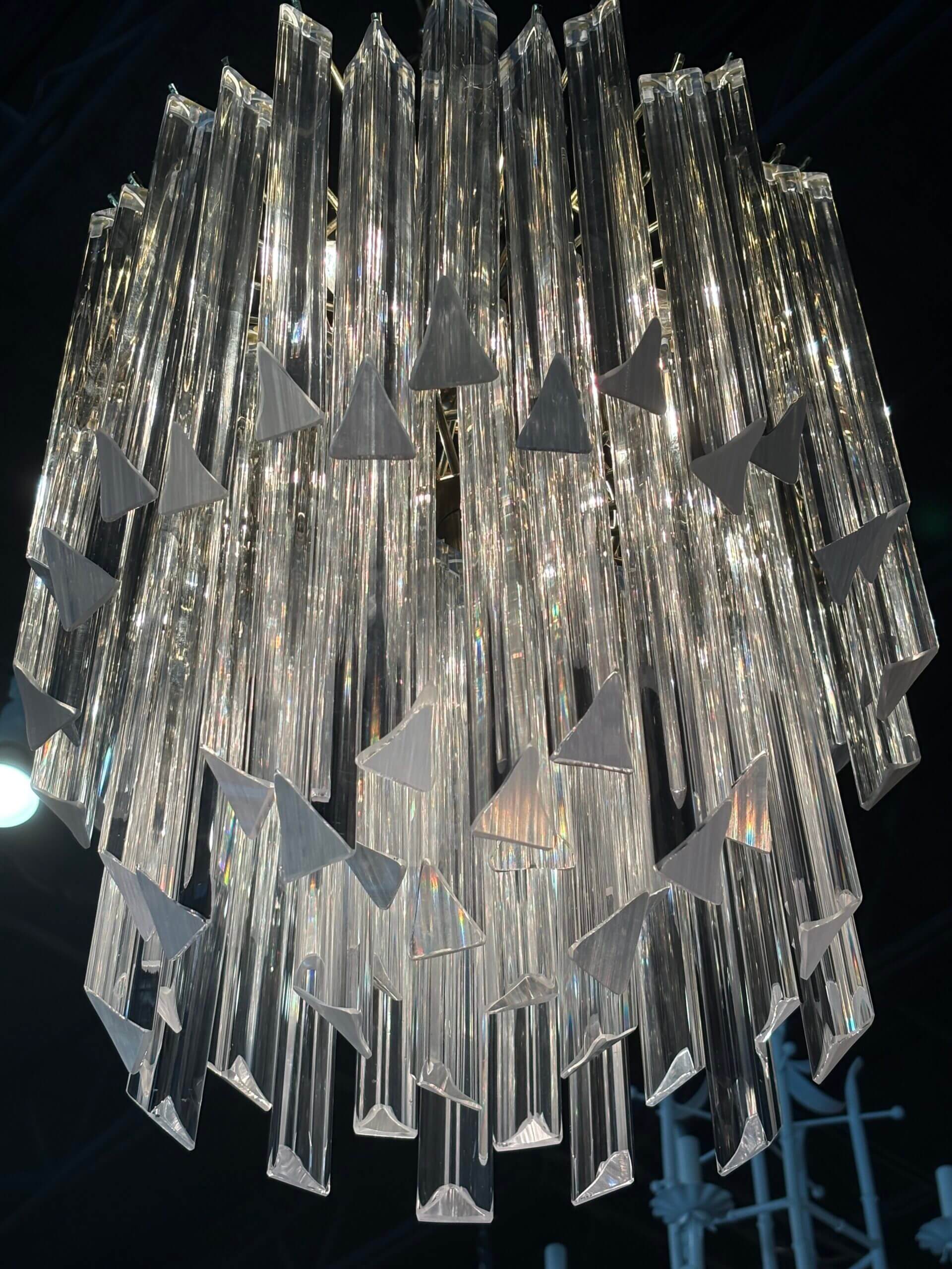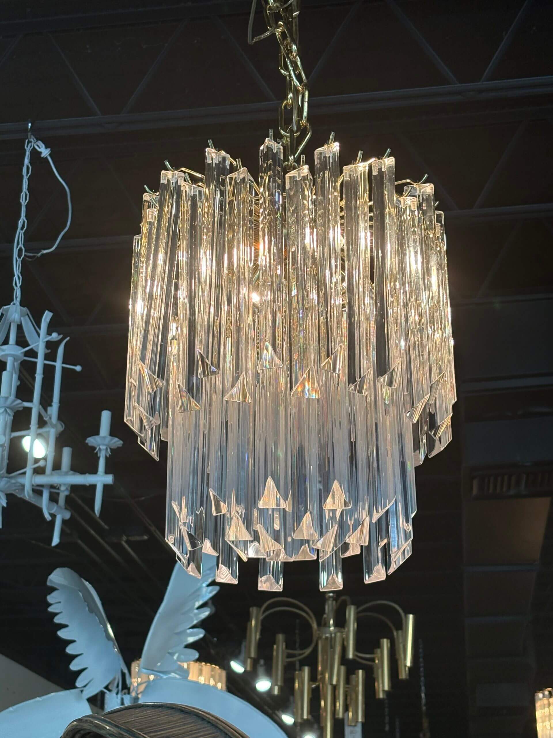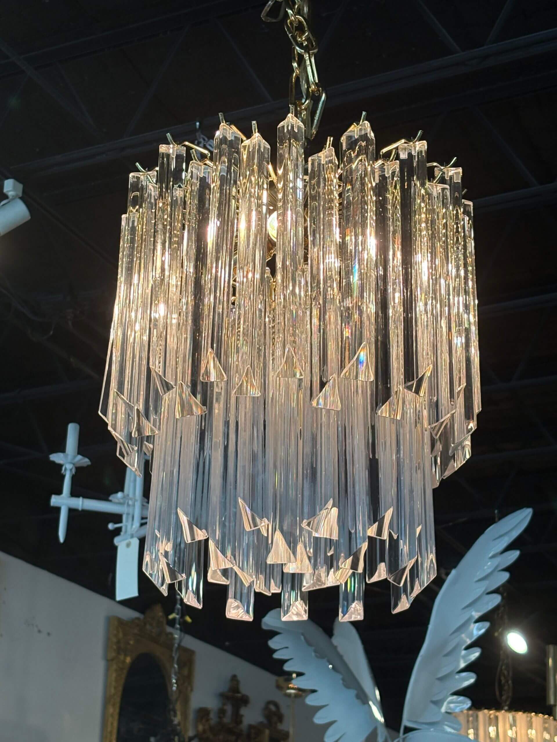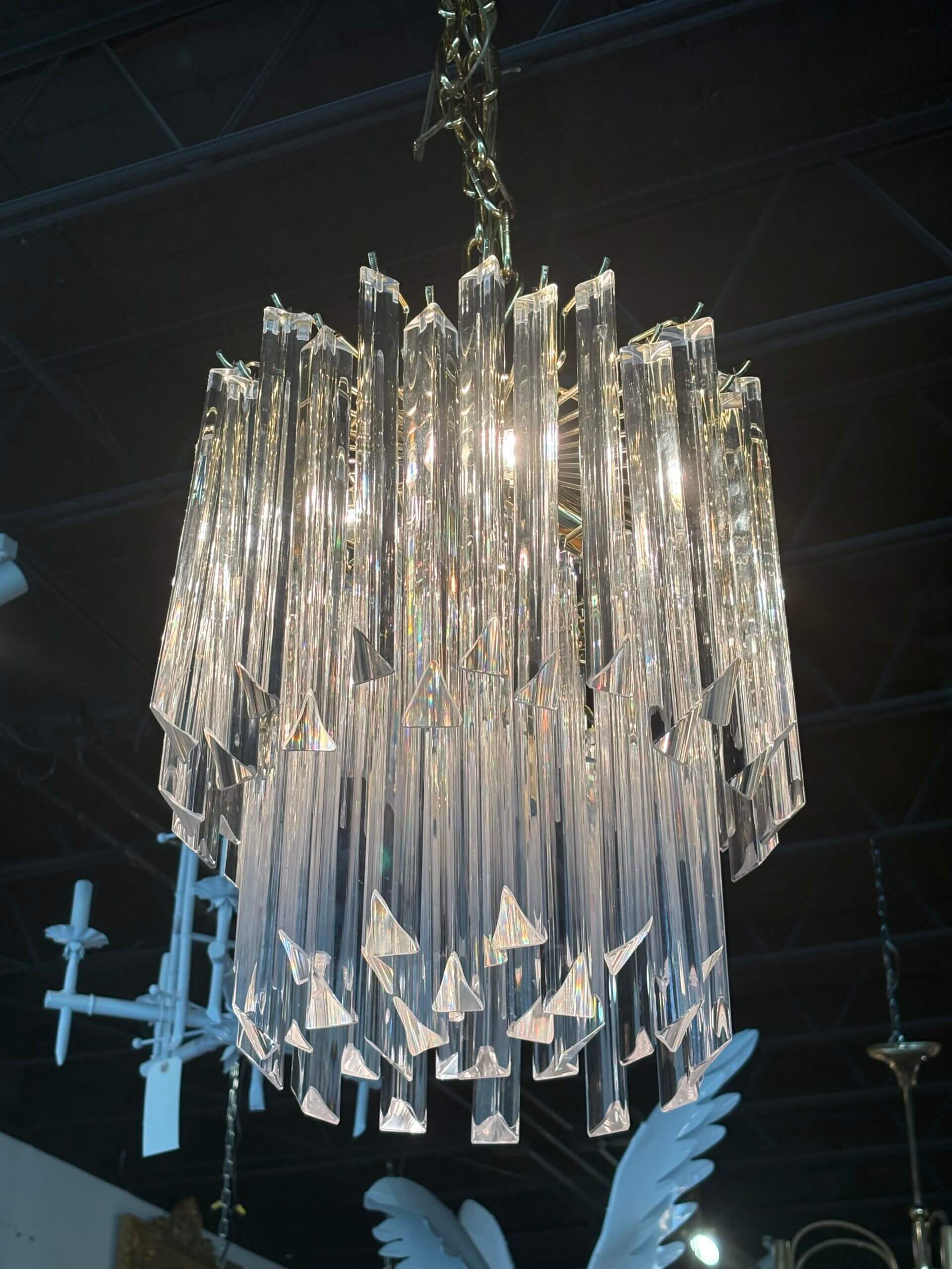Beautiful vintage Murano Camer Trilobi Venini Chandelier. 66 glass pieces, no damage or chips to any glass. Brass chain with ceiling cap, original. Brass cage. 5 lights. Dimensions: 20 H x 16 W x 16 D. Size is of chandelier only. Wired for US.