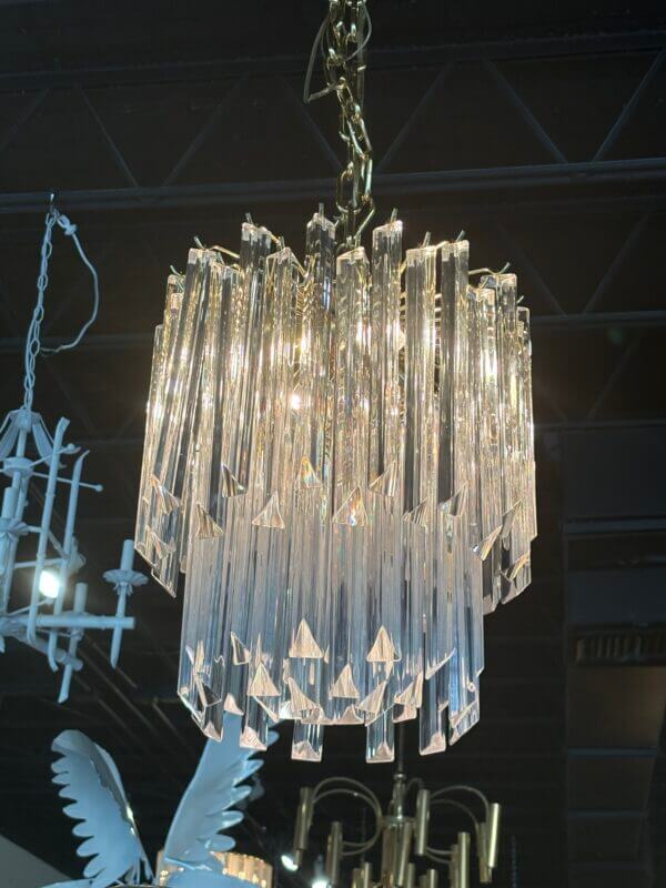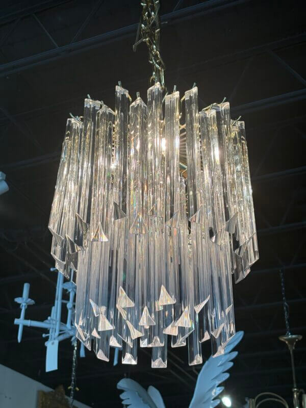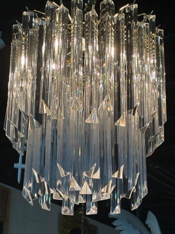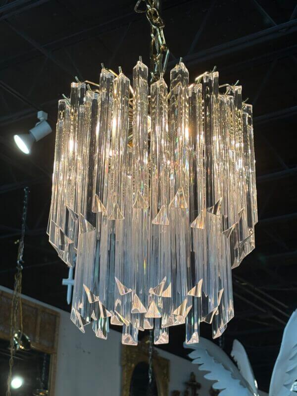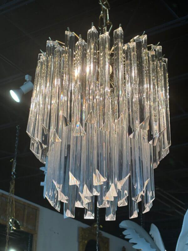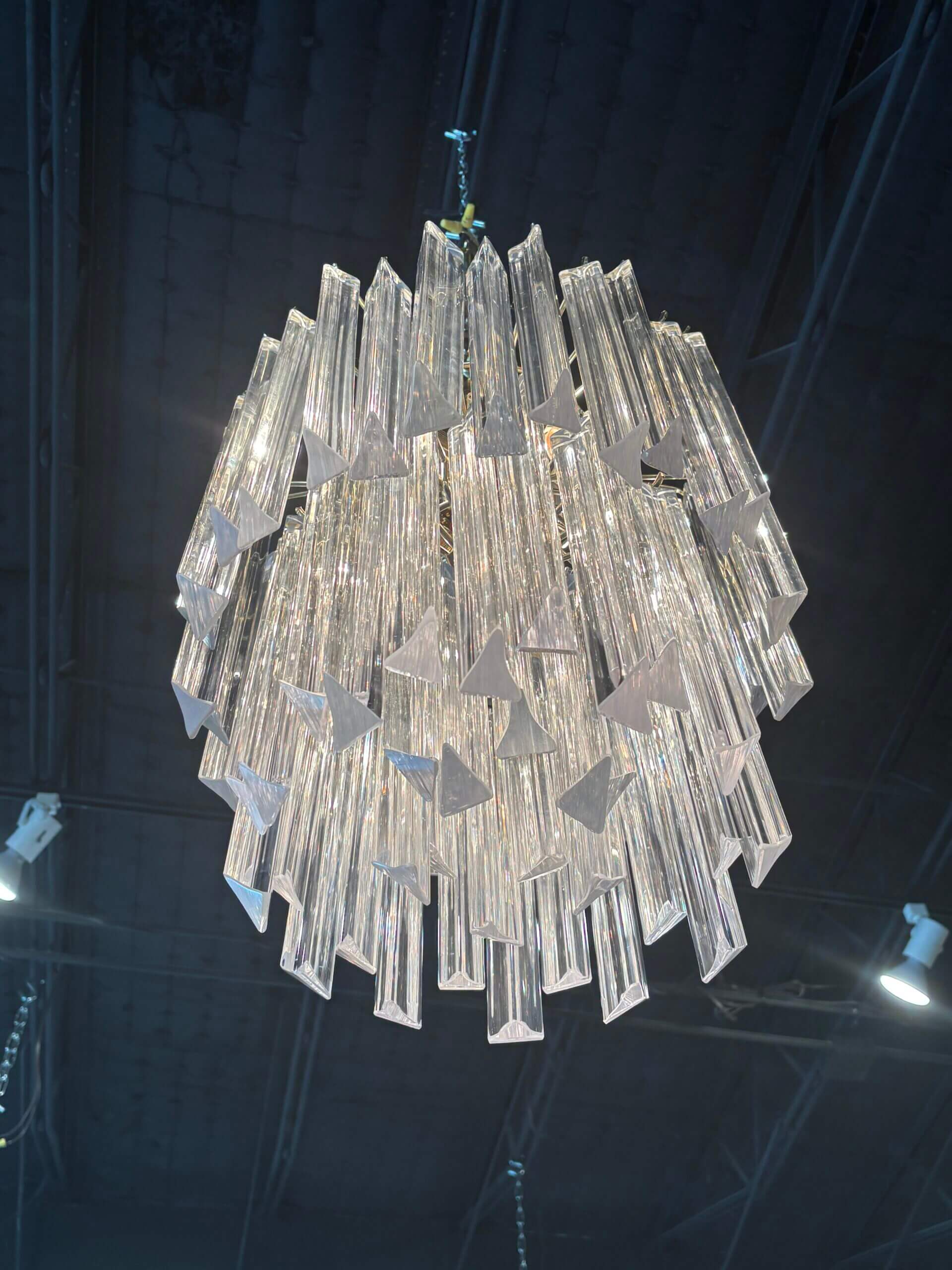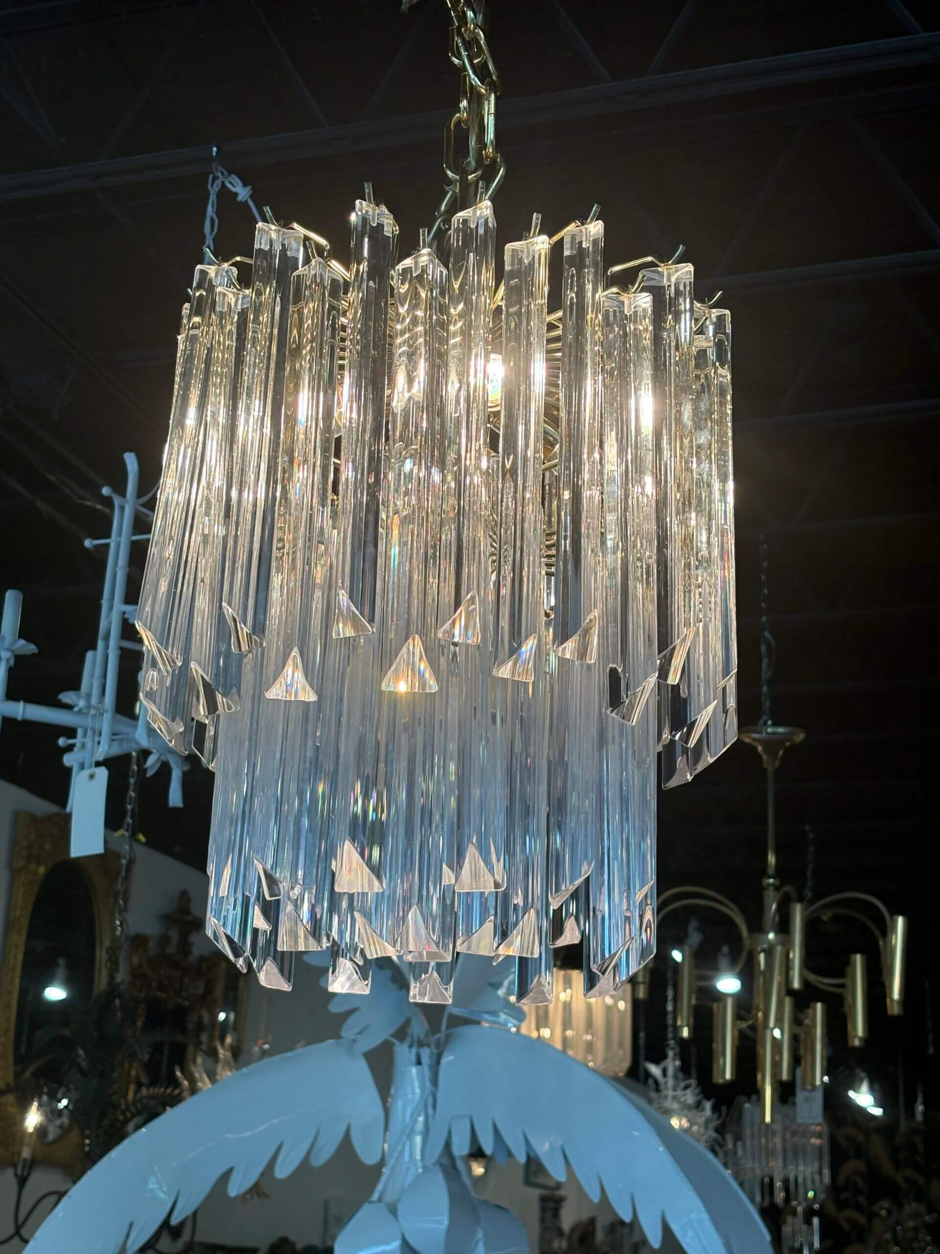 Beautiful vintage Murano Camer Trilobi Venini Chandelier. 66 glass pieces, no damage or chips to any glass. Brass chain with ceiling cap, original. Brass cage. 5 lights. Dimensions: 20 H x 16 W x 16 D. Size is of chandelier only. Wired for US.