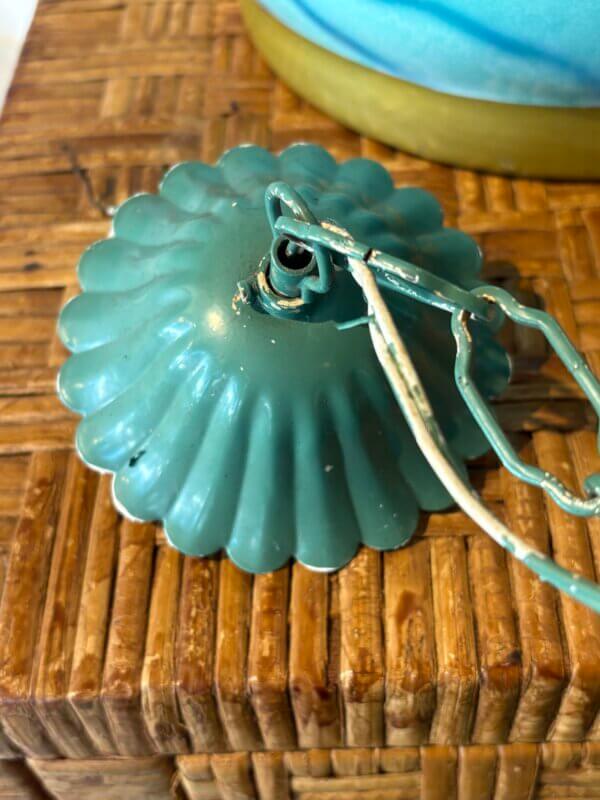 Vintage 1970s metal tole palm leaf leaves green chippy chandelier. Green paint has some areas that are chippy. Comes with original matching ceiling canopy. New candelabra sleeves. Tested, working order. Dimensions: 24 H x 21 D. Height is chandelier height only, not including chain.