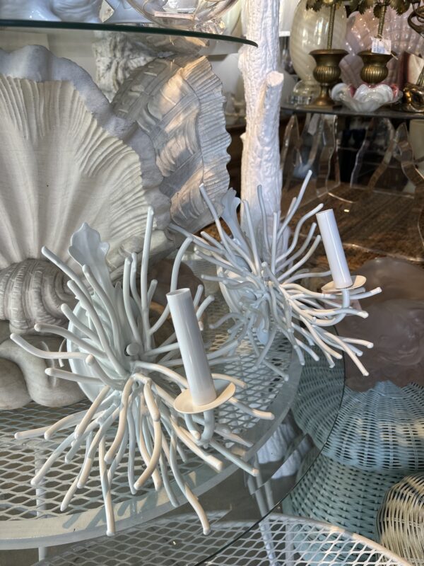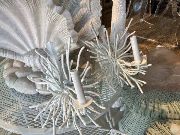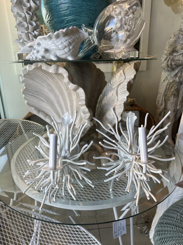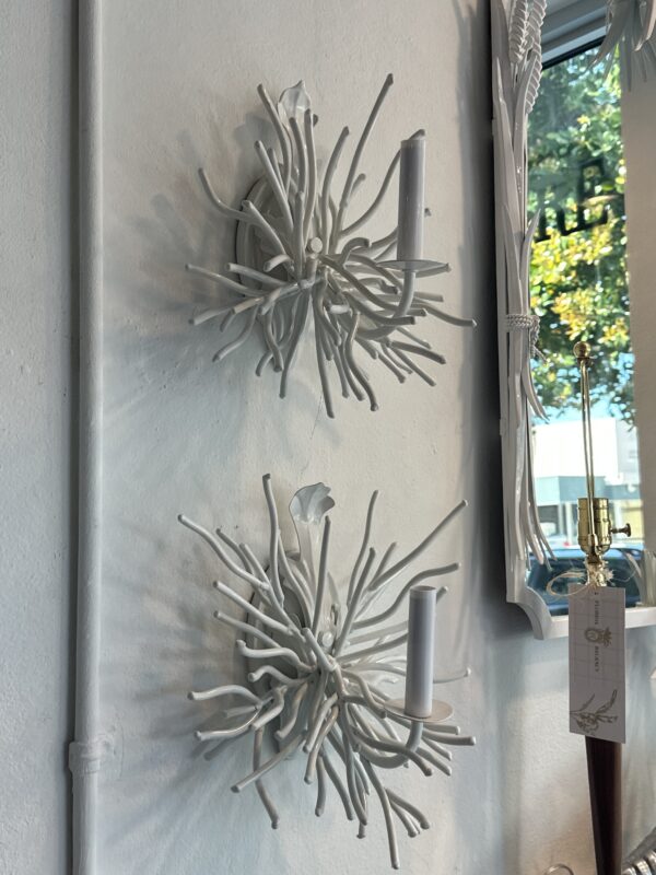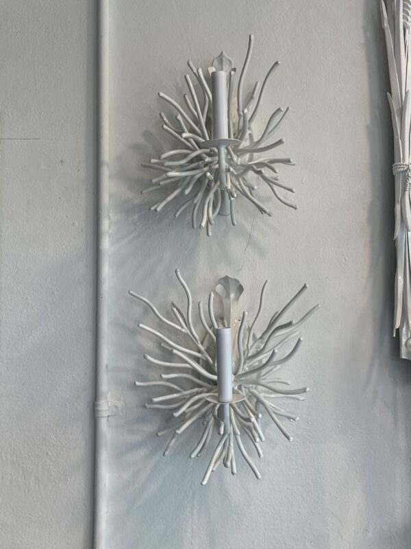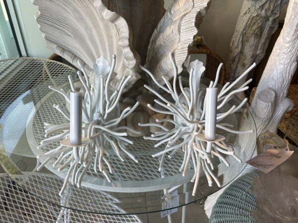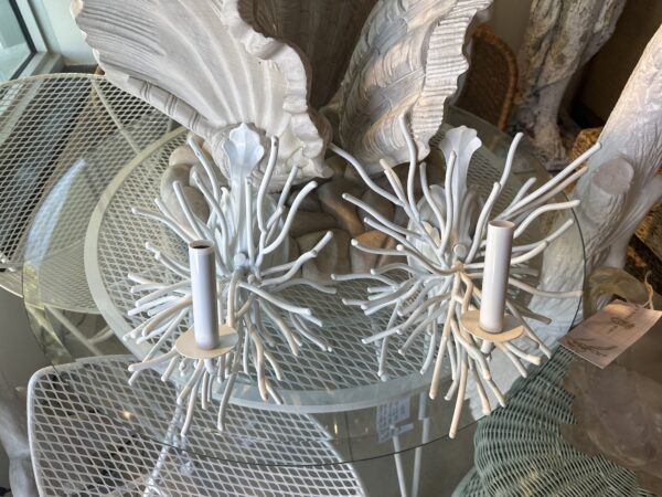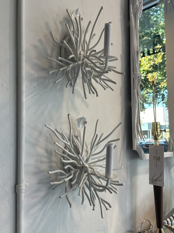 Vintage pair of metal tole coral wall light sconces. Newly powder-coated in a satin white. Newly wired with new hardware. Dimensions: 13 Hx 10.5 W x 8 D.