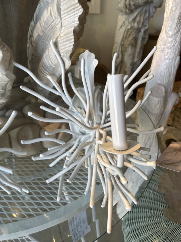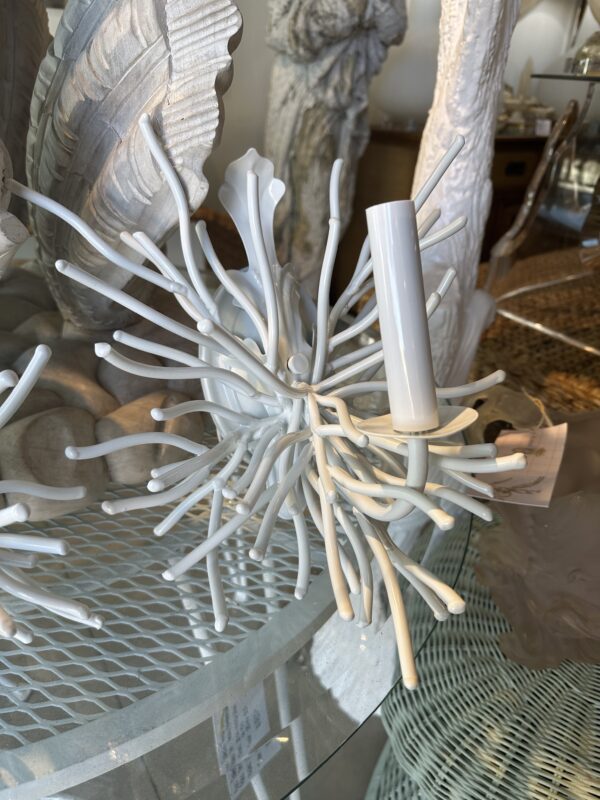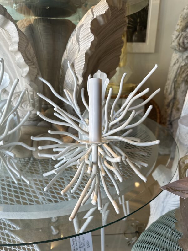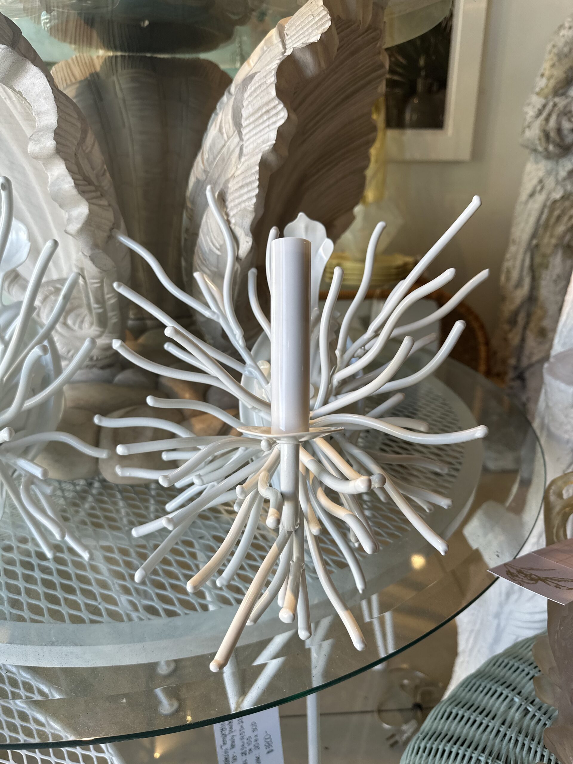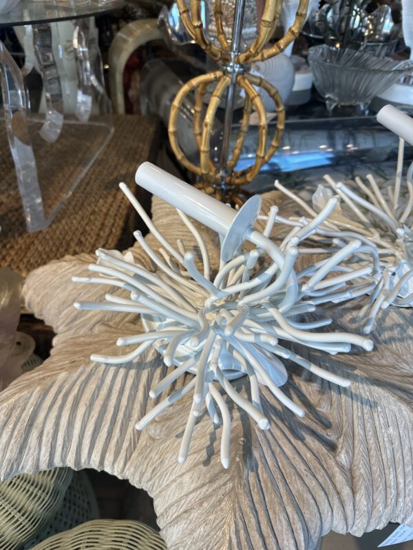 Vintage pair of metal tole coral wall light sconces. Newly powder-coated in a satin white. Newly wired with new hardware. Dimensions: 13 Hx 10.5 W x 8 D.