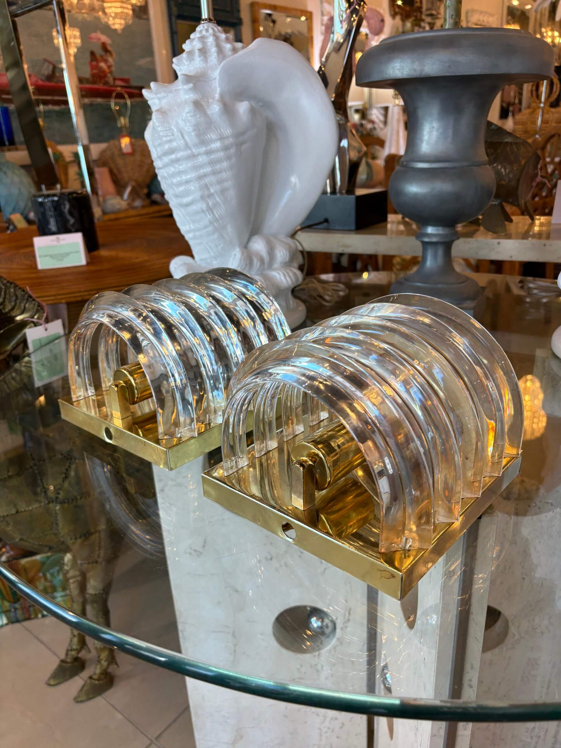 Vintage pair of Art Deco lucite ribbon & brass wall light sconces. Uplighting position of the bulb. May have slight patina to lucite and brass. Tested working order. Dimensions: 7 H x 7 W x 5.5 D.