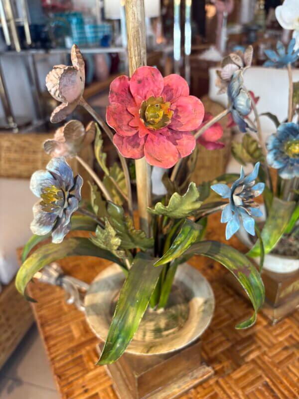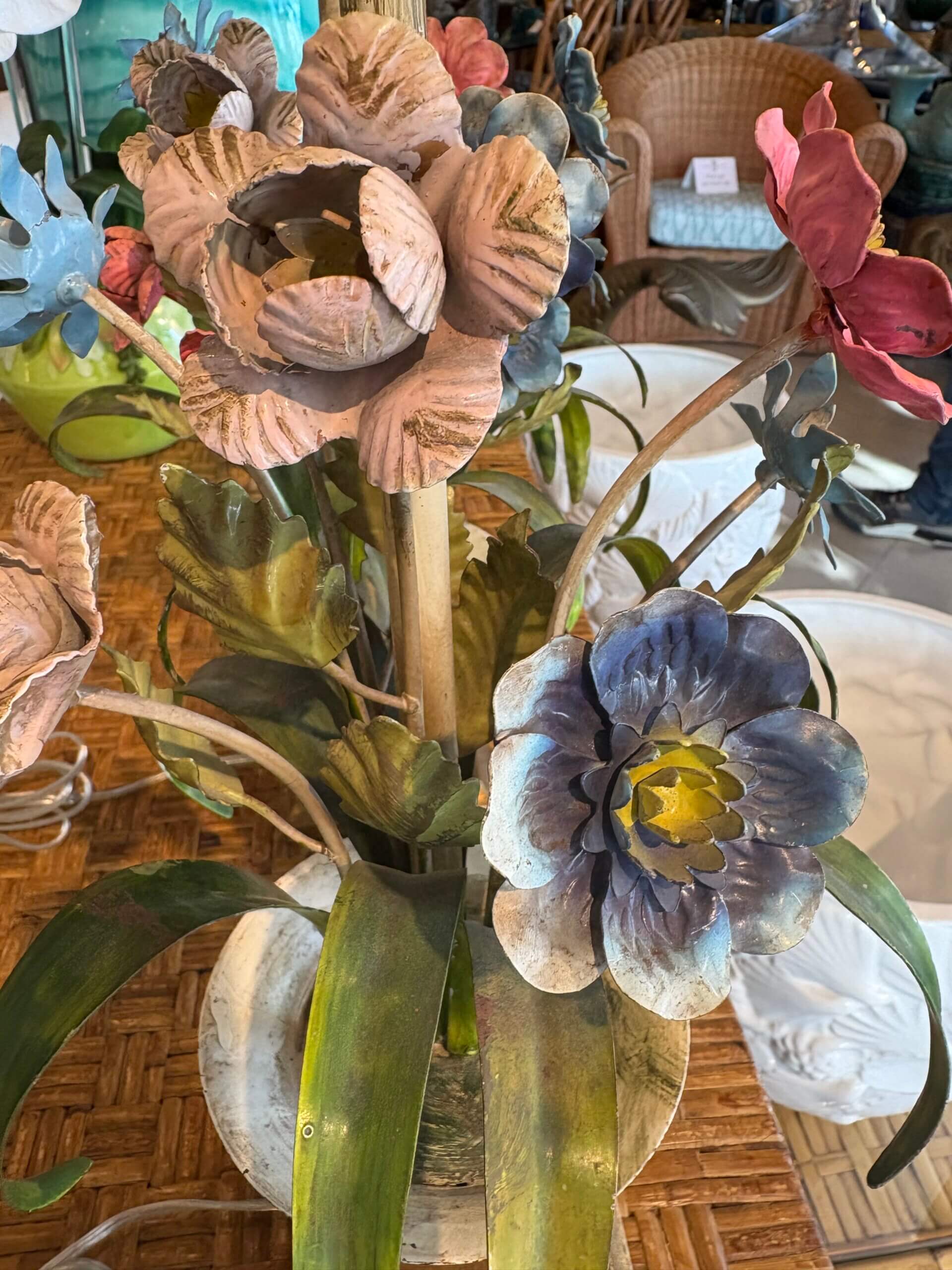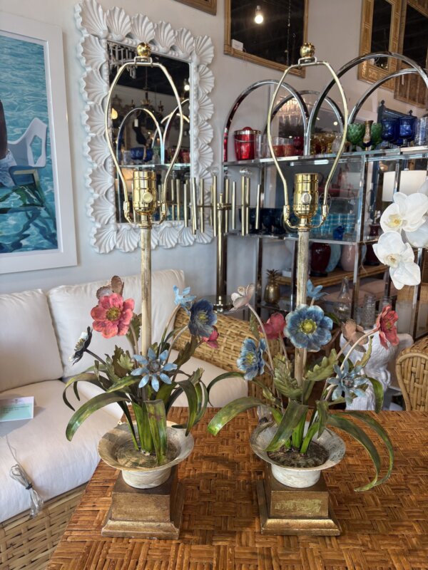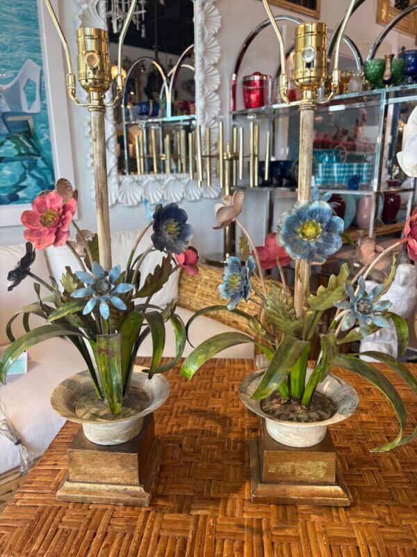 Vintage pair of 1950s Italian tole metal floral flowers table lamps with urn bases. Chippy original paint with patina. These have been newly wired, clear cords, 3 way sockets, all new brass hardware. Dimensions: 27 H to top of final, 21 H to top of lamp socket x 6 D.