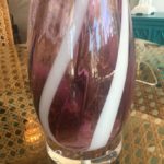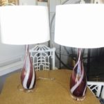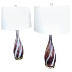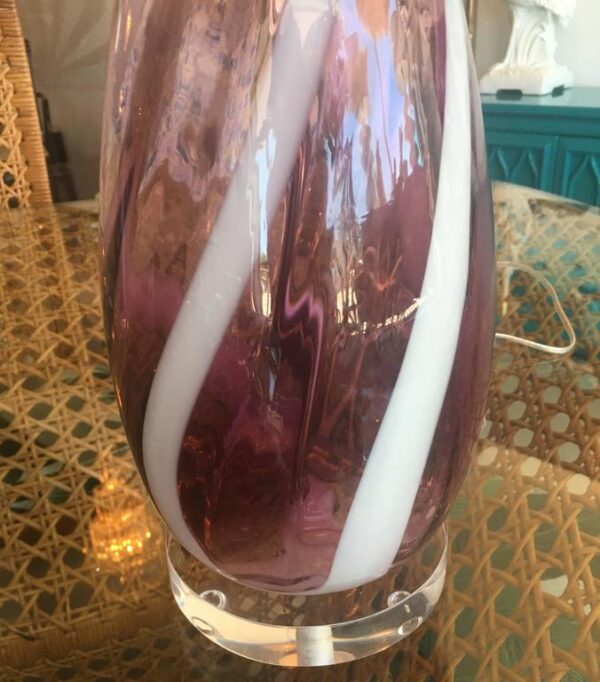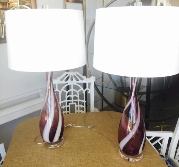 Amazing pair of vintage 1960s Italian Murano glass table lamps. Amethyst purple and white swirl color glass with Lucite base and matching Lucite chunky finials. These have been professionally rewired with new cords, chrome sockets and chrome harps.