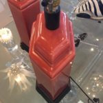 Lovely pair of vintage ceramic table lamps. Wonderful shade of orange, fantastic shape! Brass Asian, Hollywood Regency finial. Lampshades not included. No chips or breaks.