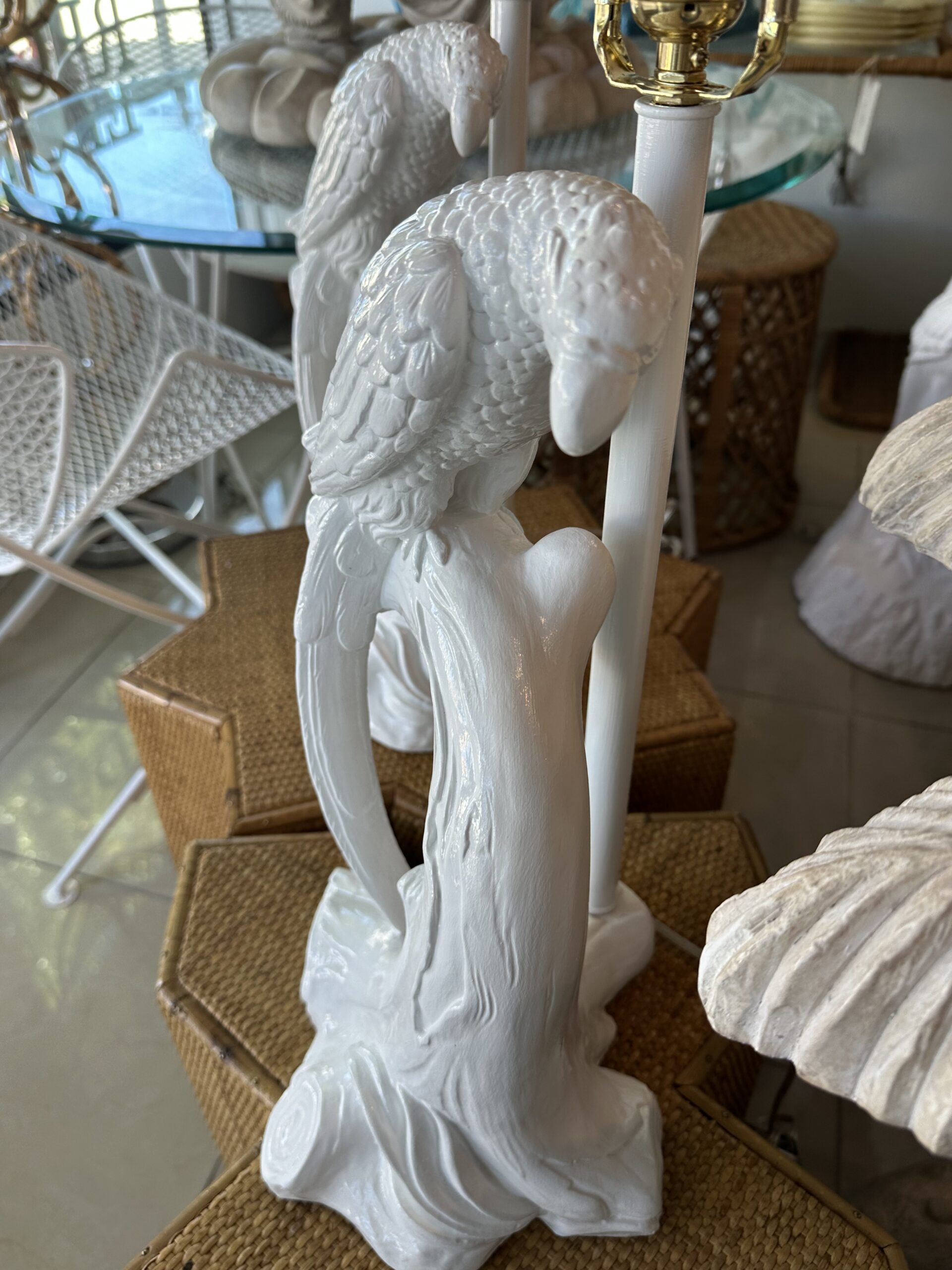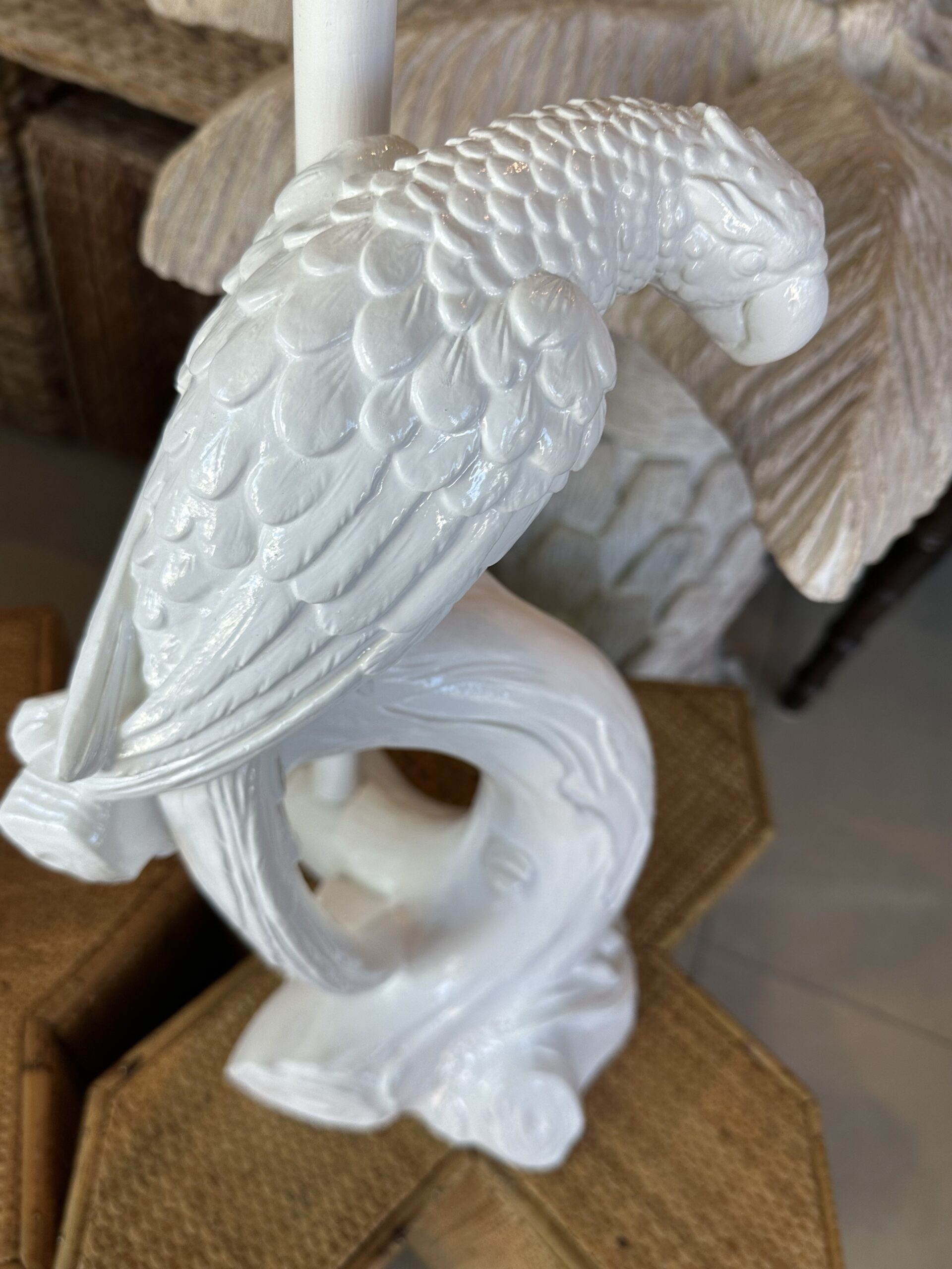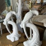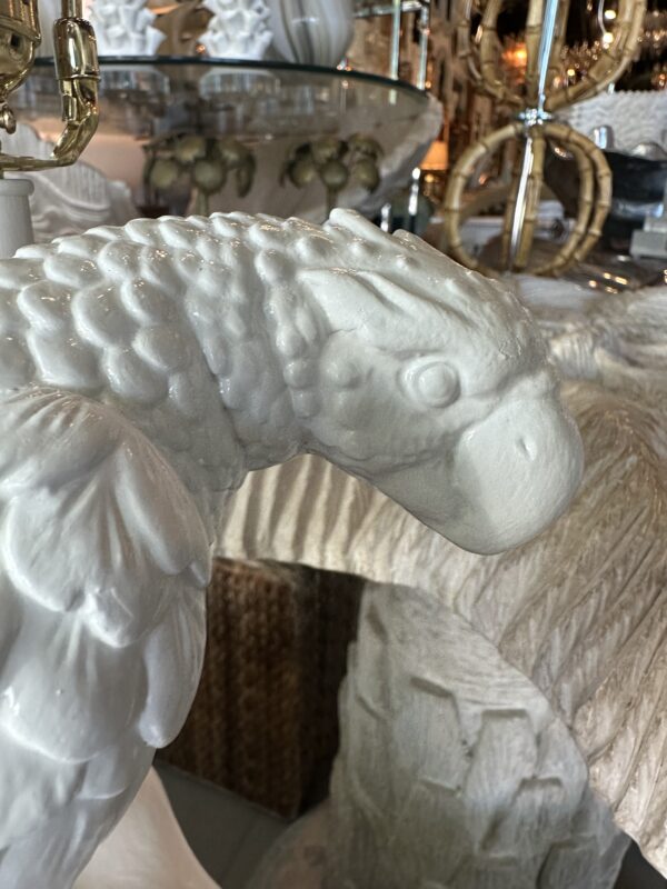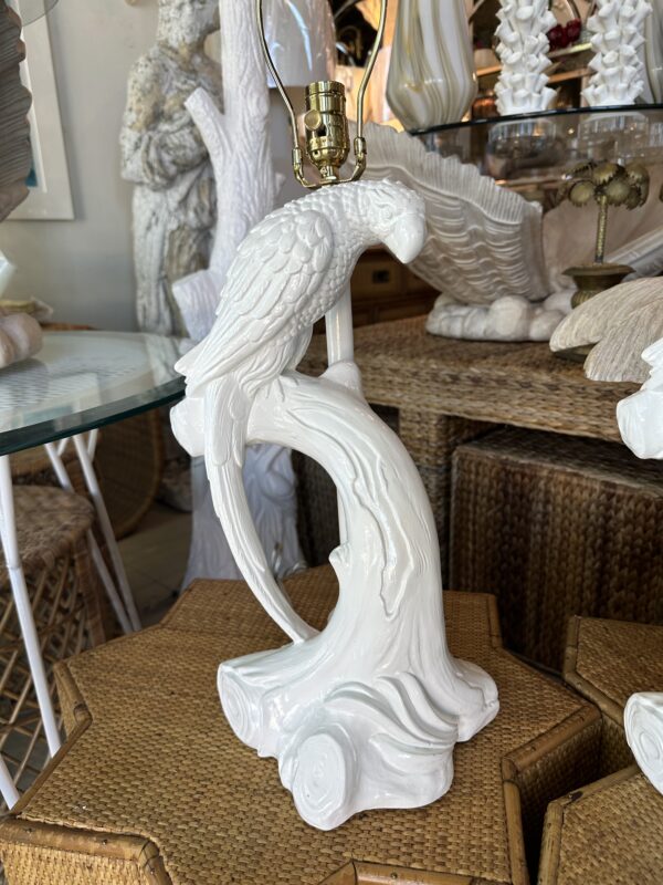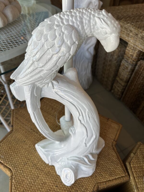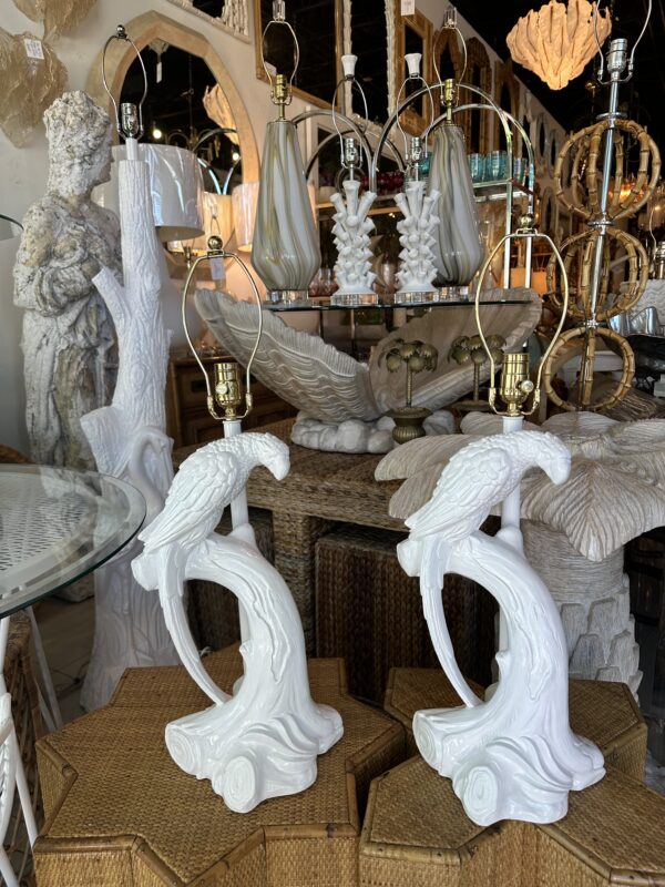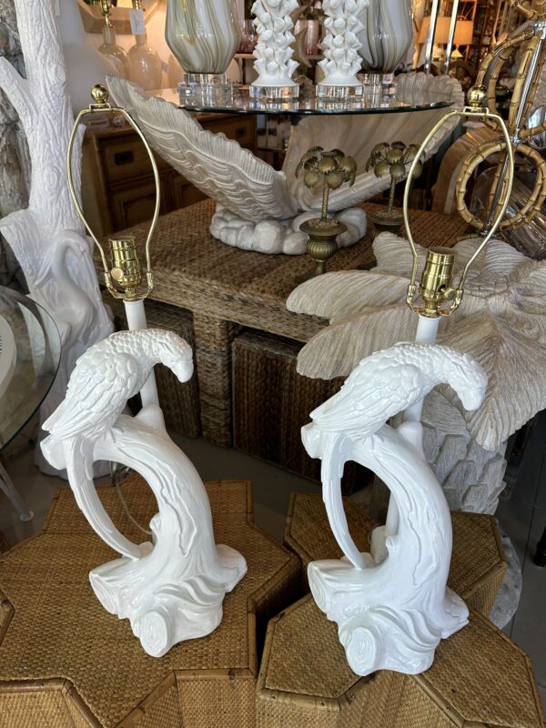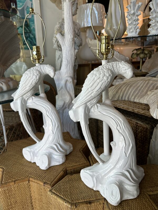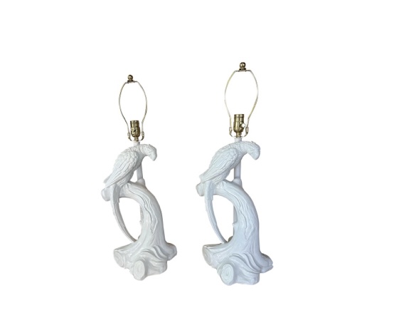 Beautiful pair of vintage plaster parrot bird table lamps that have been lacquered in a fresh white. Newly wired, new 3 way brass sockets & hardware. No chips or breaks. Dimensions: 25.5 H (to top of finial) x 19 H (to top of socket) x 10 D x 9.5 W.