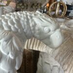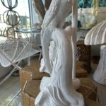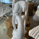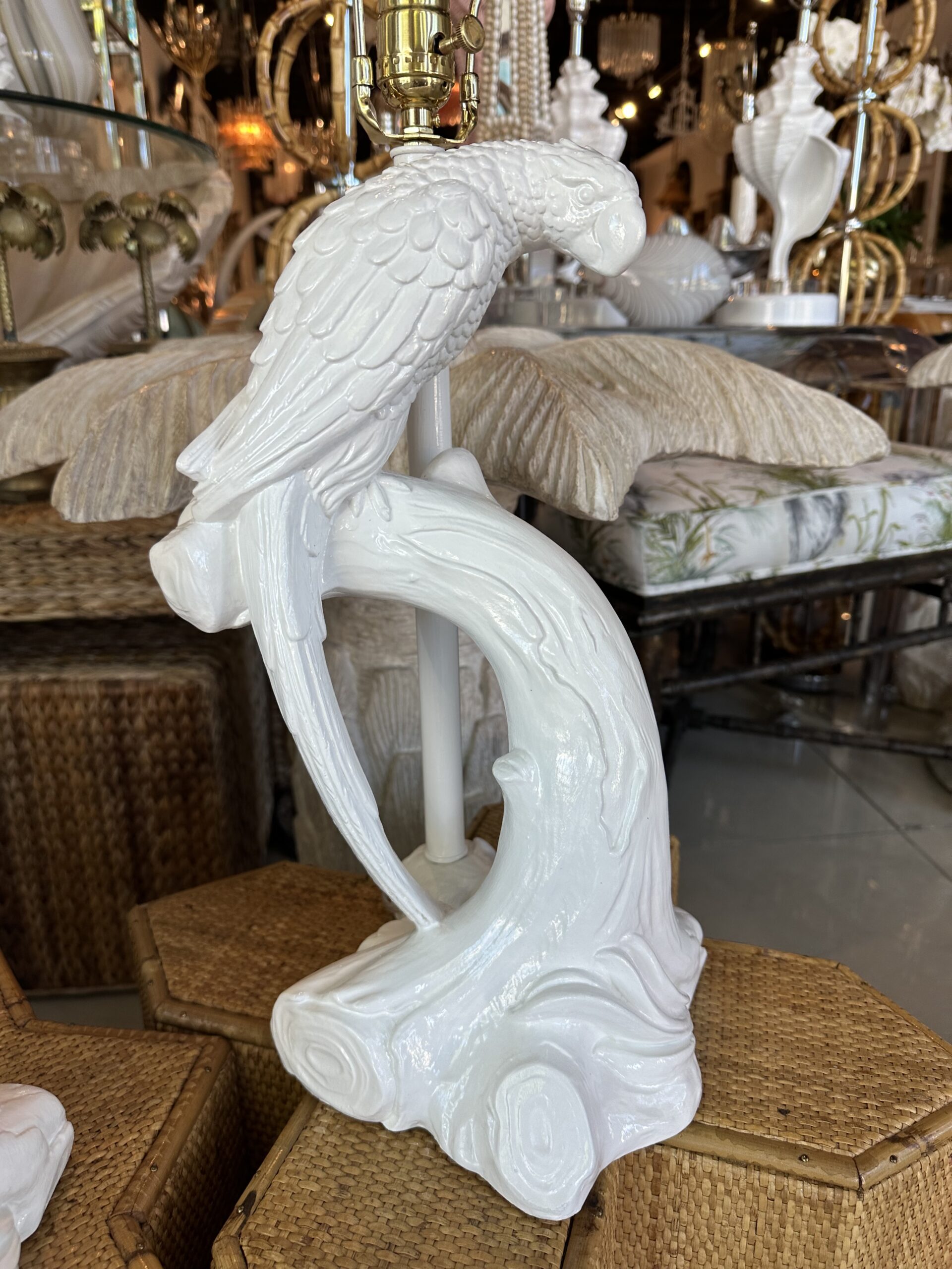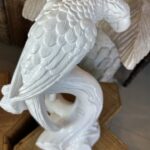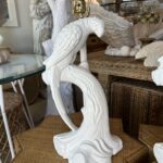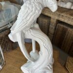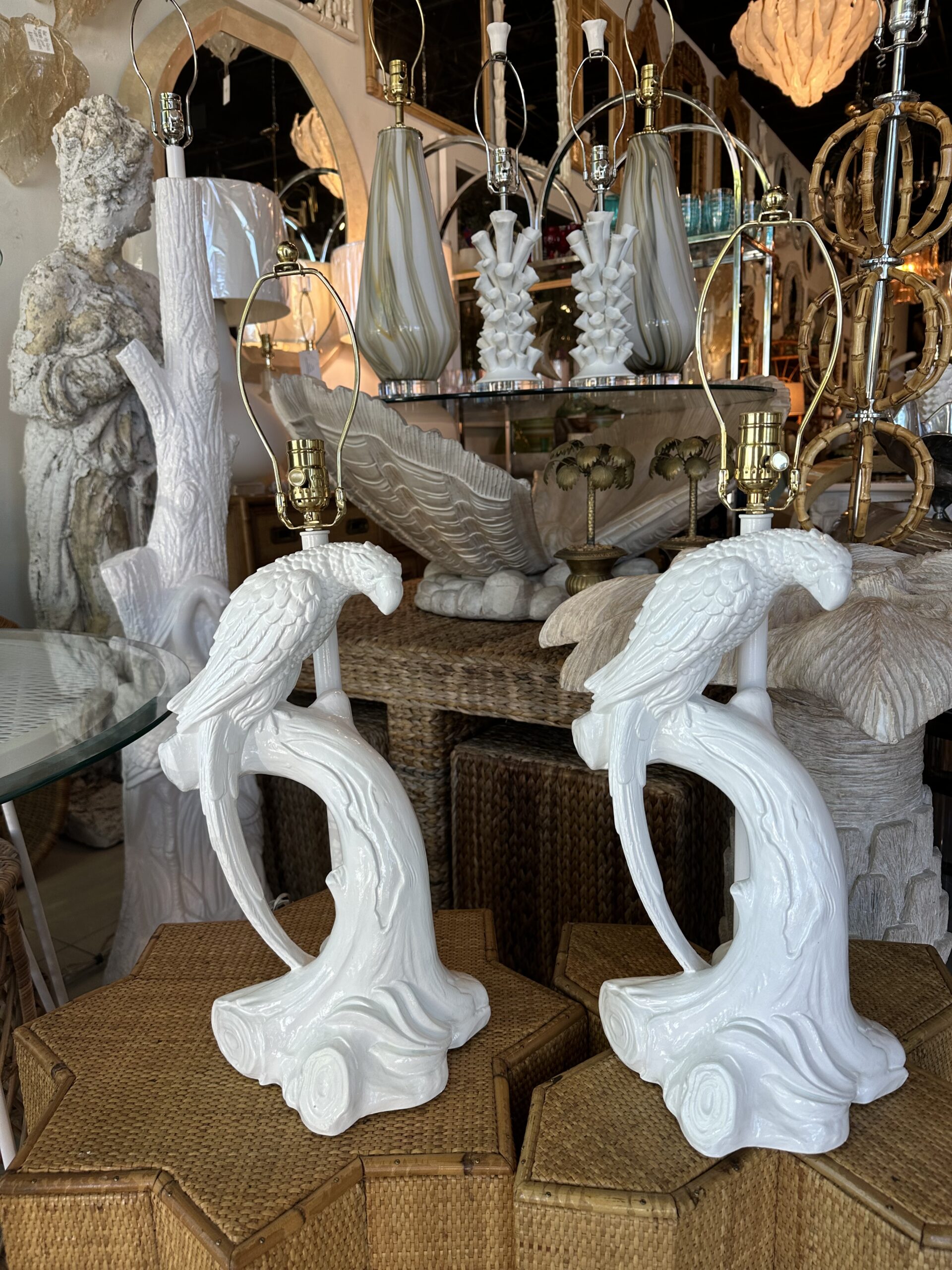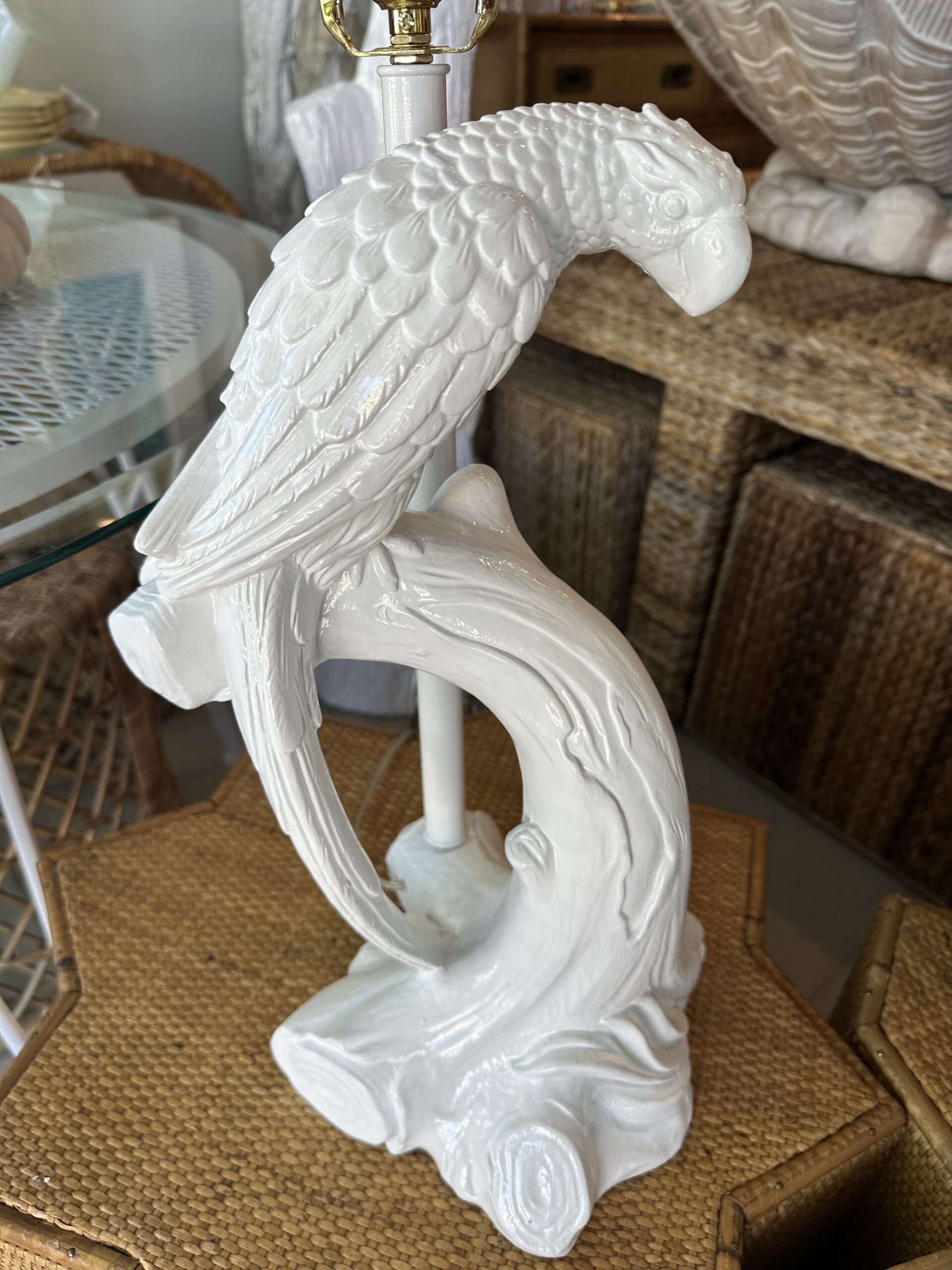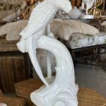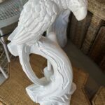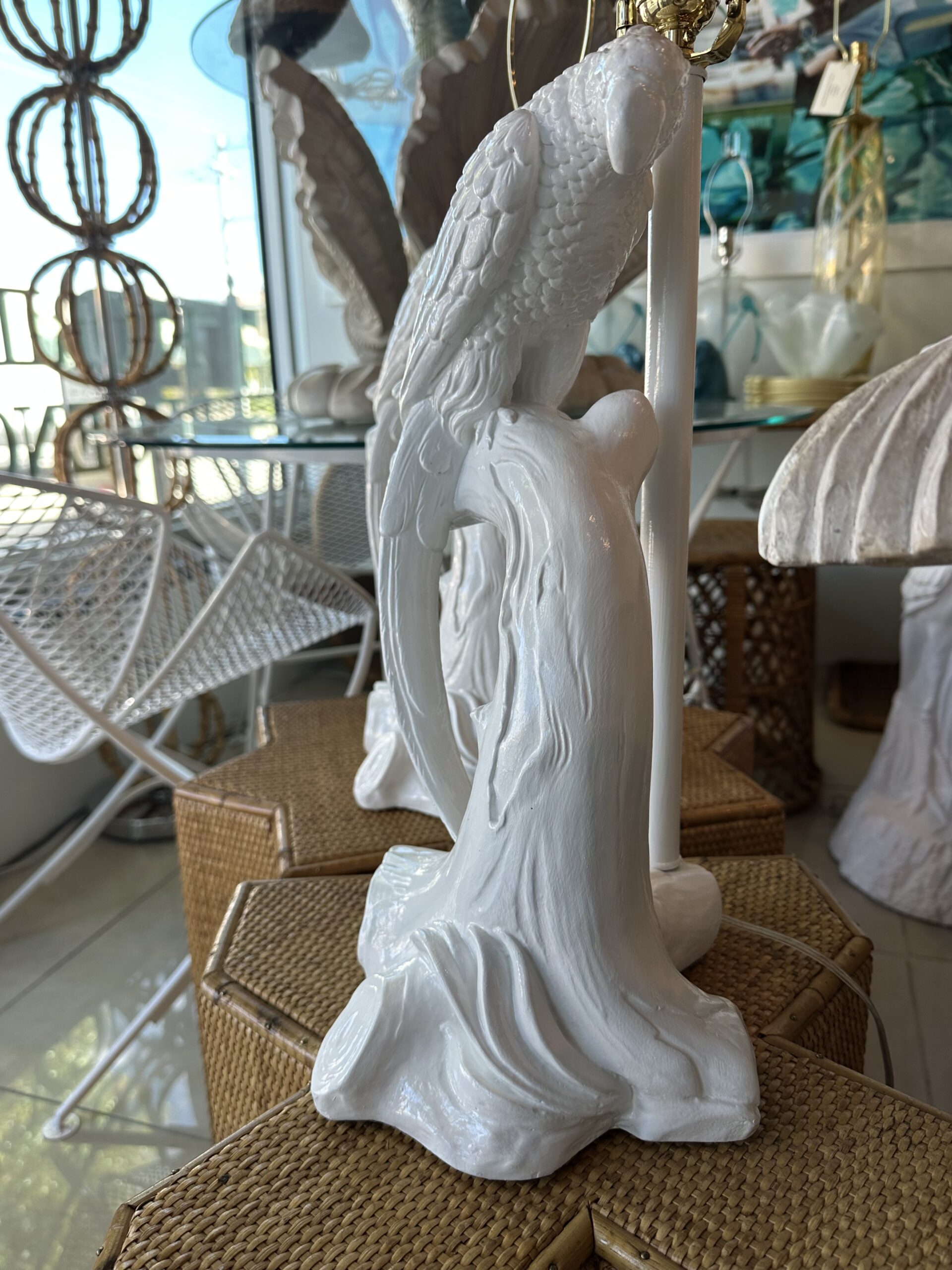 Beautiful pair of vintage plaster parrot bird table lamps that have been lacquered in a fresh white. Newly wired, new 3 way brass sockets & hardware. No chips or breaks. Dimensions: 25.5 H (to top of finial) x 19 H (to top of socket) x 10 D x 9.5 W.
