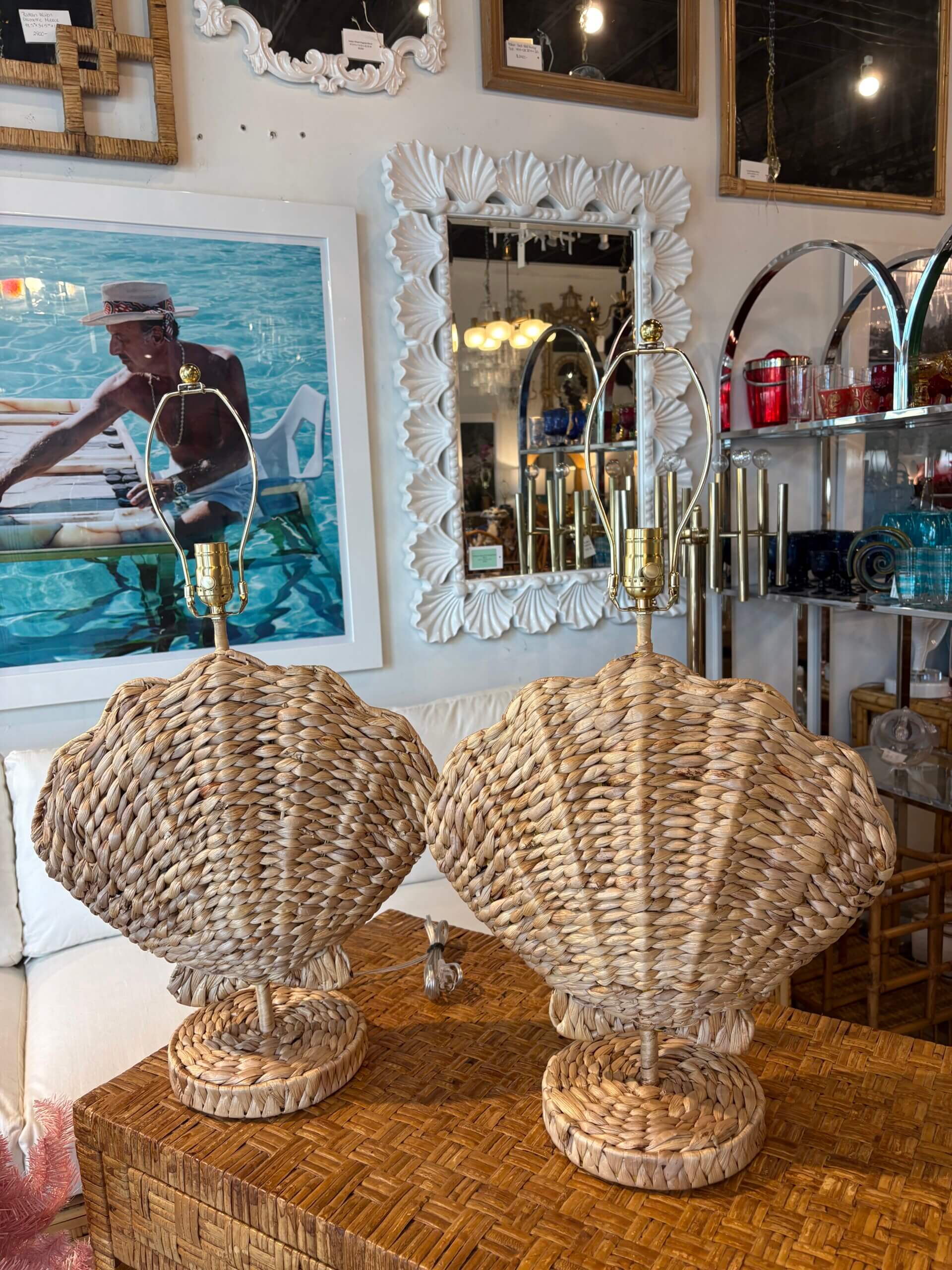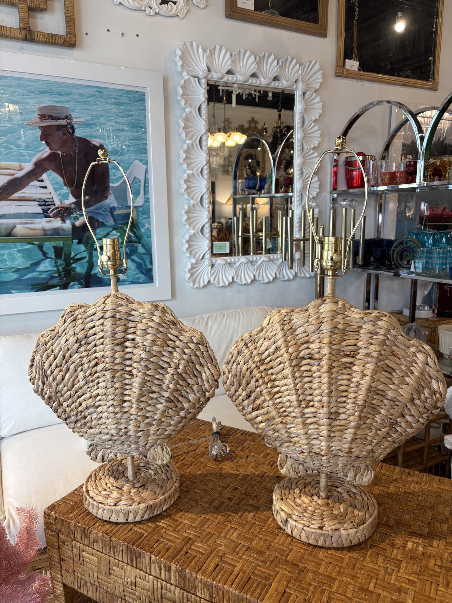 Lovely pair of woven grass scalloped clam shell seashell Palm Beach table lamps. These have been newly wired with all new brass hardware, 3 way sockets, clear cords. No damage. Dimensions: 28 H, to top of finial, 21 H to top of socket x 17 W x 8 D.
