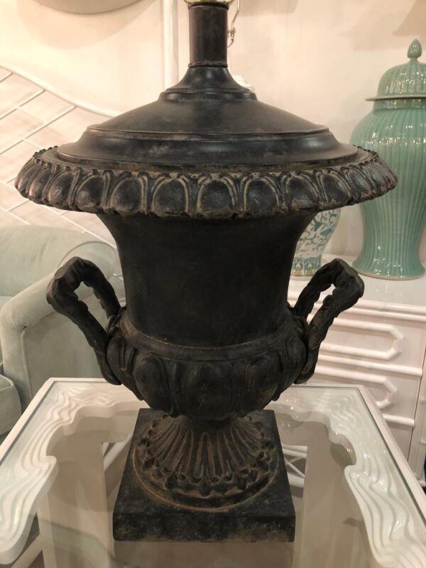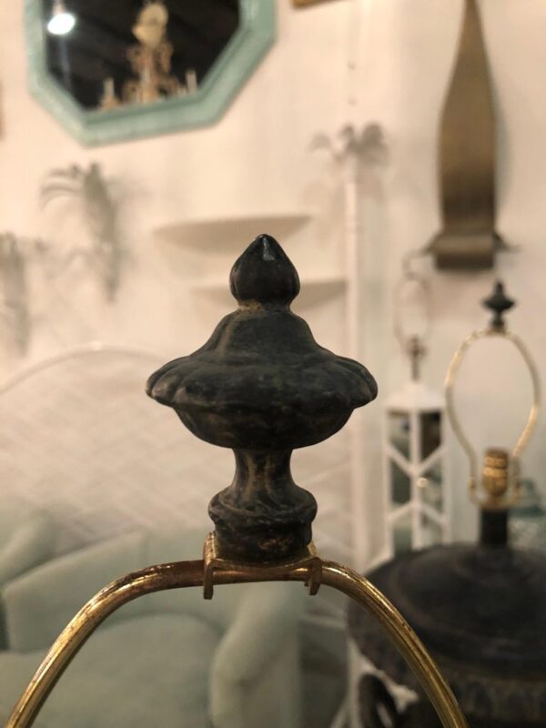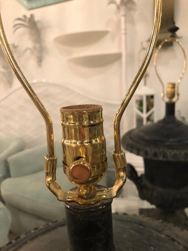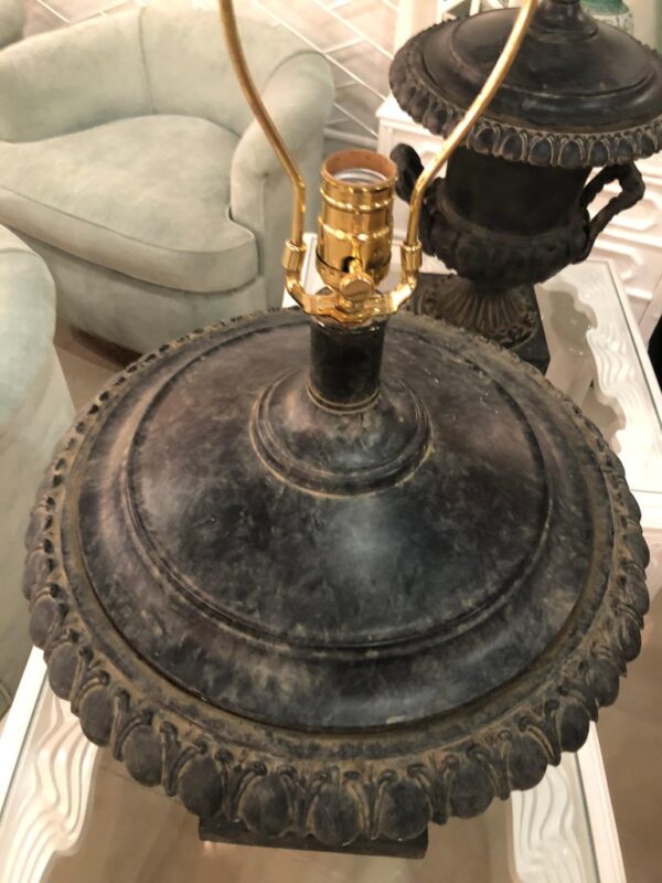 Lovely pair of vintage French black oversized urn table lamps. These have been newly wired and have all new brass hardware. Includes original matching finials.