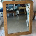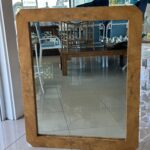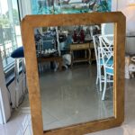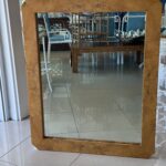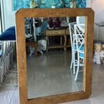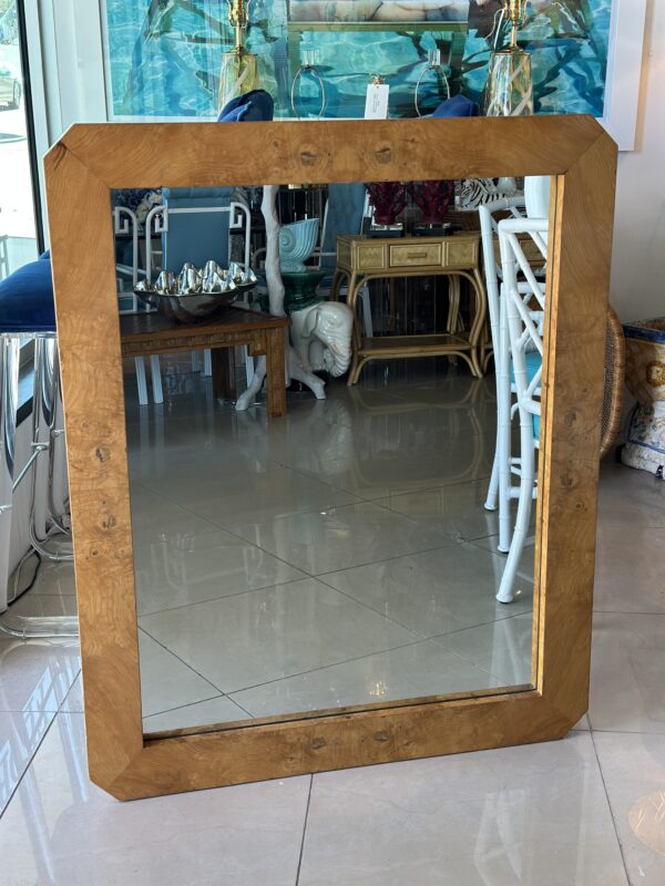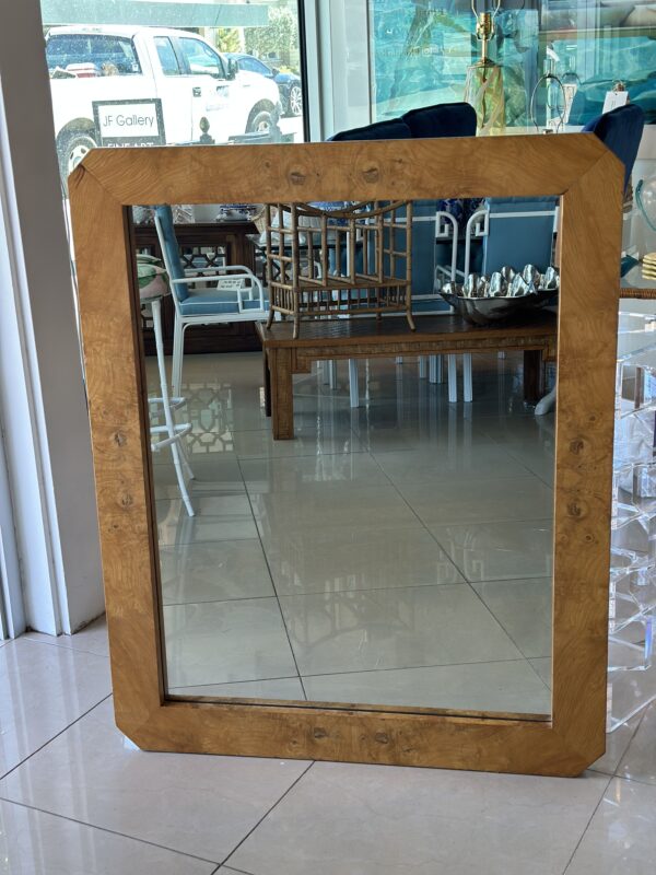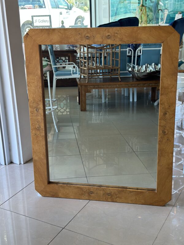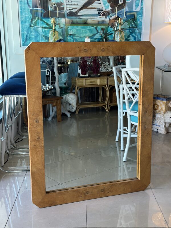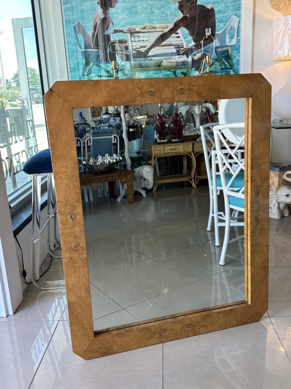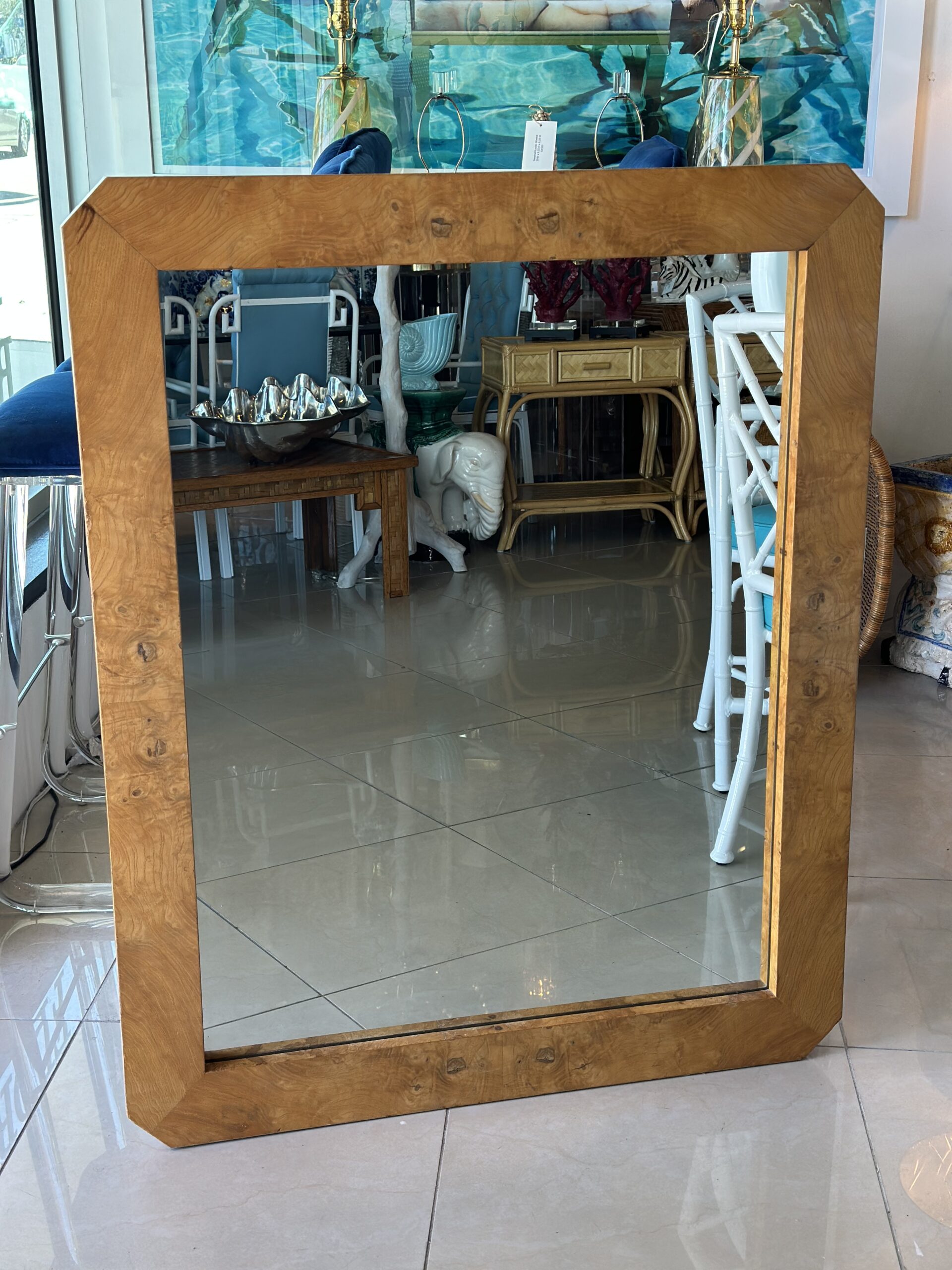 Vintage burl wood burl wood Milo Baughman wall mirror. Comes ready to hang. Dimensions: 43.5 H x 35.5 W x 1.5 D.