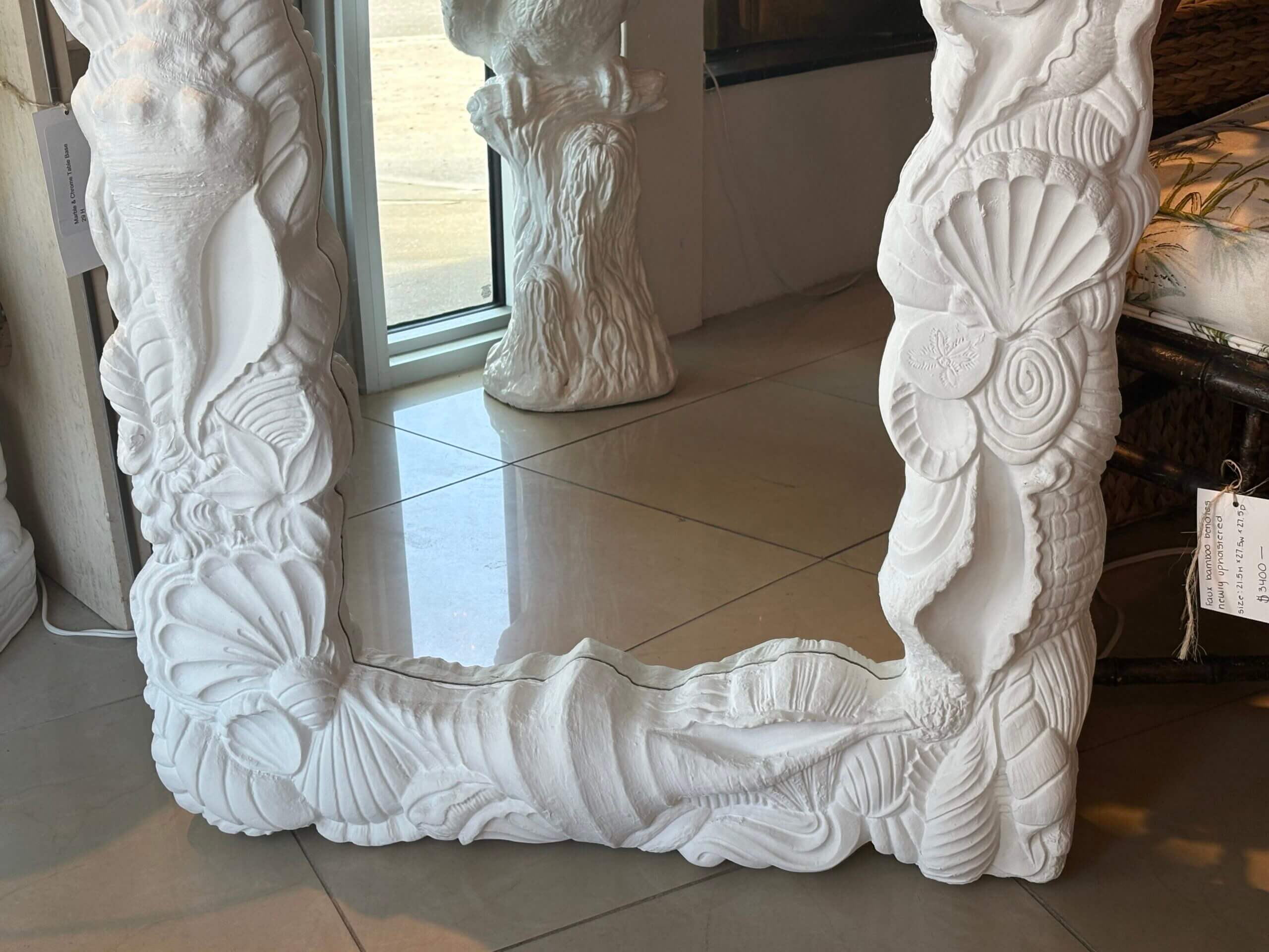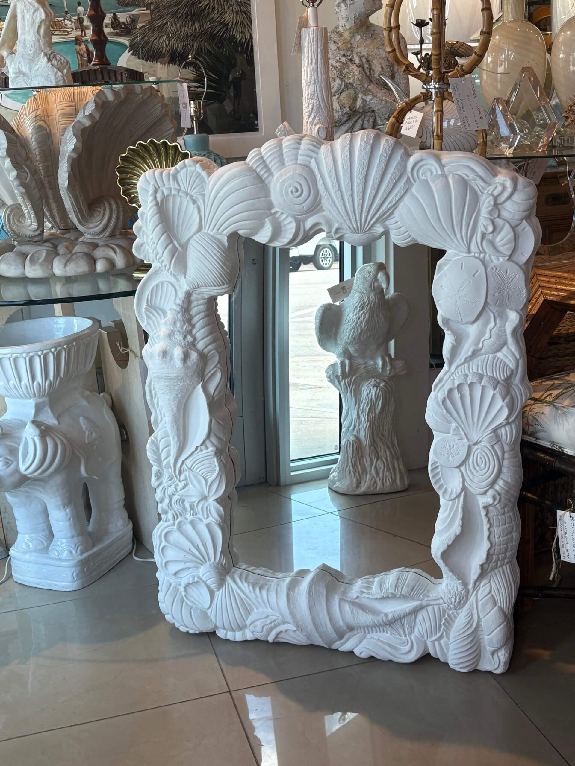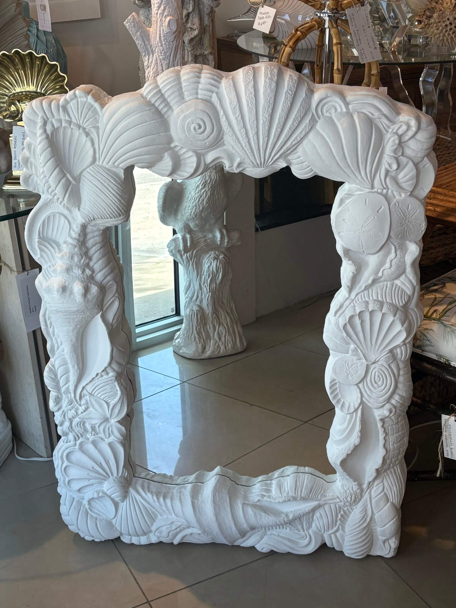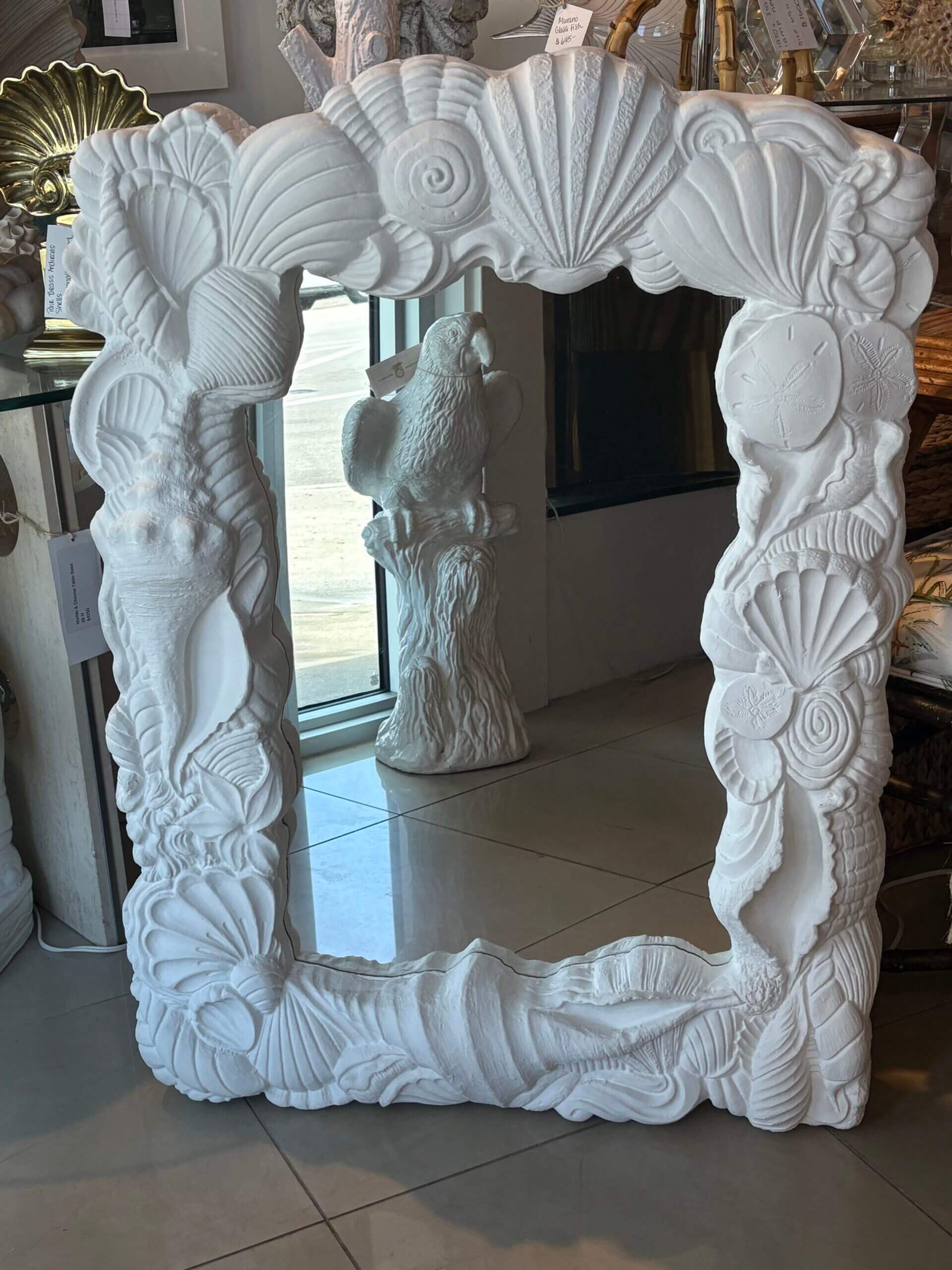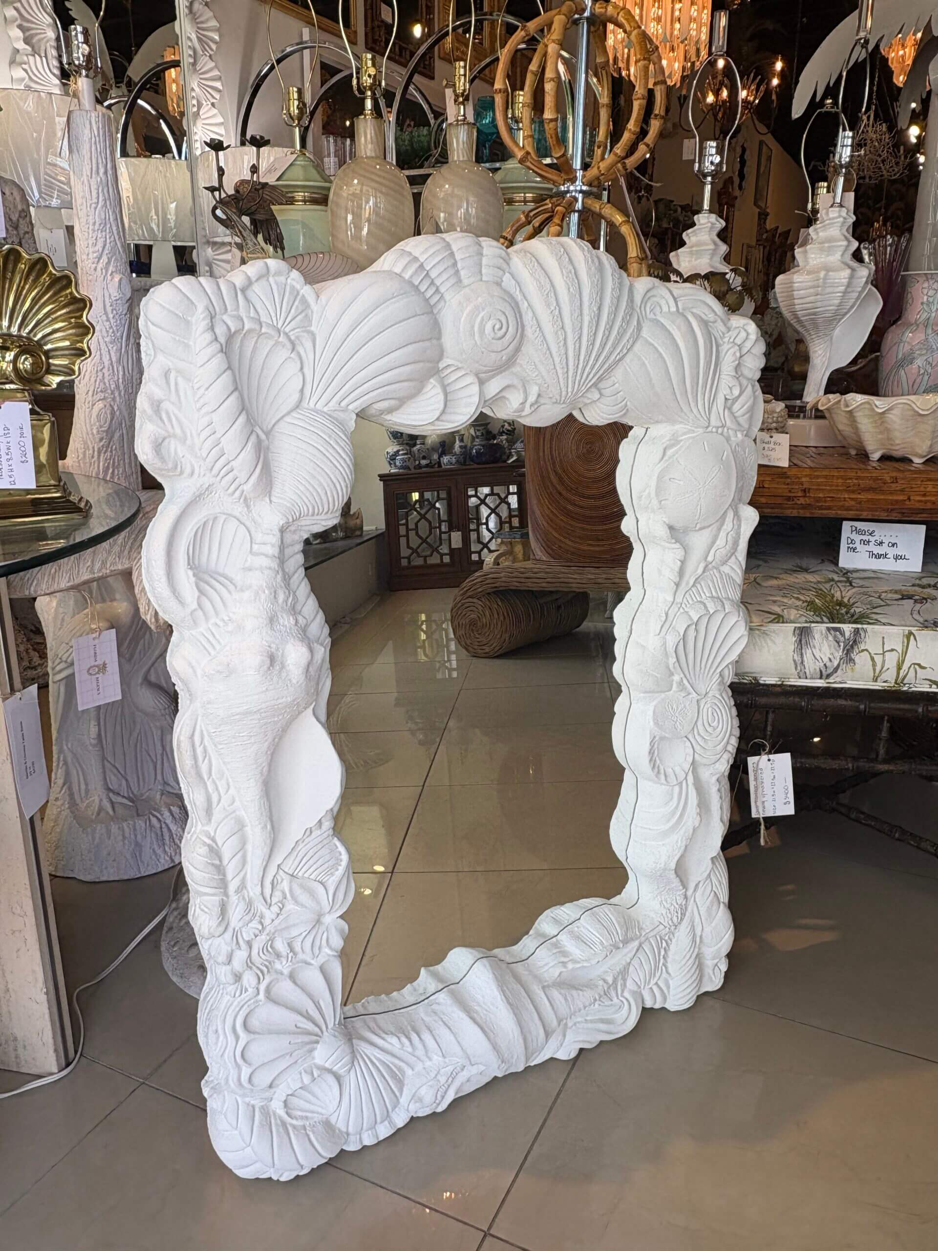 Lovely vintage plaster shell seashell Palm Beach wall mirror. Newly finished in a flat plaster white. Comes ready to hang. Original mirror may have minor scratches. Multi dimensional. Dimensions: 42 H x 31.5 W x 4.5 D.