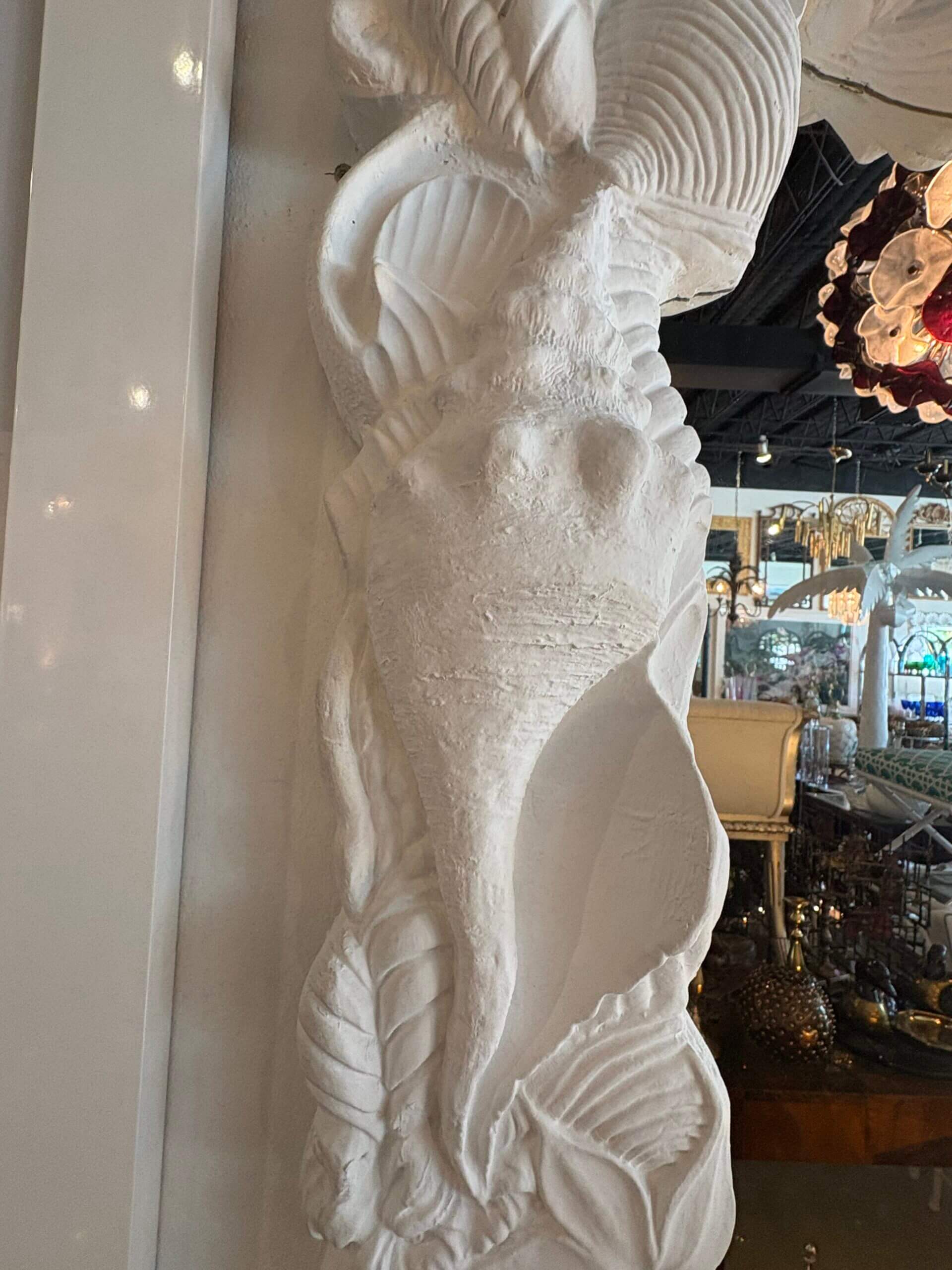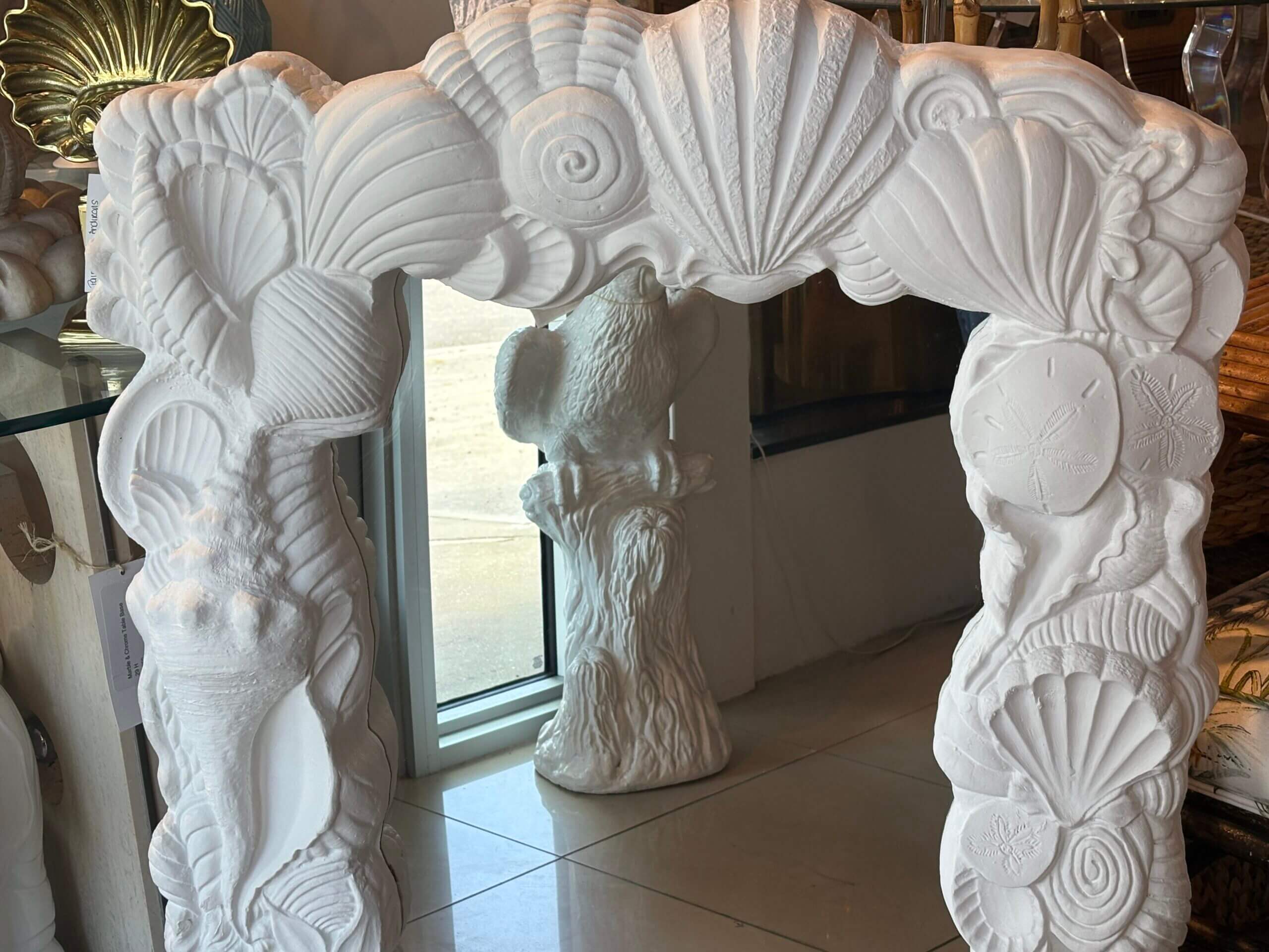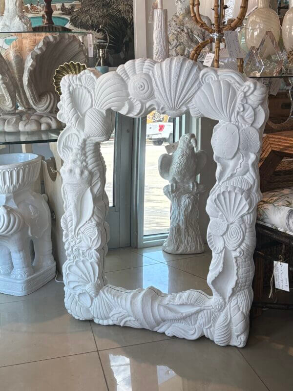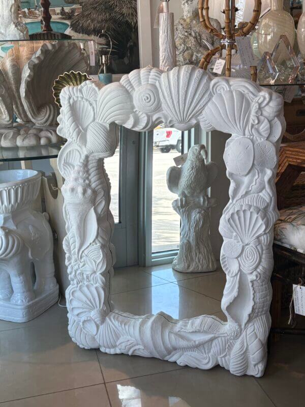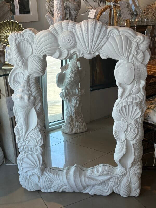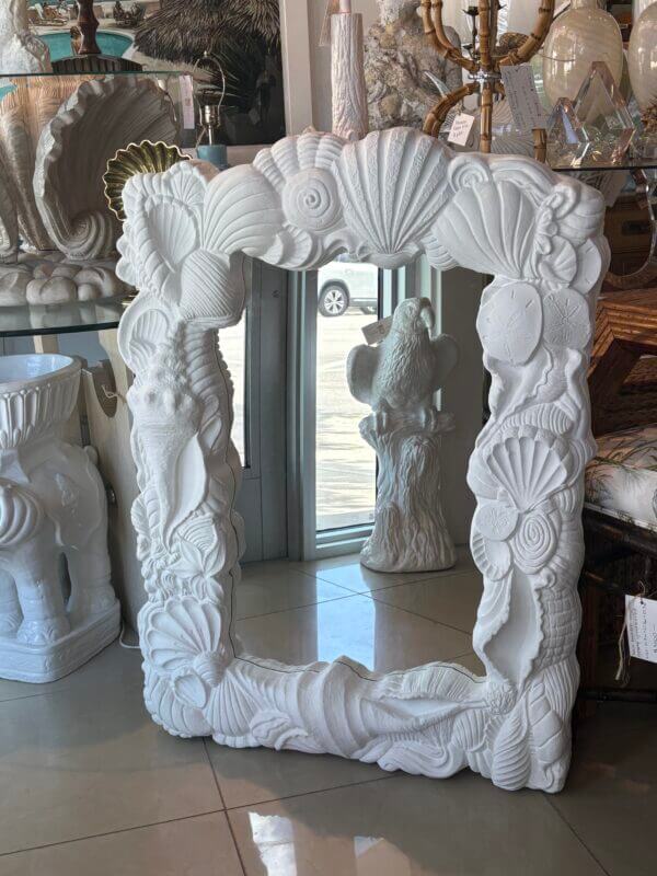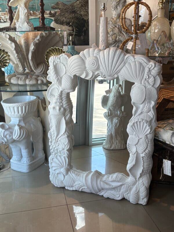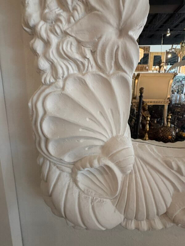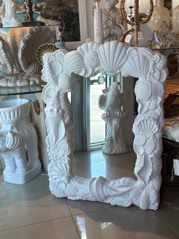 Lovely vintage plaster shell seashell Palm Beach wall mirror. Newly finished in a flat plaster white. Comes ready to hang. Original mirror may have minor scratches. Multi dimensional. Dimensions: 42 H x 31.5 W x 4.5 D.