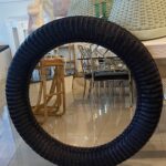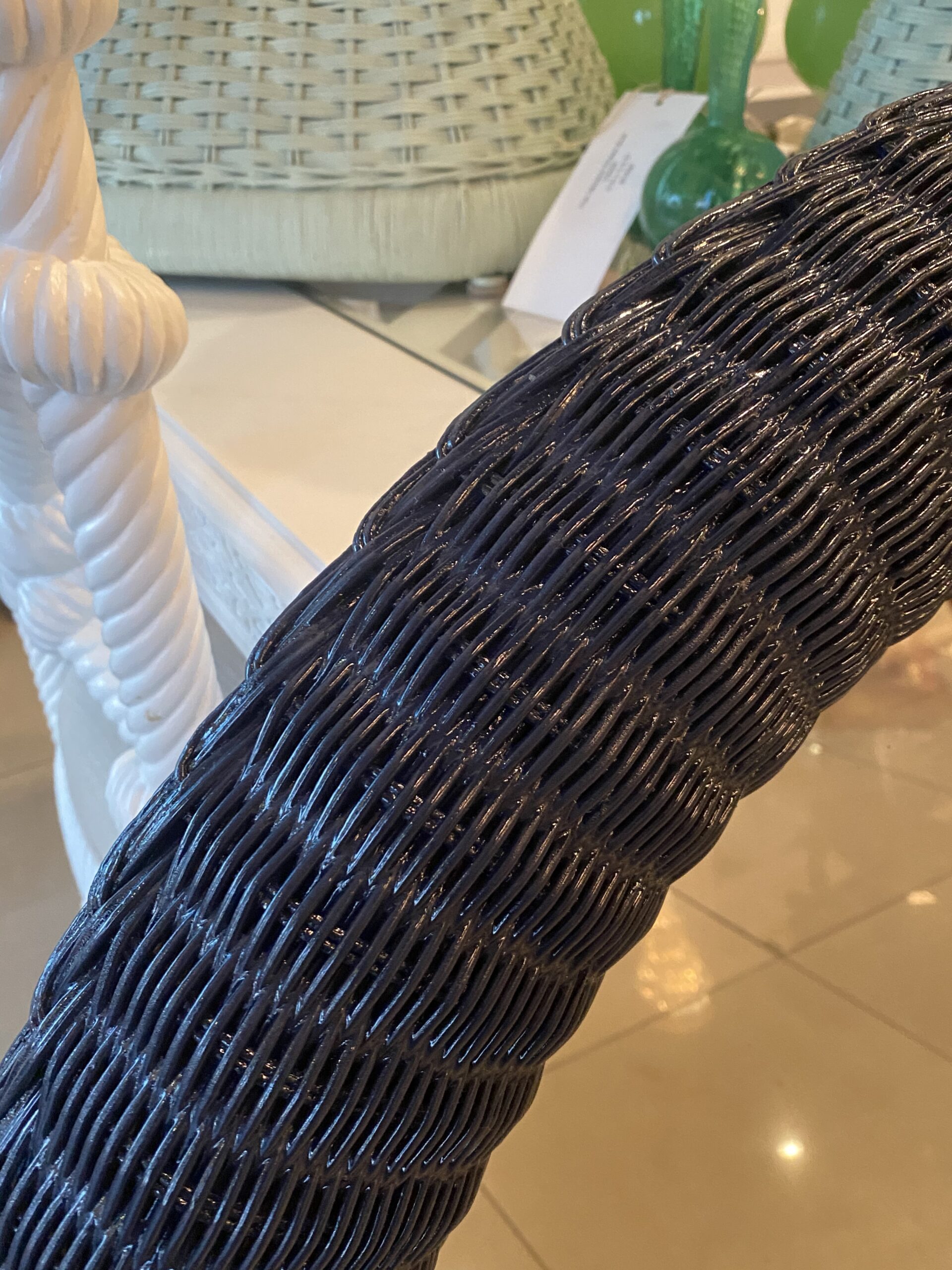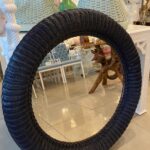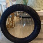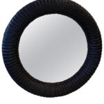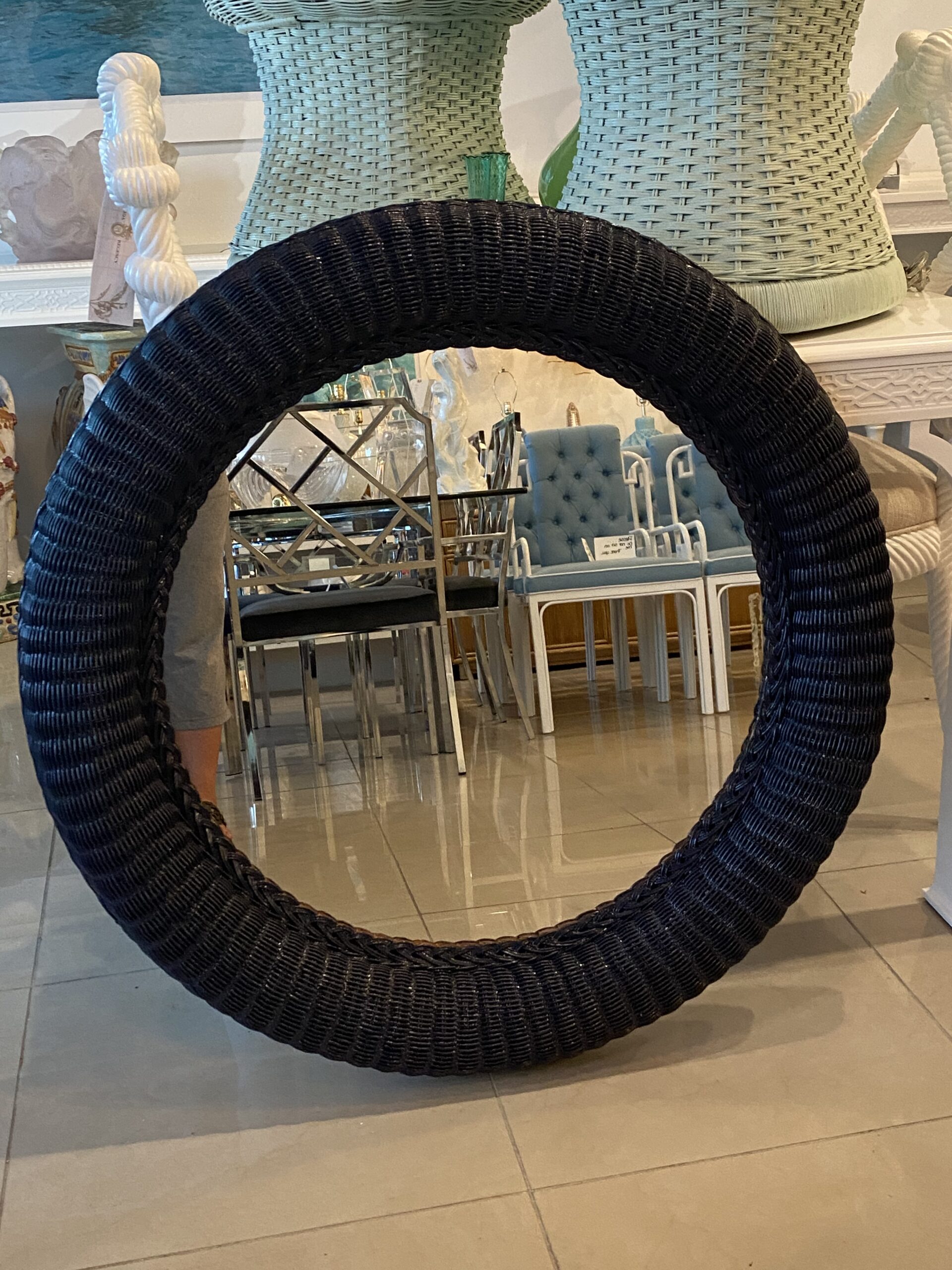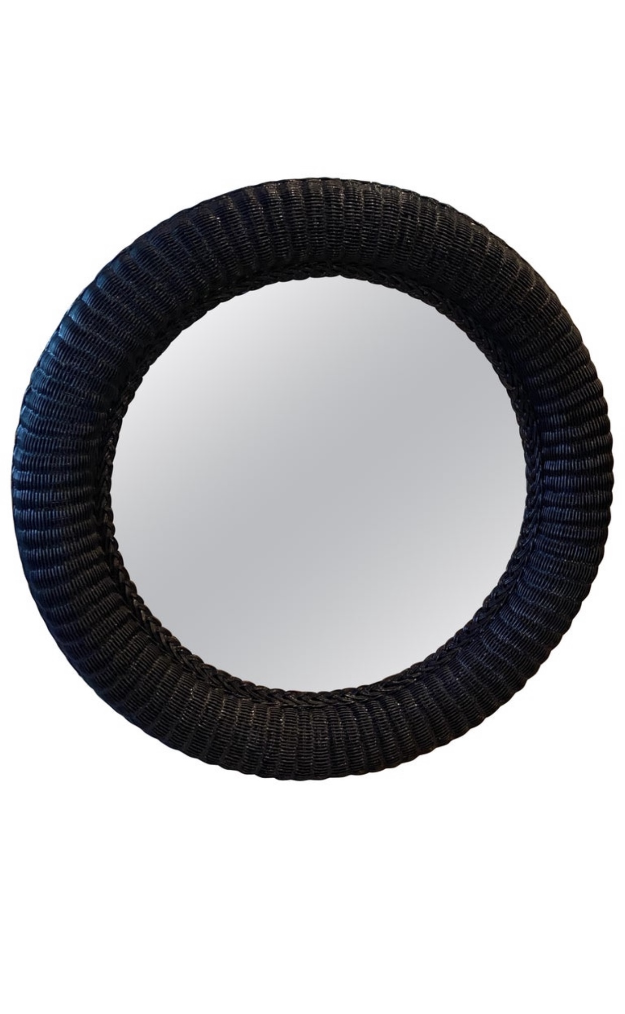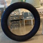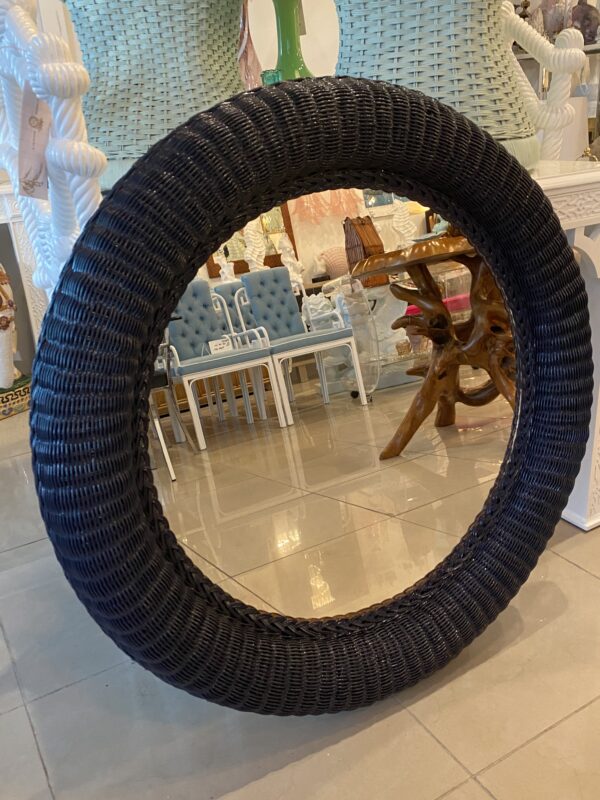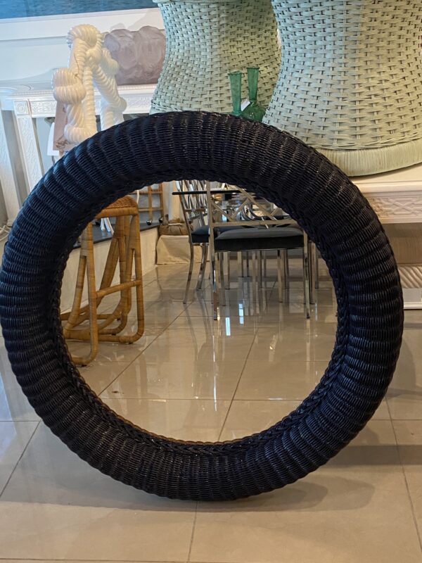 Lovely vintage braided wicker round wall mirror. Newly lacquered in a navy blue.