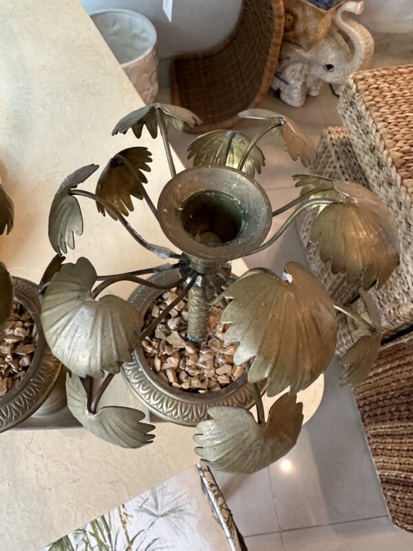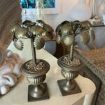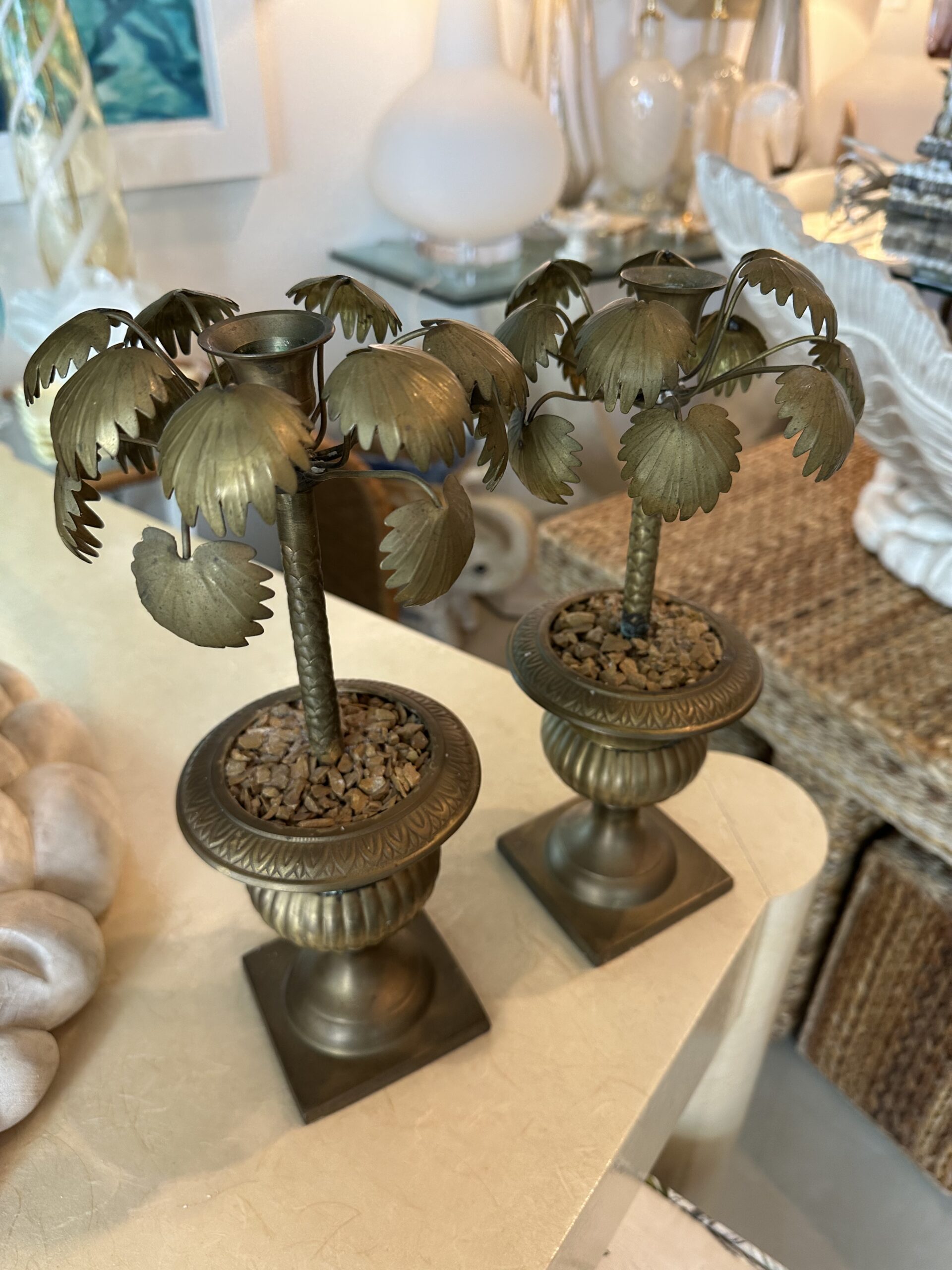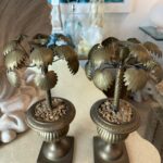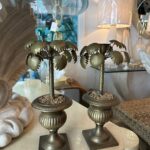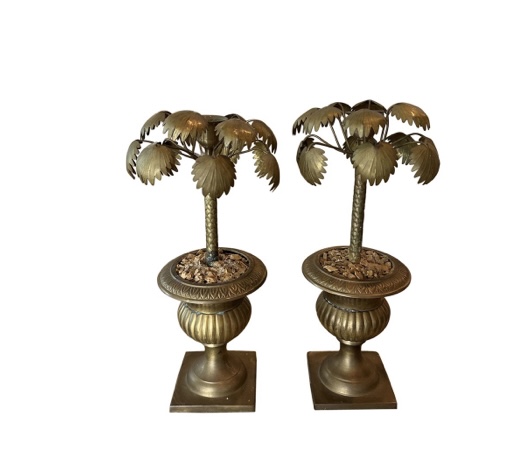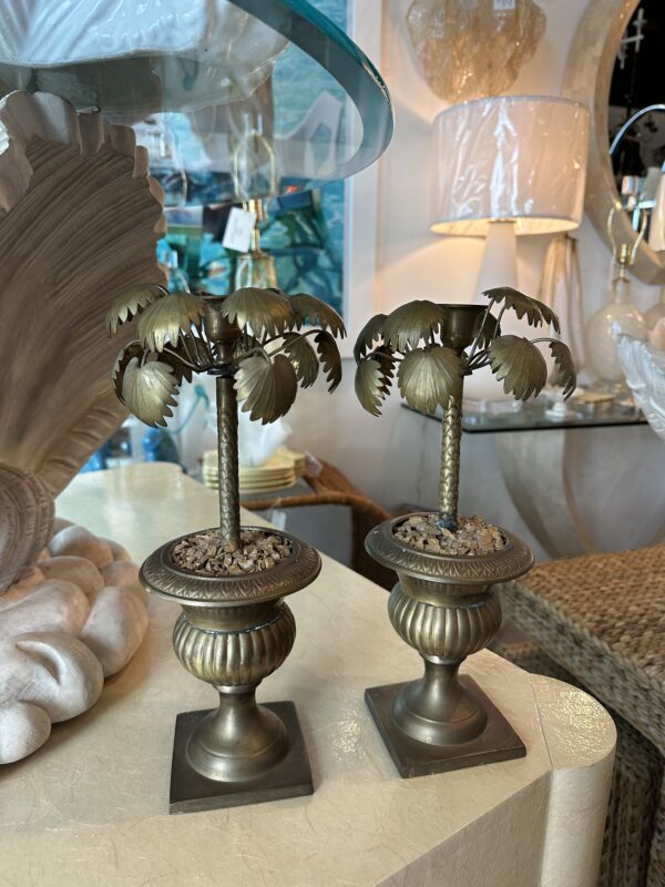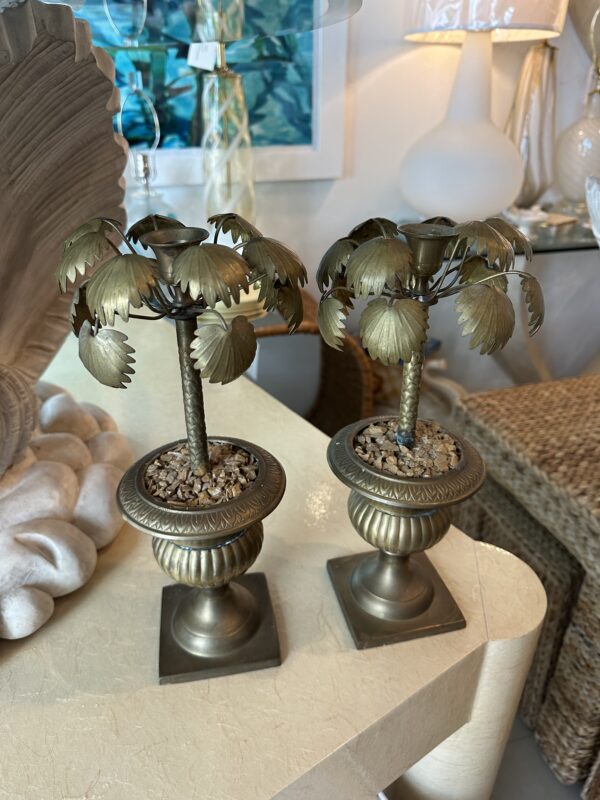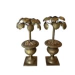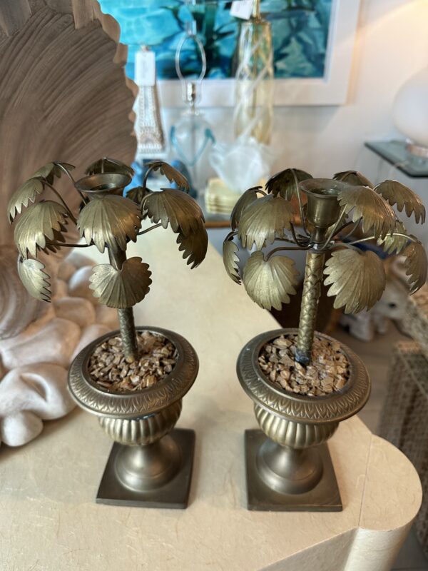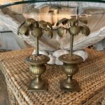 Vintage Tropical Pair of Brass Urn Palm Tree Leaf Leaves Candle Stick Holders