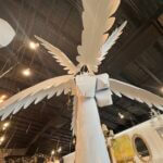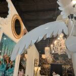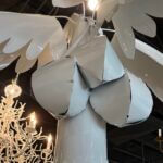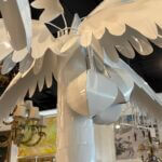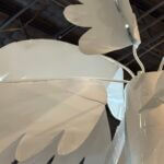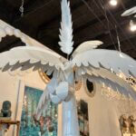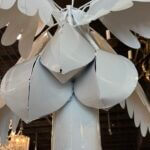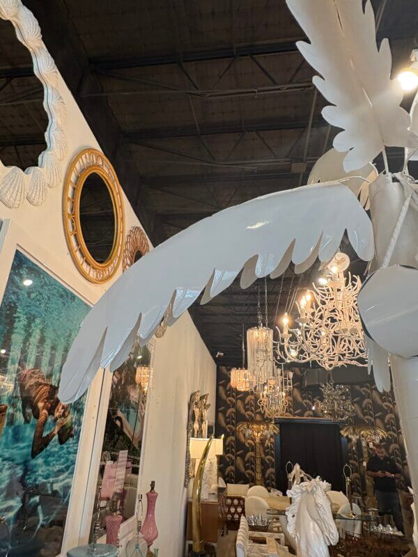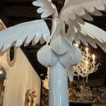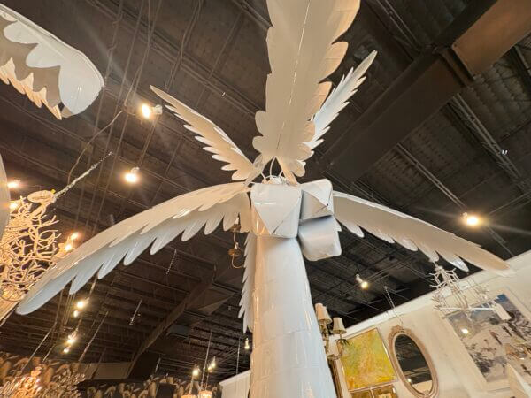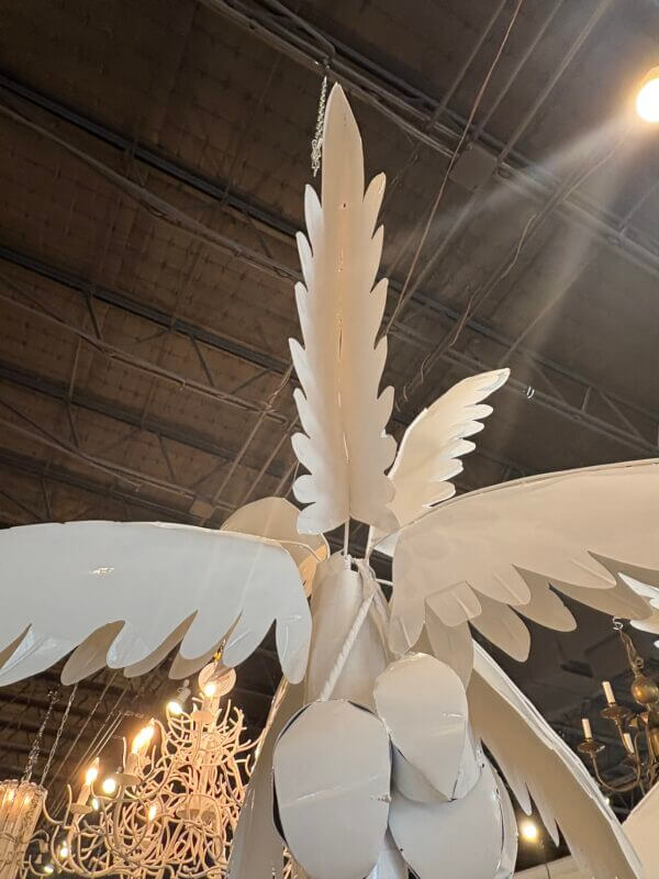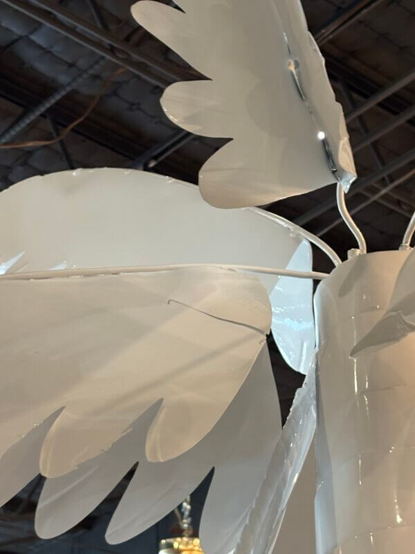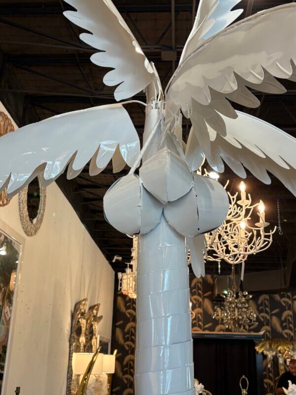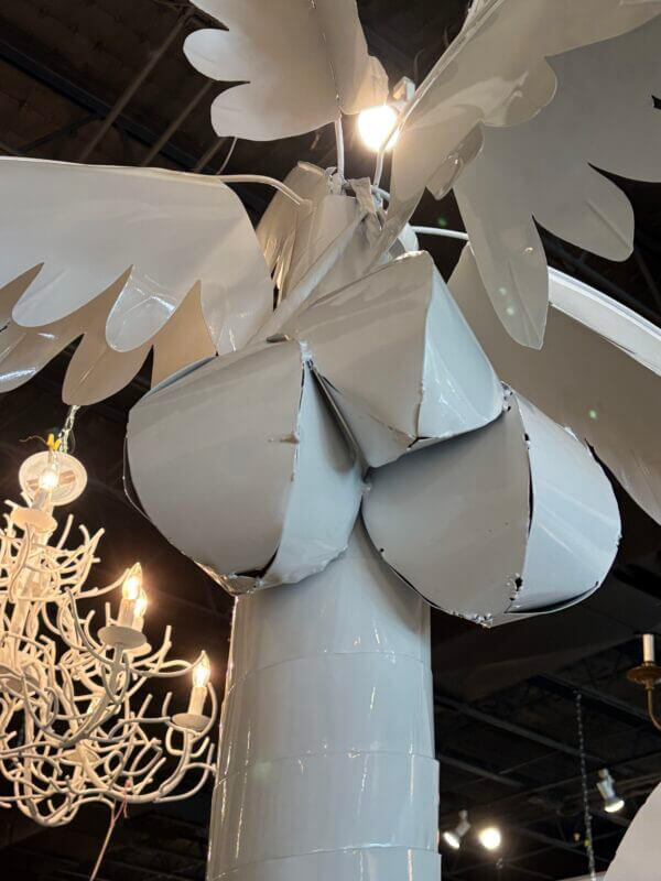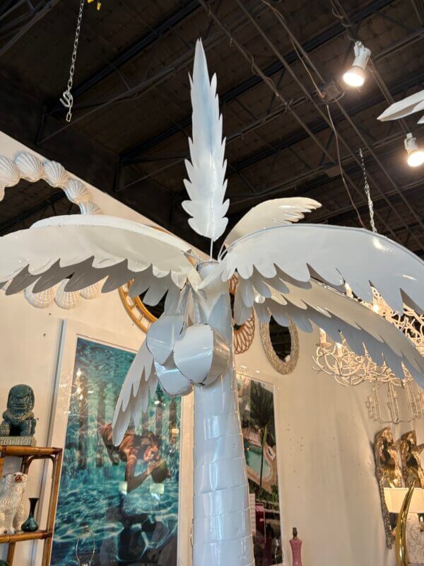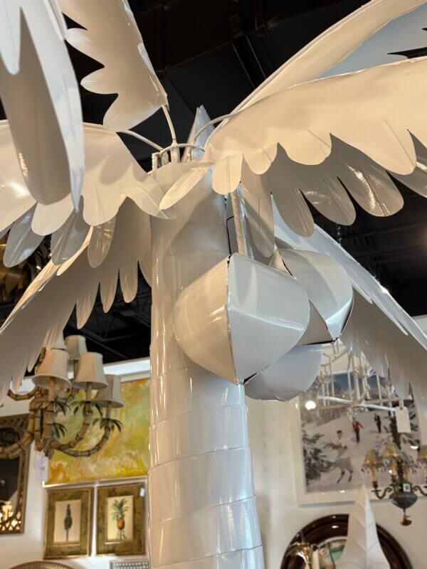 Amazing pair of vintage metal palm trees with coconuts. These have been newly powder-coated in a fresh white. The leaves can be removed to arrange differently or for shipping purposes. Minor imperfections to original vintage, newly powder-coated finish. Each tree measures approx 112 in tall x approx 65 in round at the top, leaf portion. These can be indoors or outdoors, porch, patio, poolside.