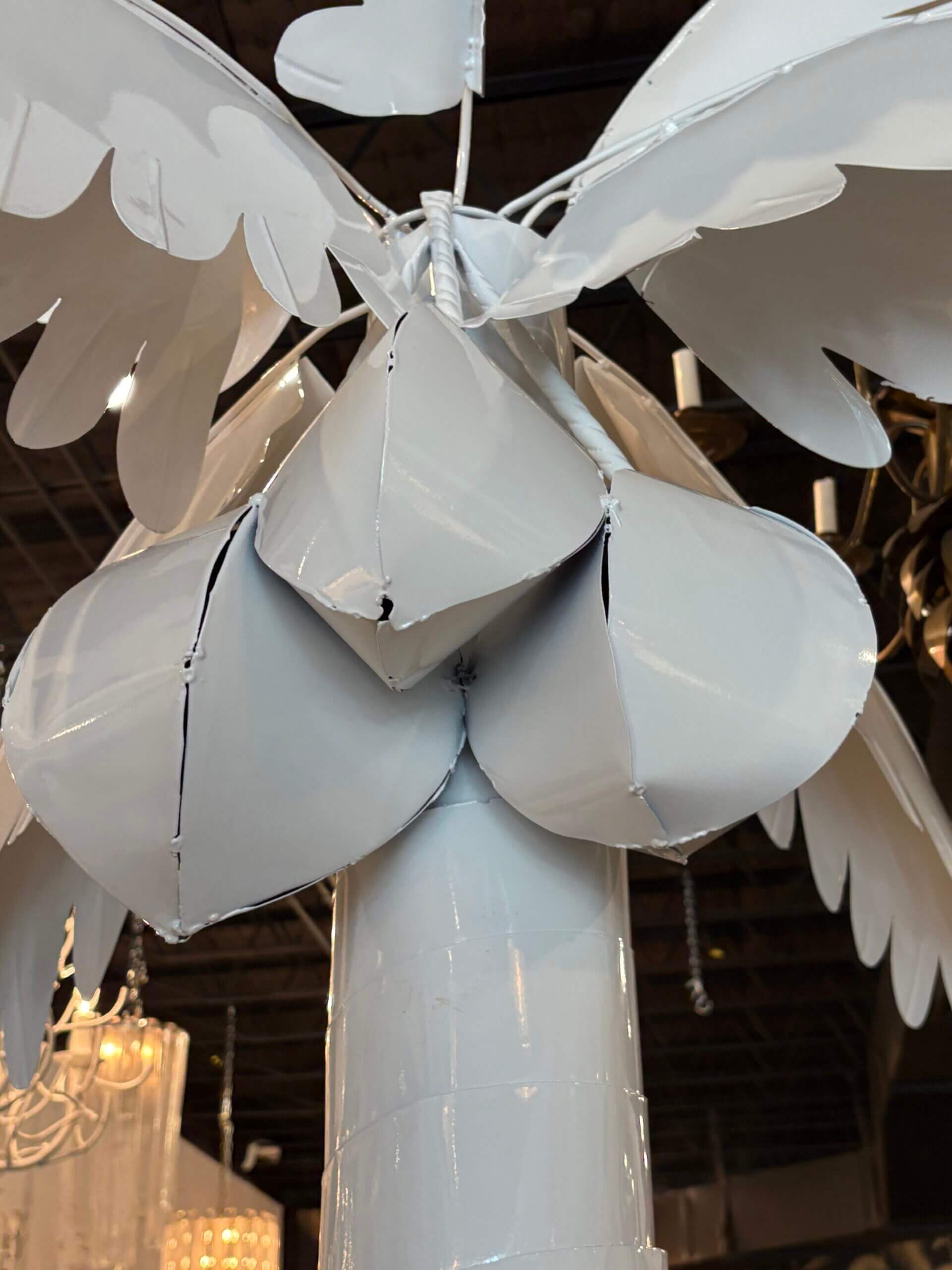 Amazing pair of vintage metal palm trees with coconuts. These have been newly powder-coated in a fresh white. The leaves can be removed to arrange differently or for shipping purposes. Minor imperfections to original vintage, newly powder-coated finish. Each tree measures approx 112 in tall x approx 65 in round at the top, leaf portion. These can be indoors or outdoors, porch, patio, poolside.
