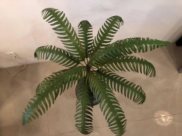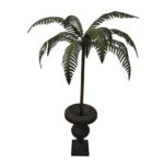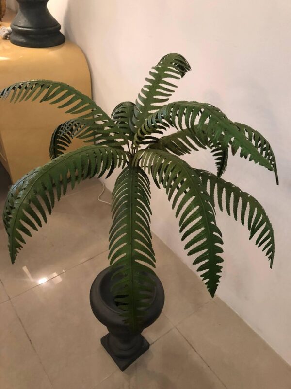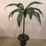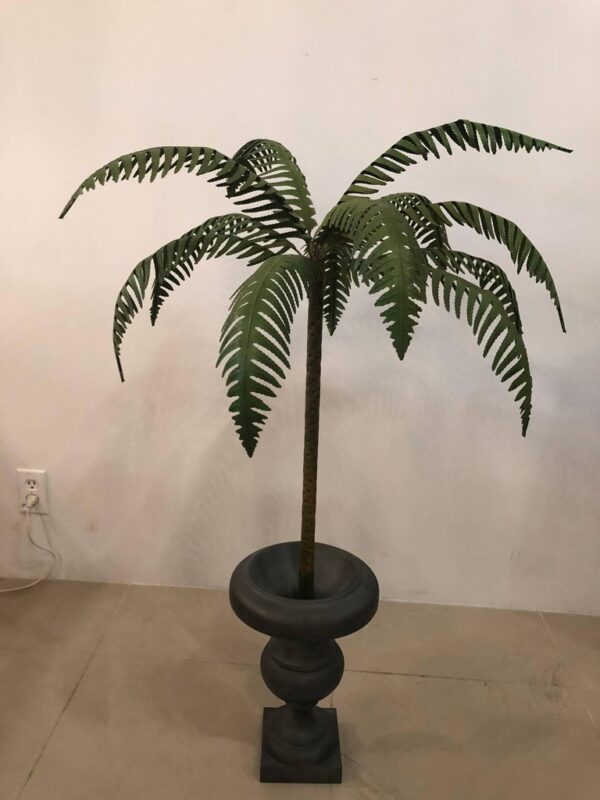 Vintage metal tole palm tree. Original finish may have some areas of patina. Heavy urn planter.