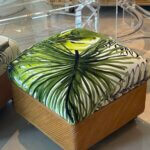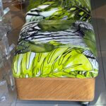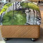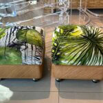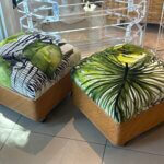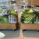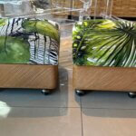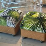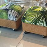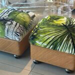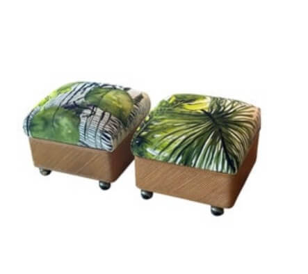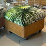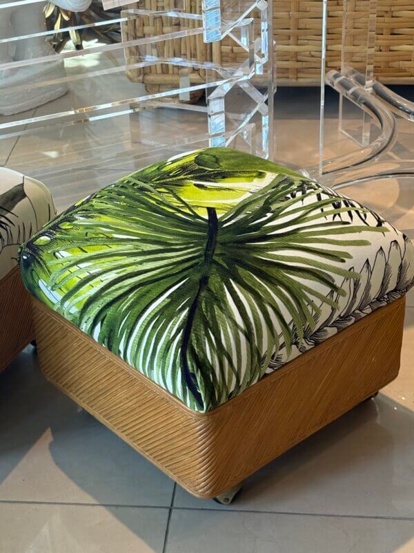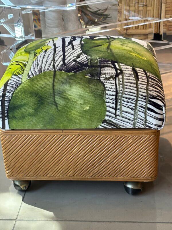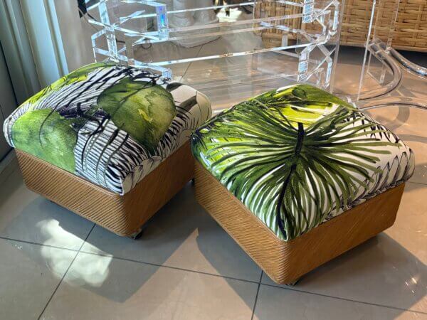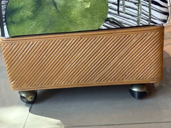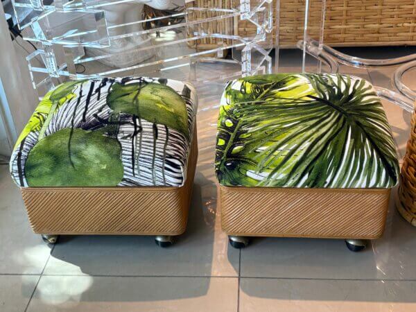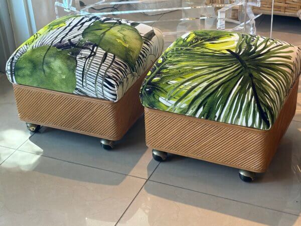 Vintage pair of pencil reed rattan benches, ottomans, stools with brass castors. Recently upholstered in a Christian Lacroix fabric. No damage to the reed. Dimensions: 14 H x 16.5 W x 16.5 D.