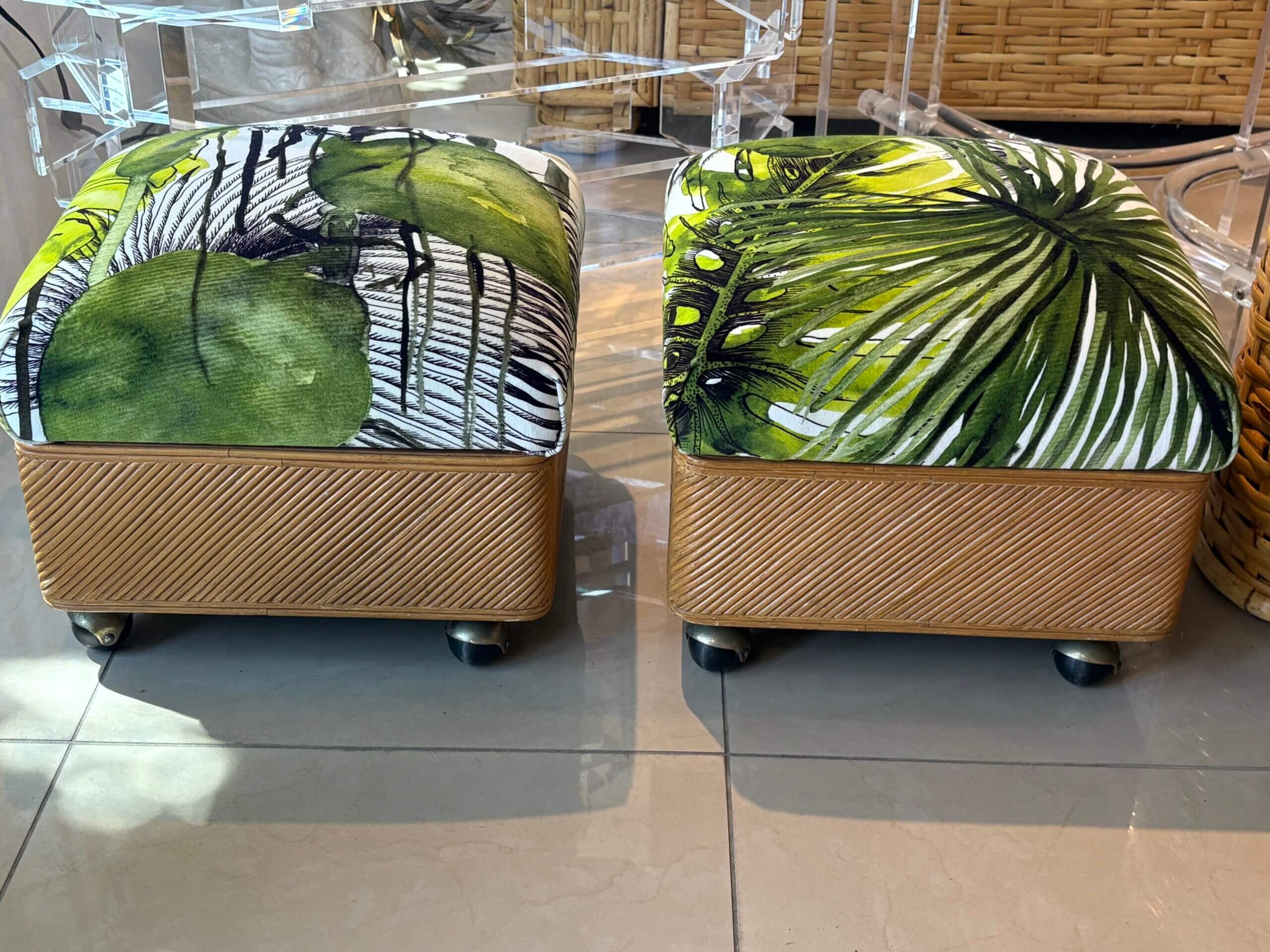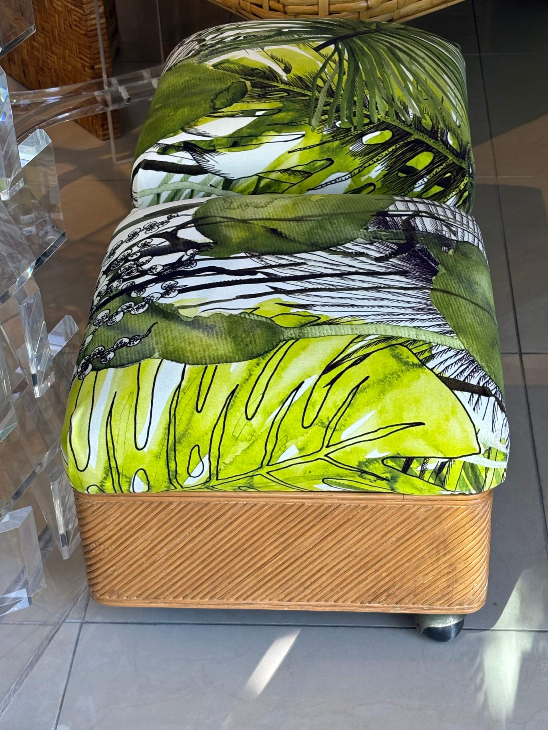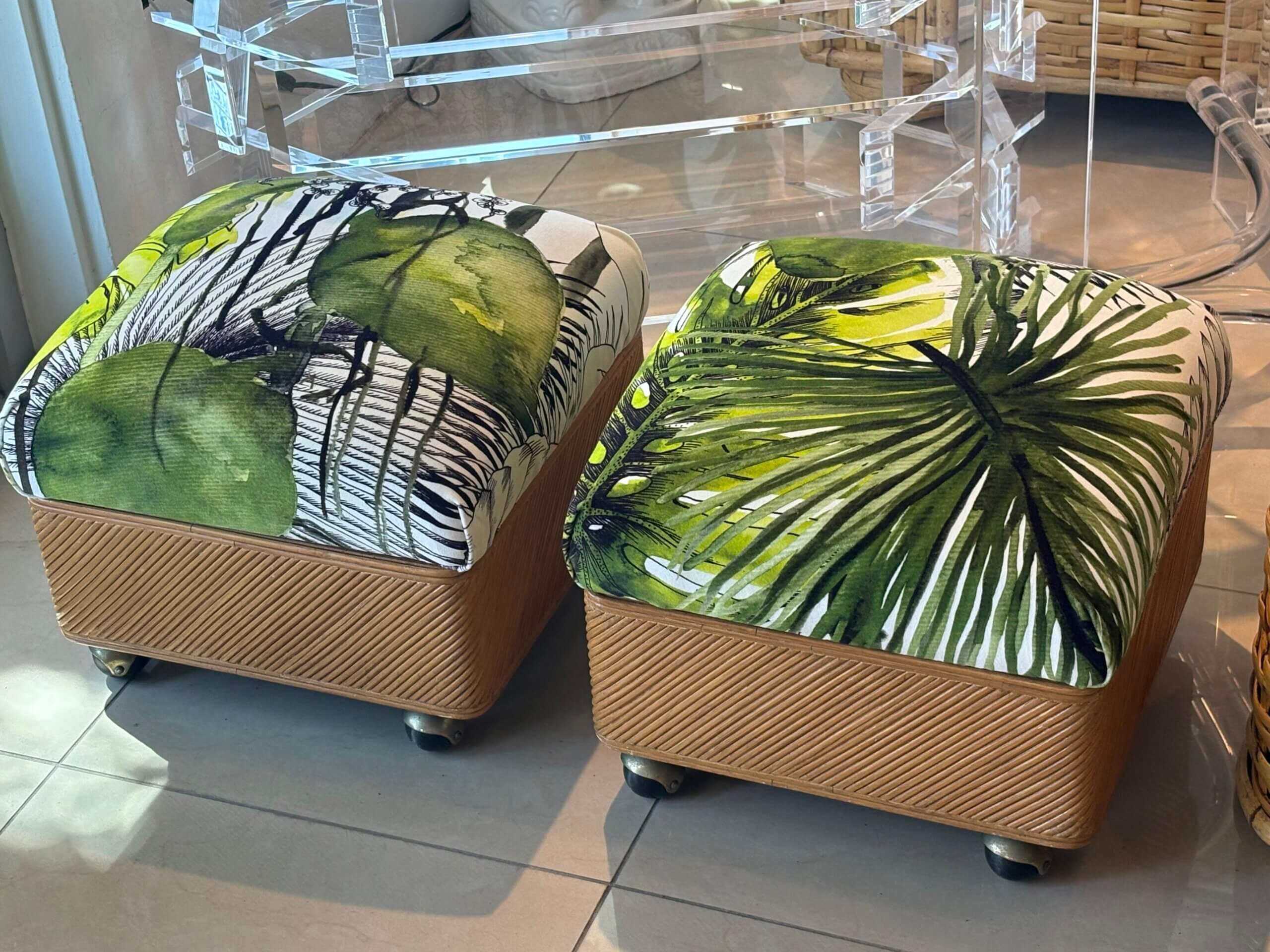 Vintage pair of pencil reed rattan benches, ottomans, stools with brass castors. Recently upholstered in a Christian Lacroix fabric. No damage to the reed. Dimensions: 14 H x 16.5 W x 16.5 D.