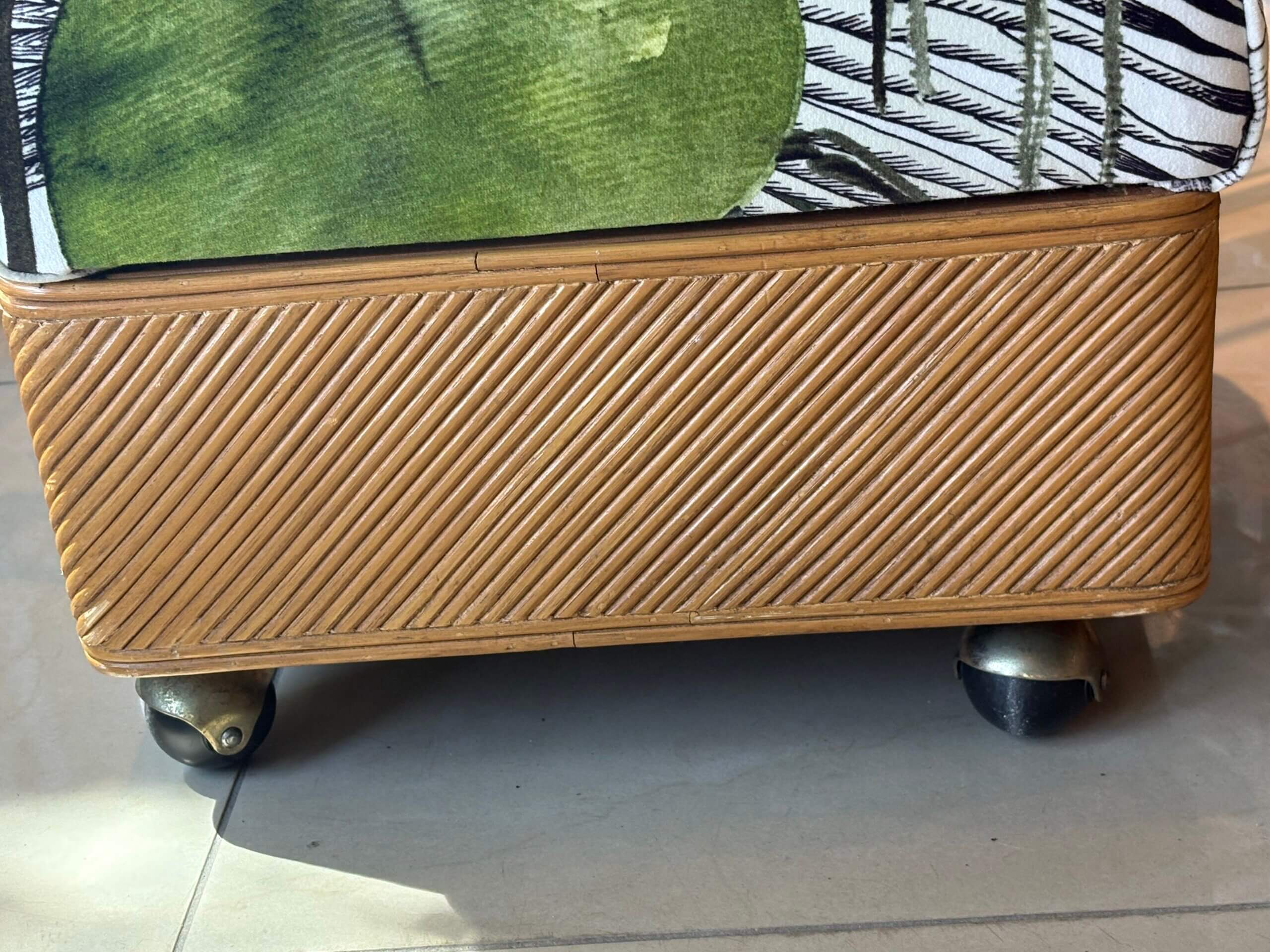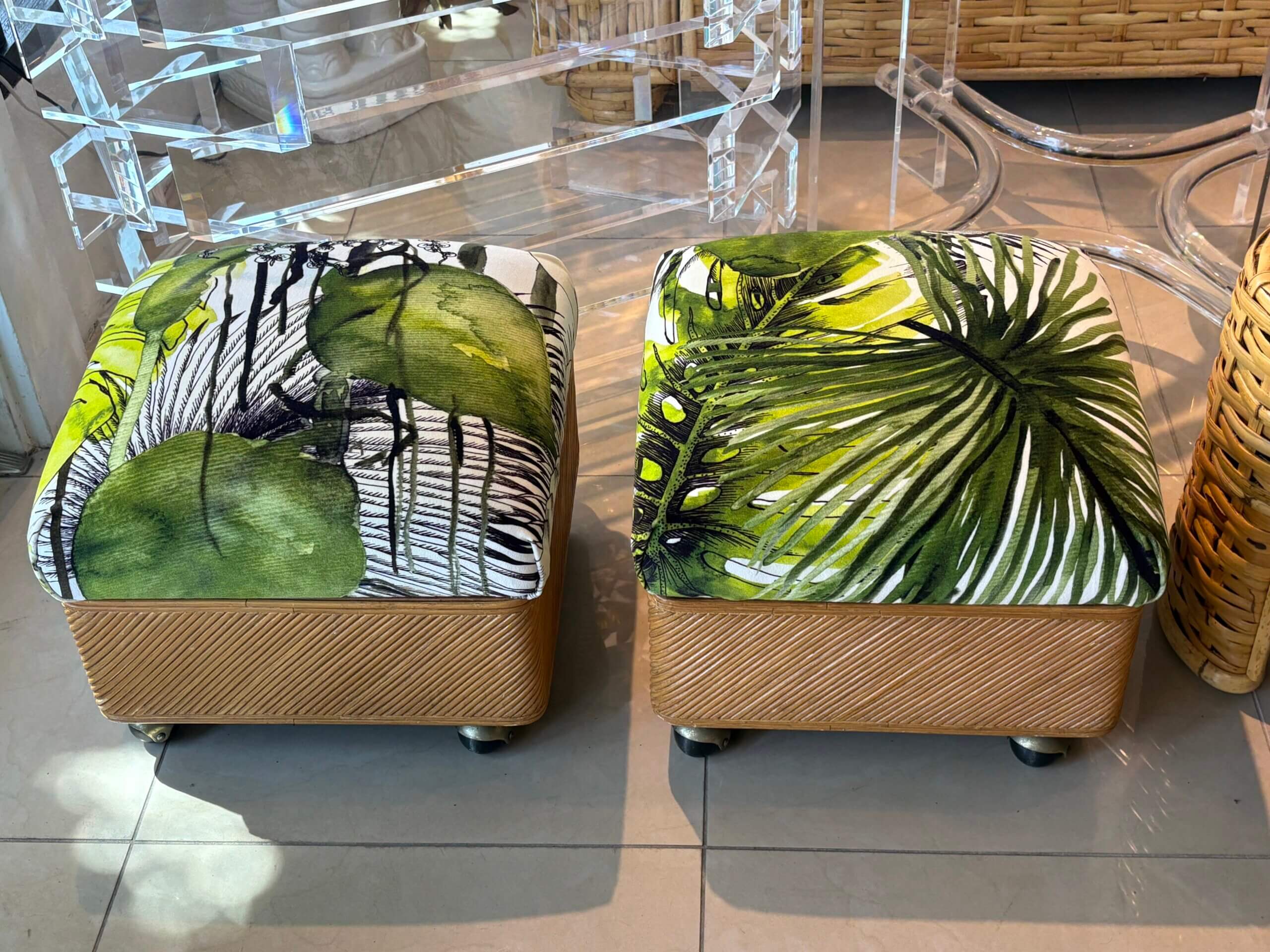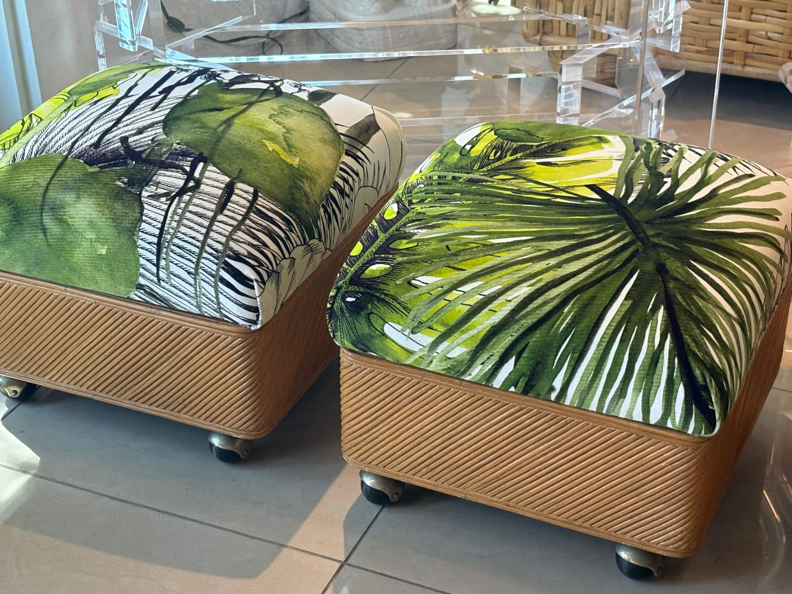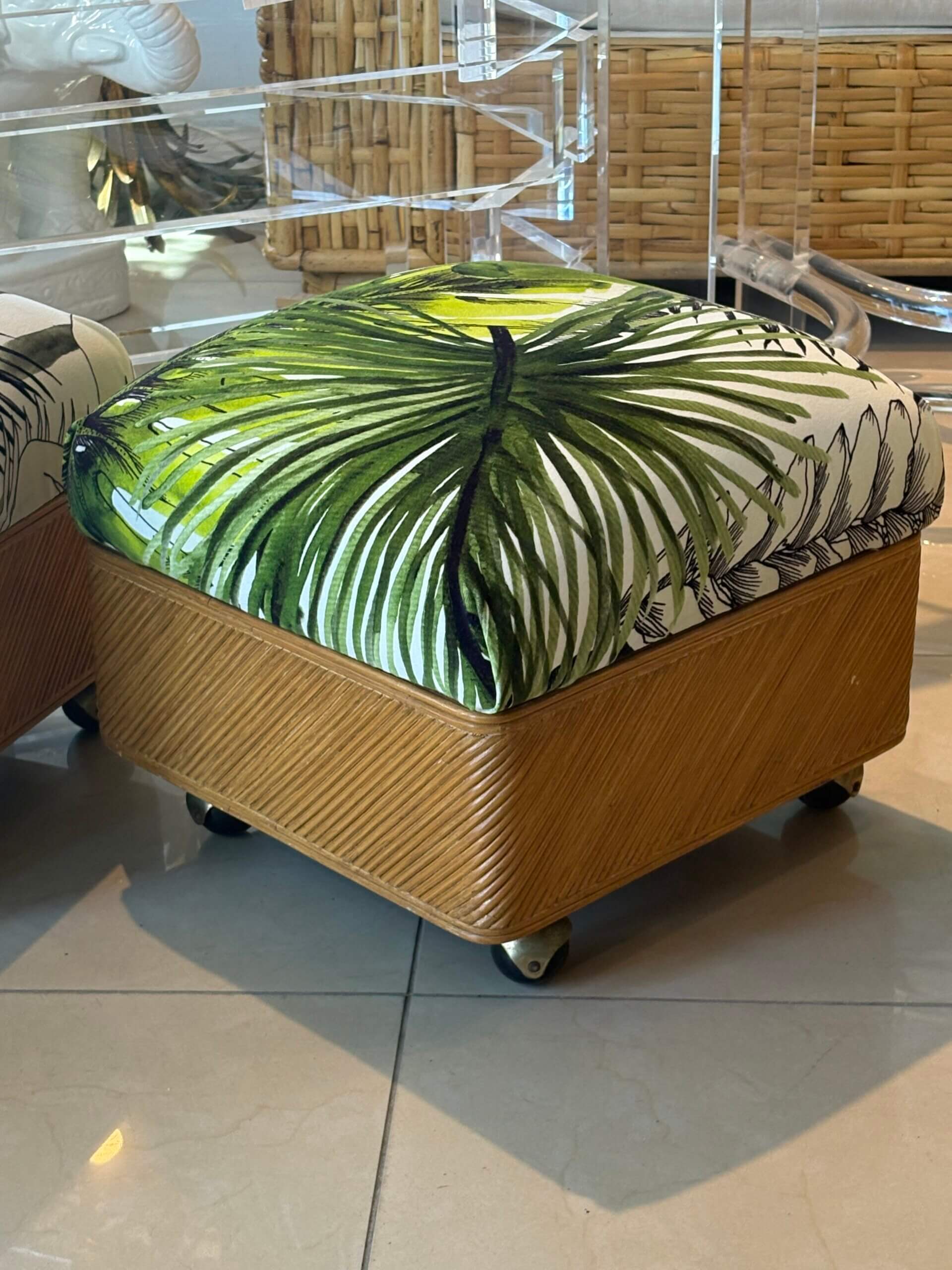 Vintage pair of pencil reed rattan benches, ottomans, stools with brass castors. Recently upholstered in a Christian Lacroix fabric. No damage to the reed. Dimensions: 14 H x 16.5 W x 16.5 D.