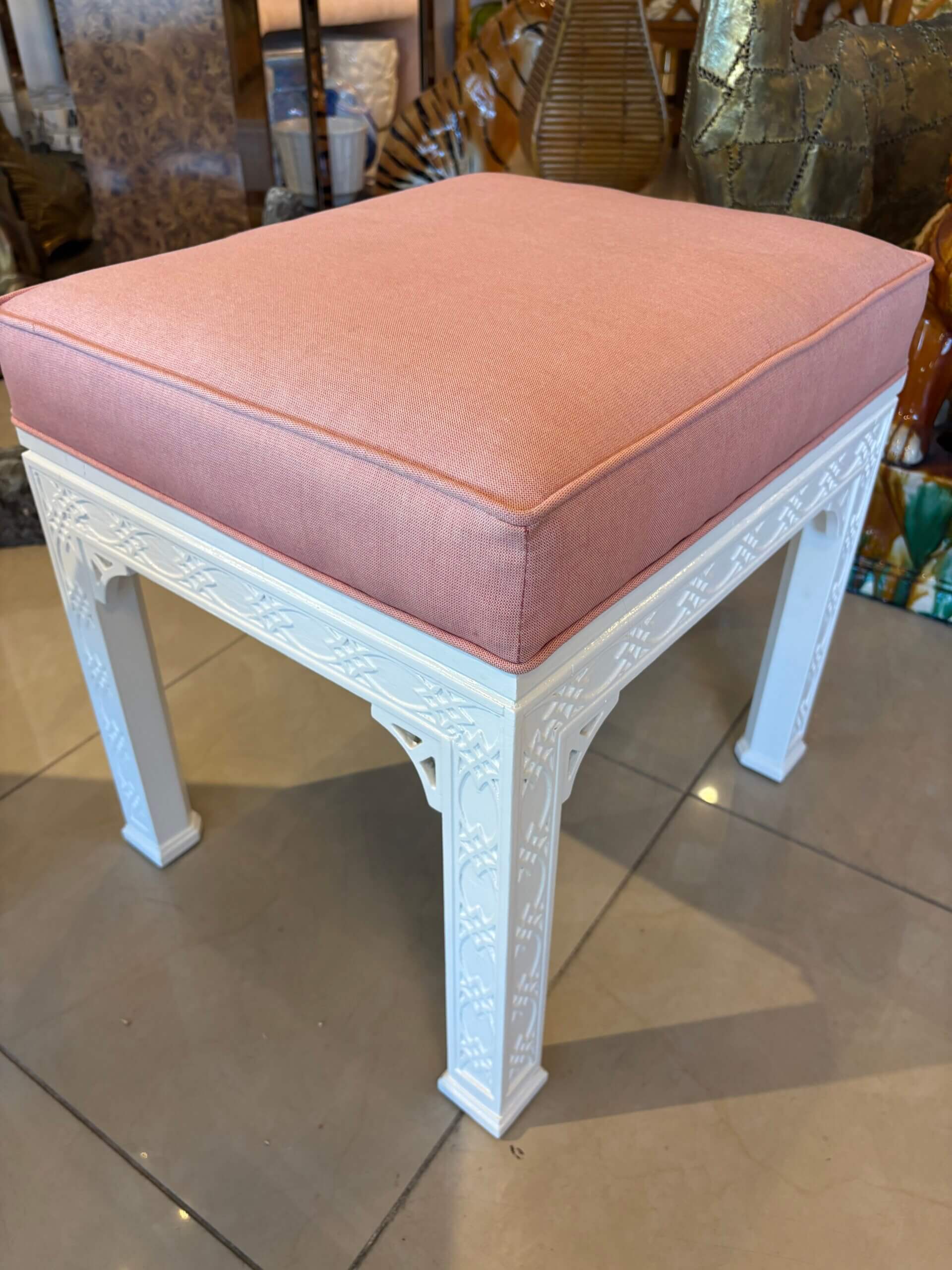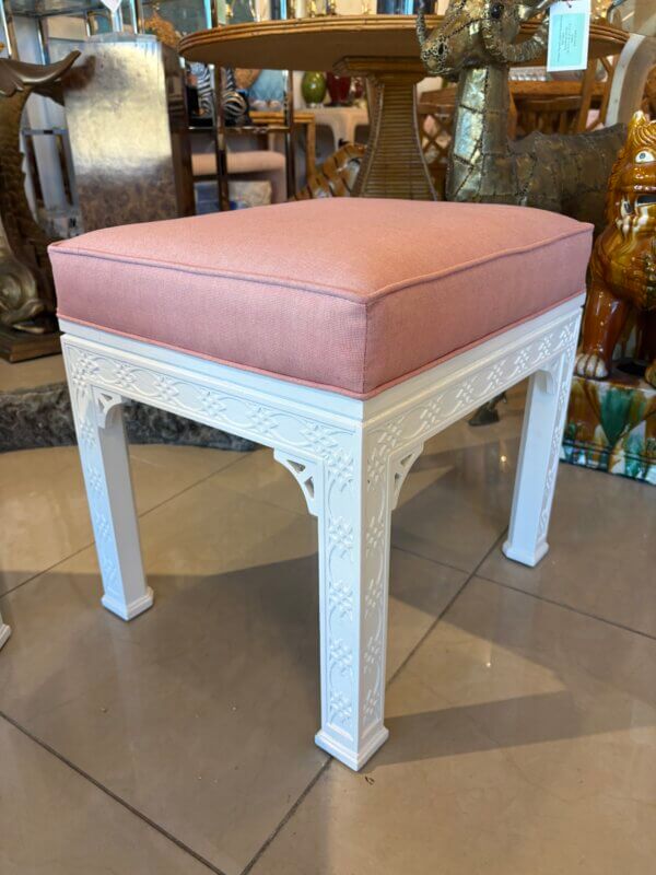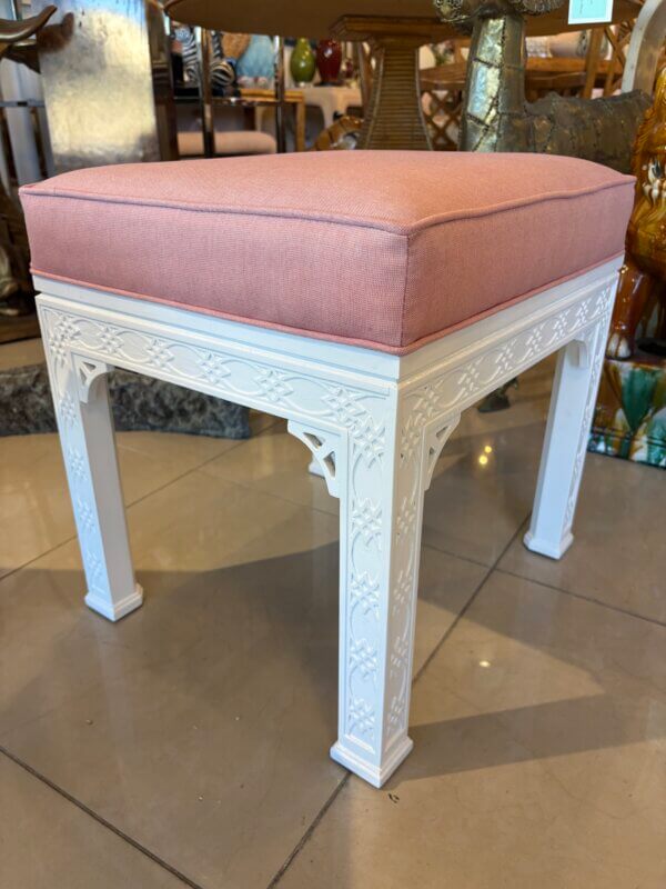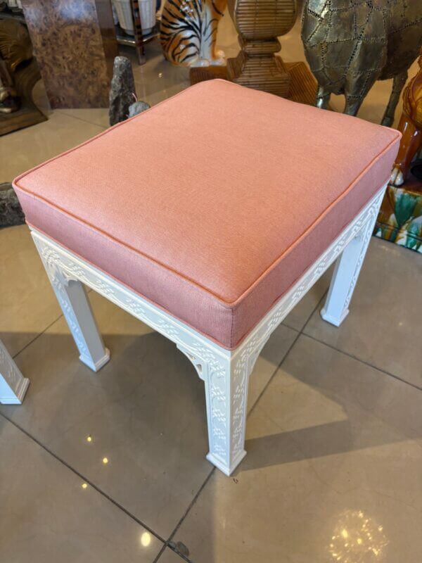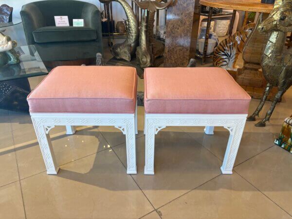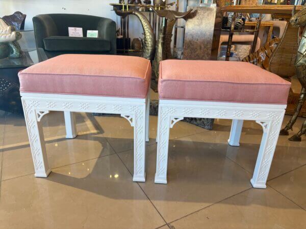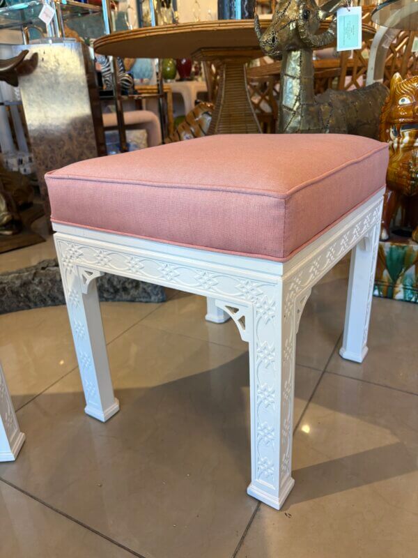 Lovely pair of vintage fretwork fret work benches ottomans that have been done in a gloss white, newly upholstered in a pink upholstery, all new foam and board. Tagged Kindel underneath. Dimensions: 18 H x 18.5 W x 16 D.