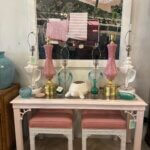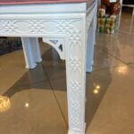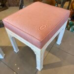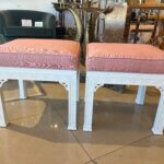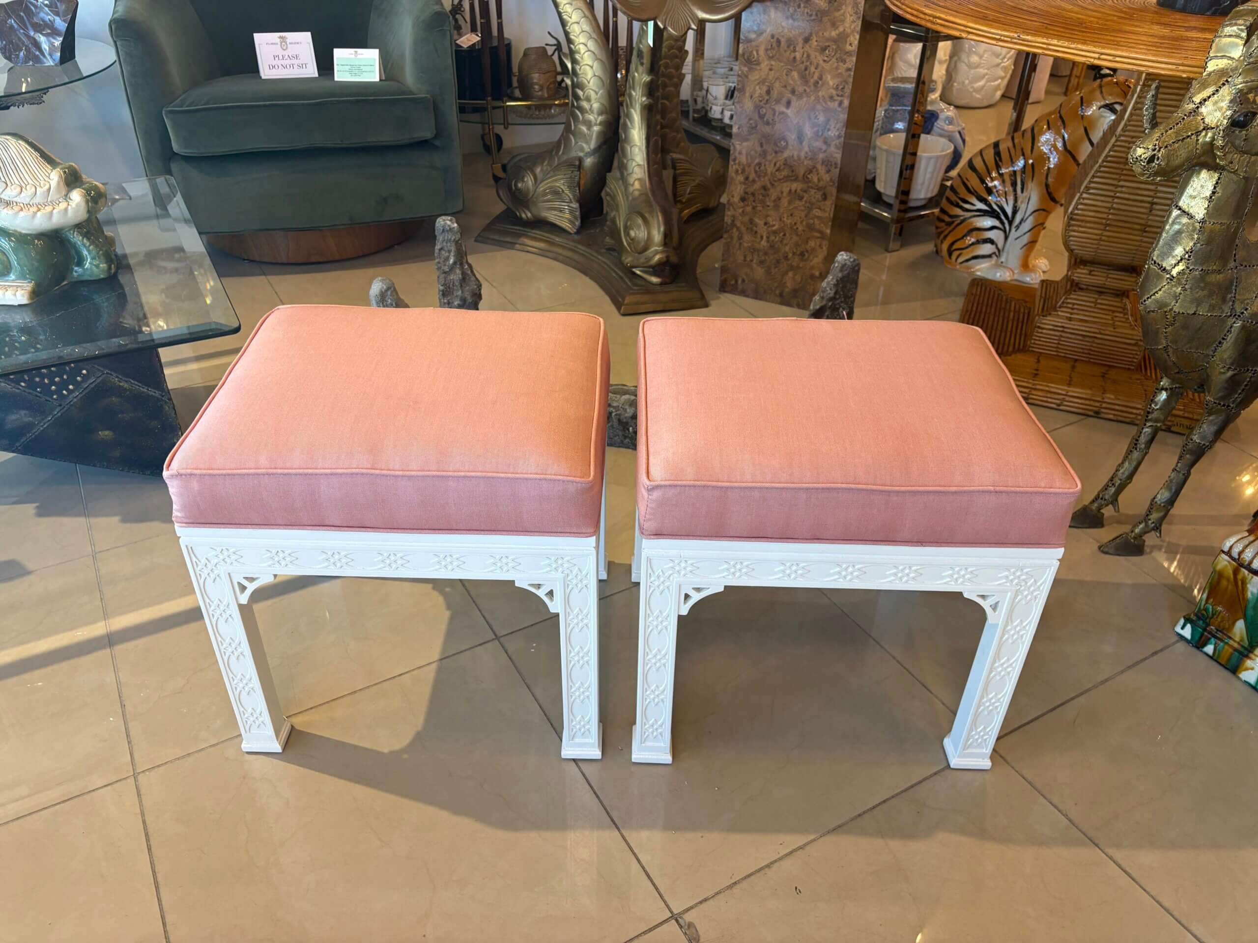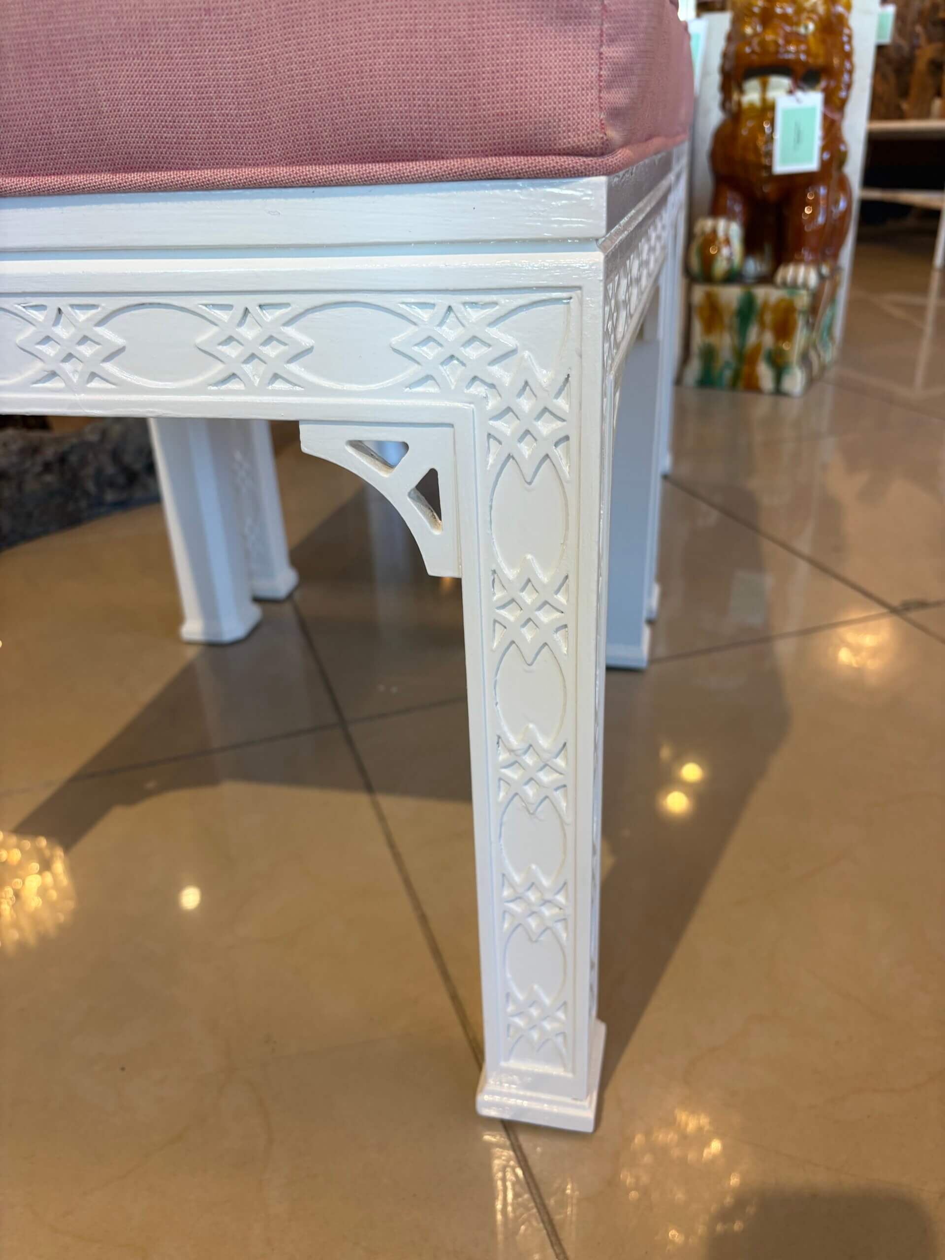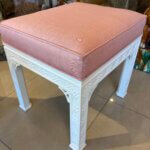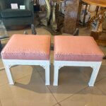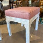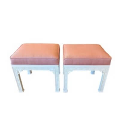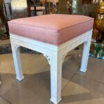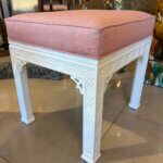 Lovely pair of vintage fretwork fret work benches ottomans that have been done in a gloss white, newly upholstered in a pink upholstery, all new foam and board. Tagged Kindel underneath. Dimensions: 18 H x 18.5 W x 16 D.