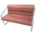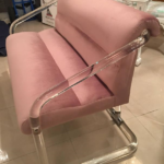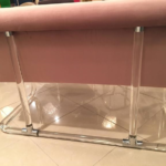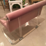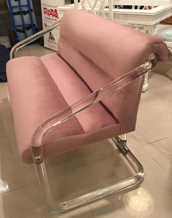 Vintage Hollywood Palm Beach Regency, Lucite and chrome Lion in Frost, signed and dated, 1979, loveseat bench, settee. New upholstery in a beautiful lavender velvet. Waterfall arm style. This is extremely rare! I have never seen this piece before. Measures: Seat depth is 18, overall depth is 28, please see below for sizes.