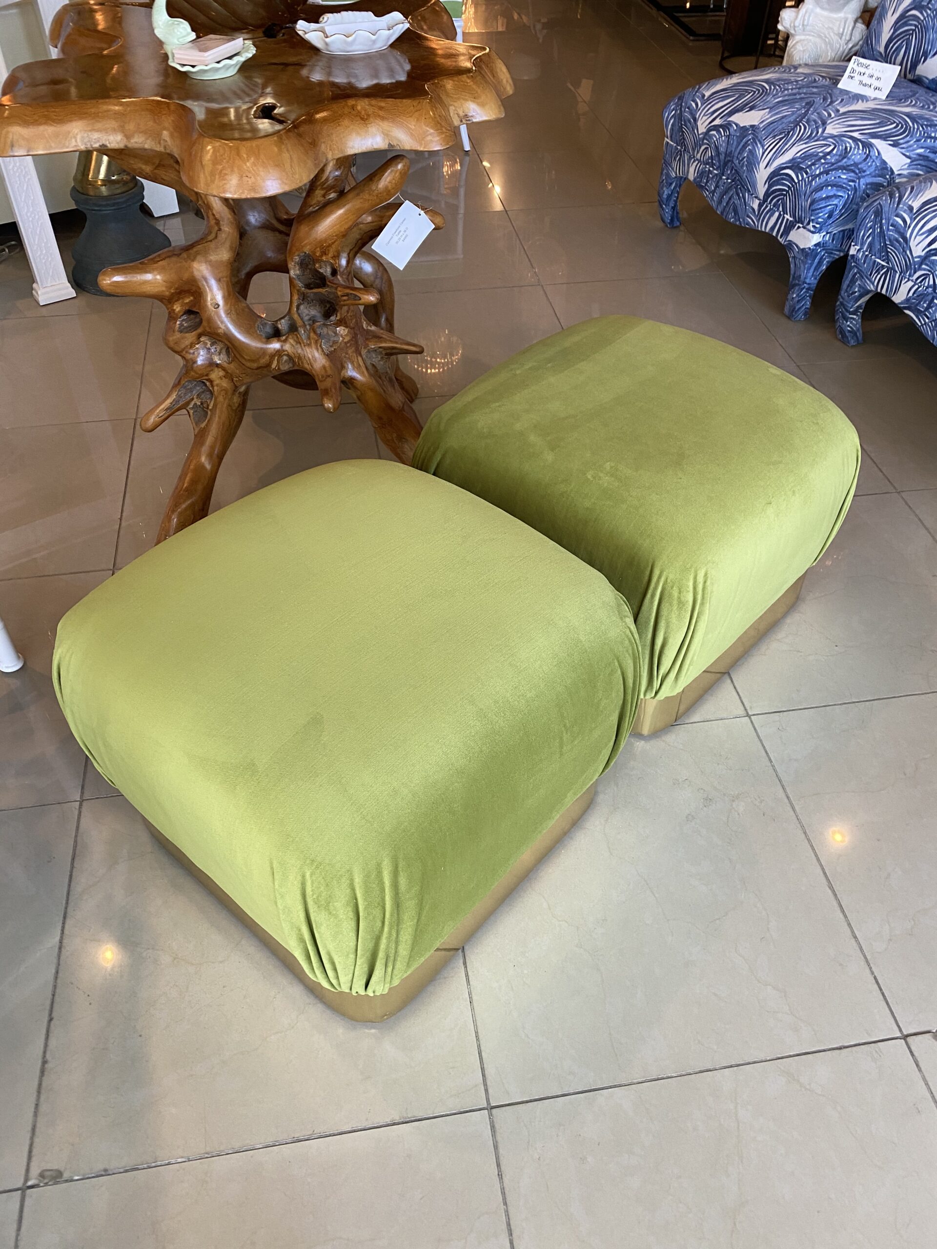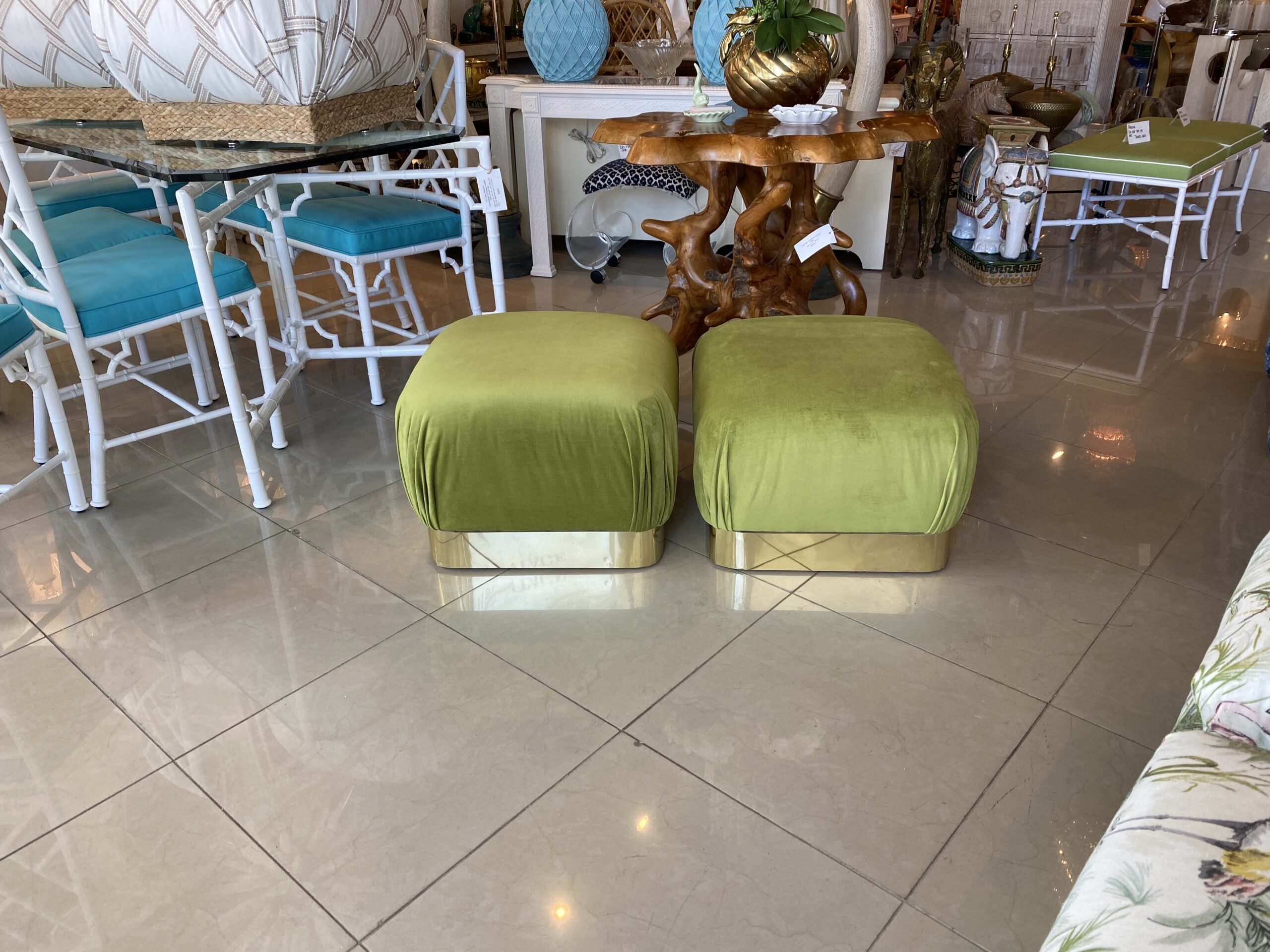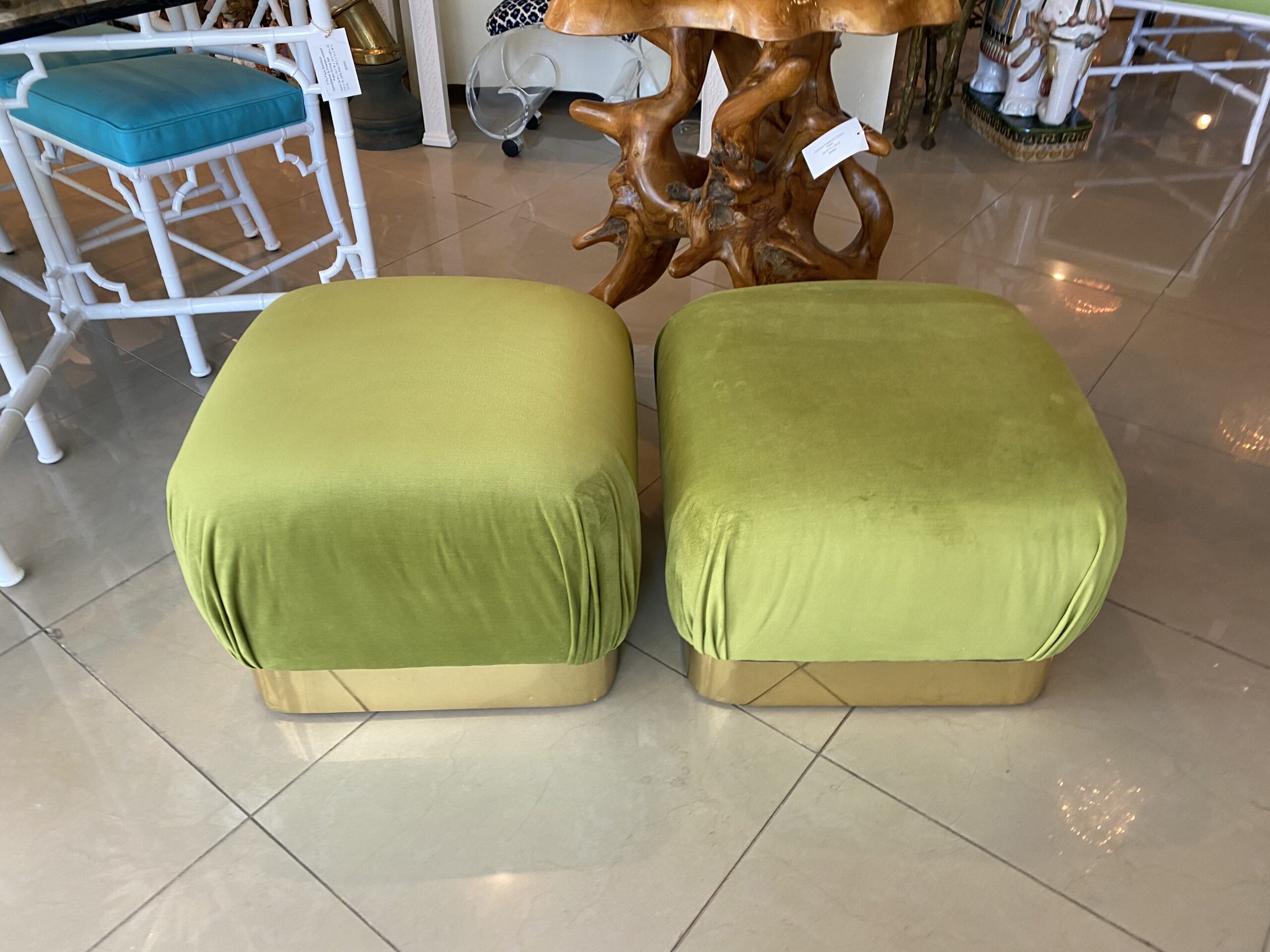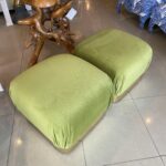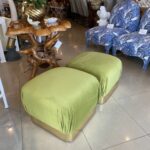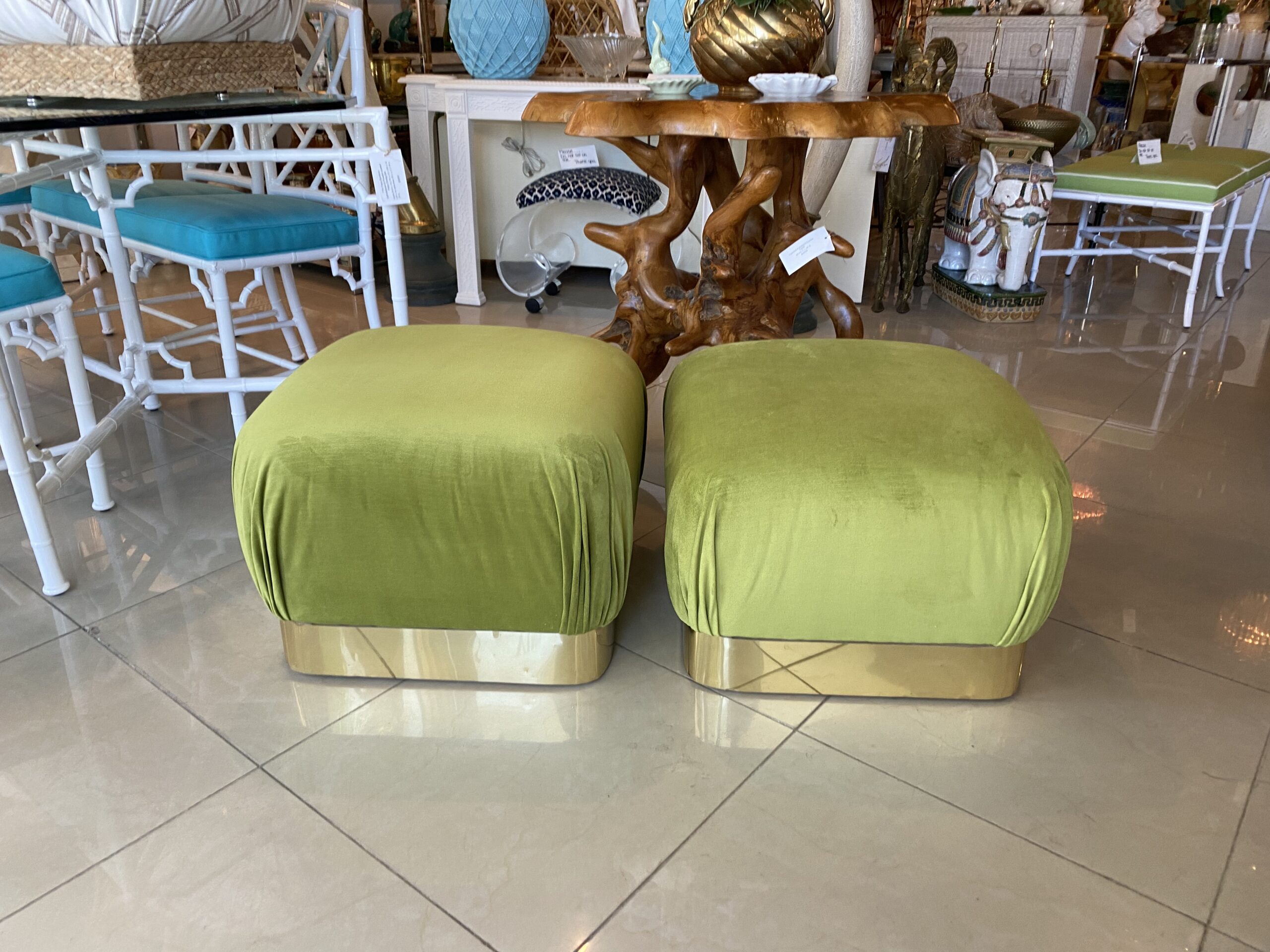 Vintage Pair Upholstered Green Velvet Brass Benches Poufs Karl Springer