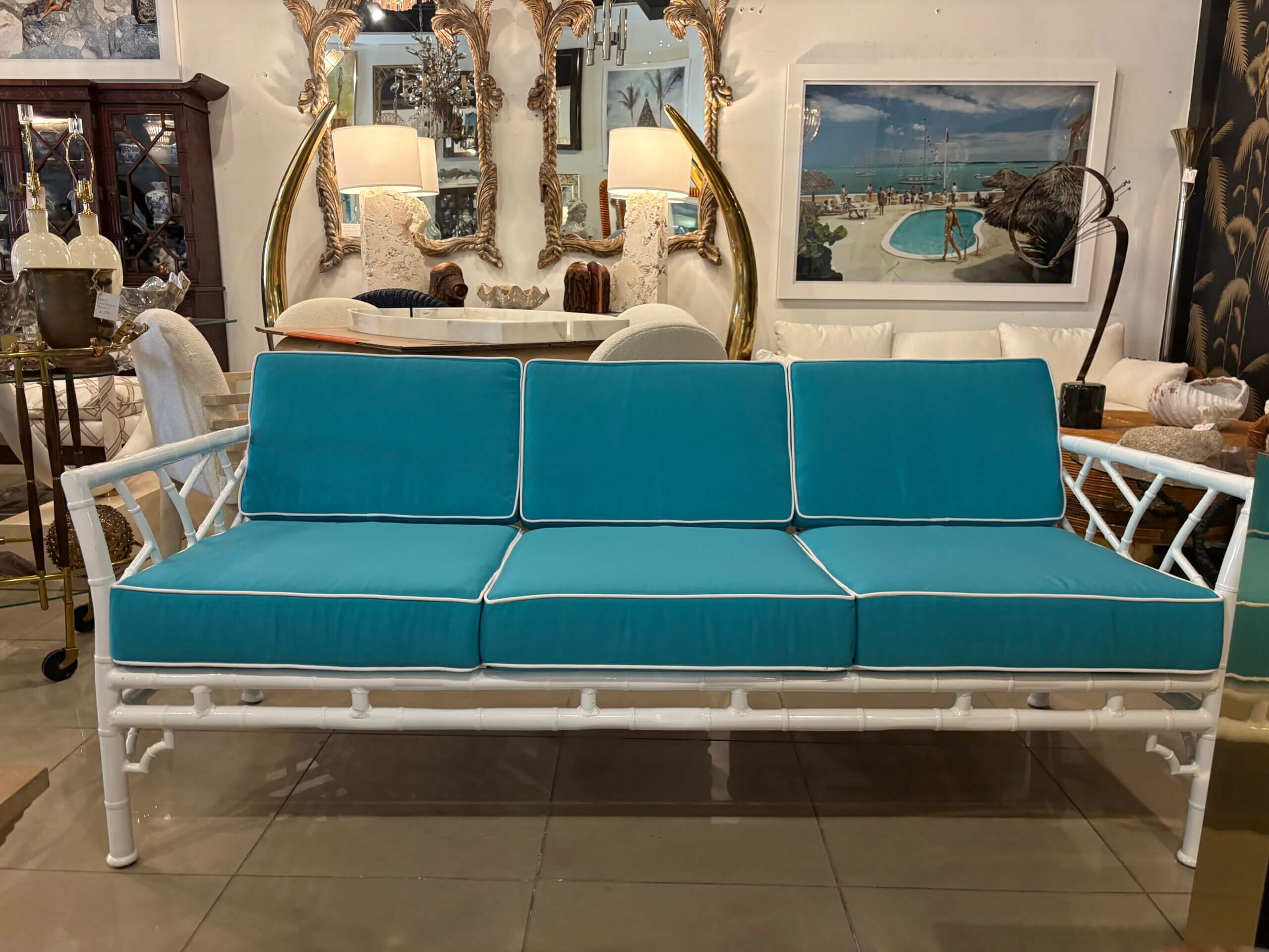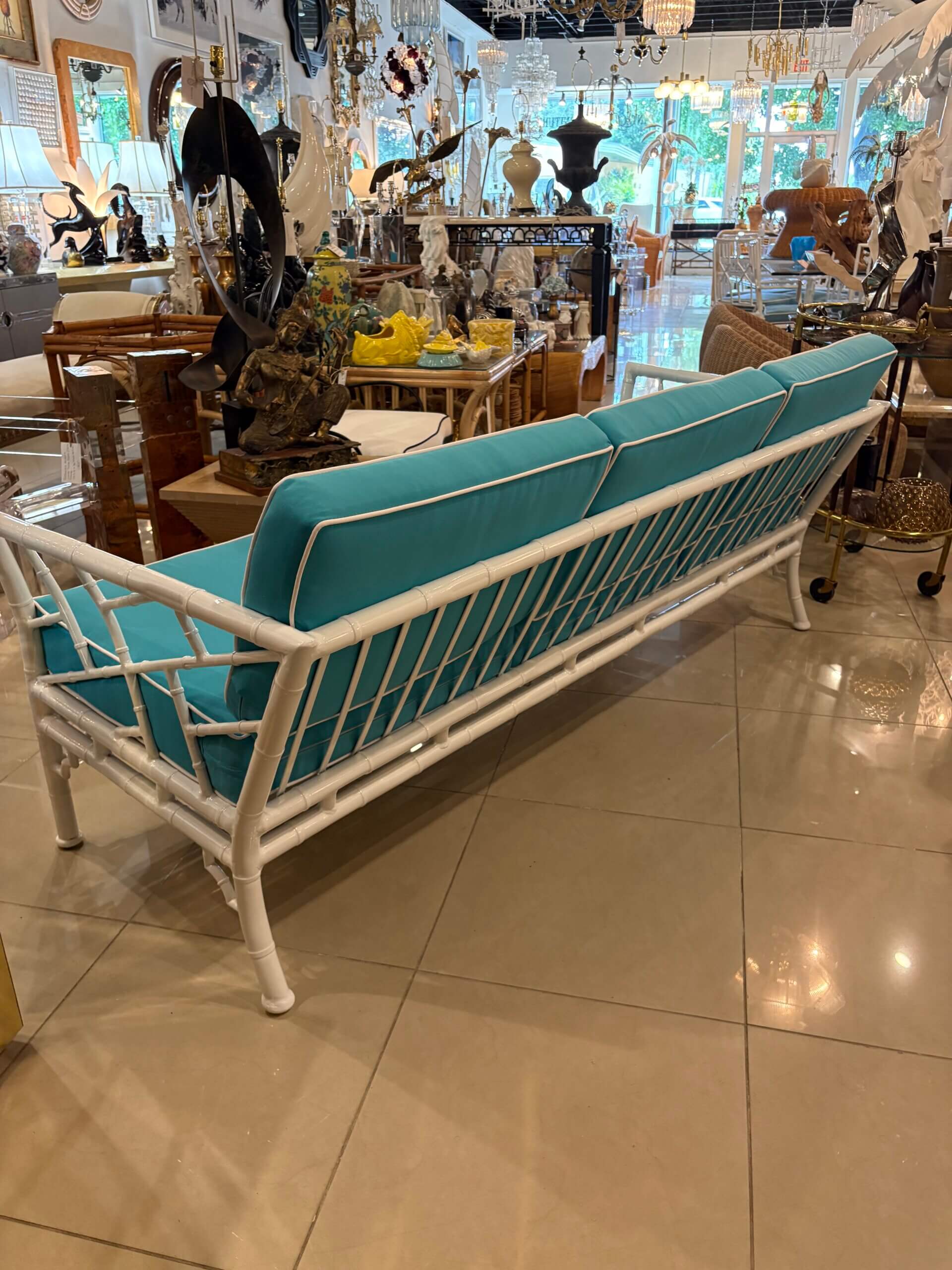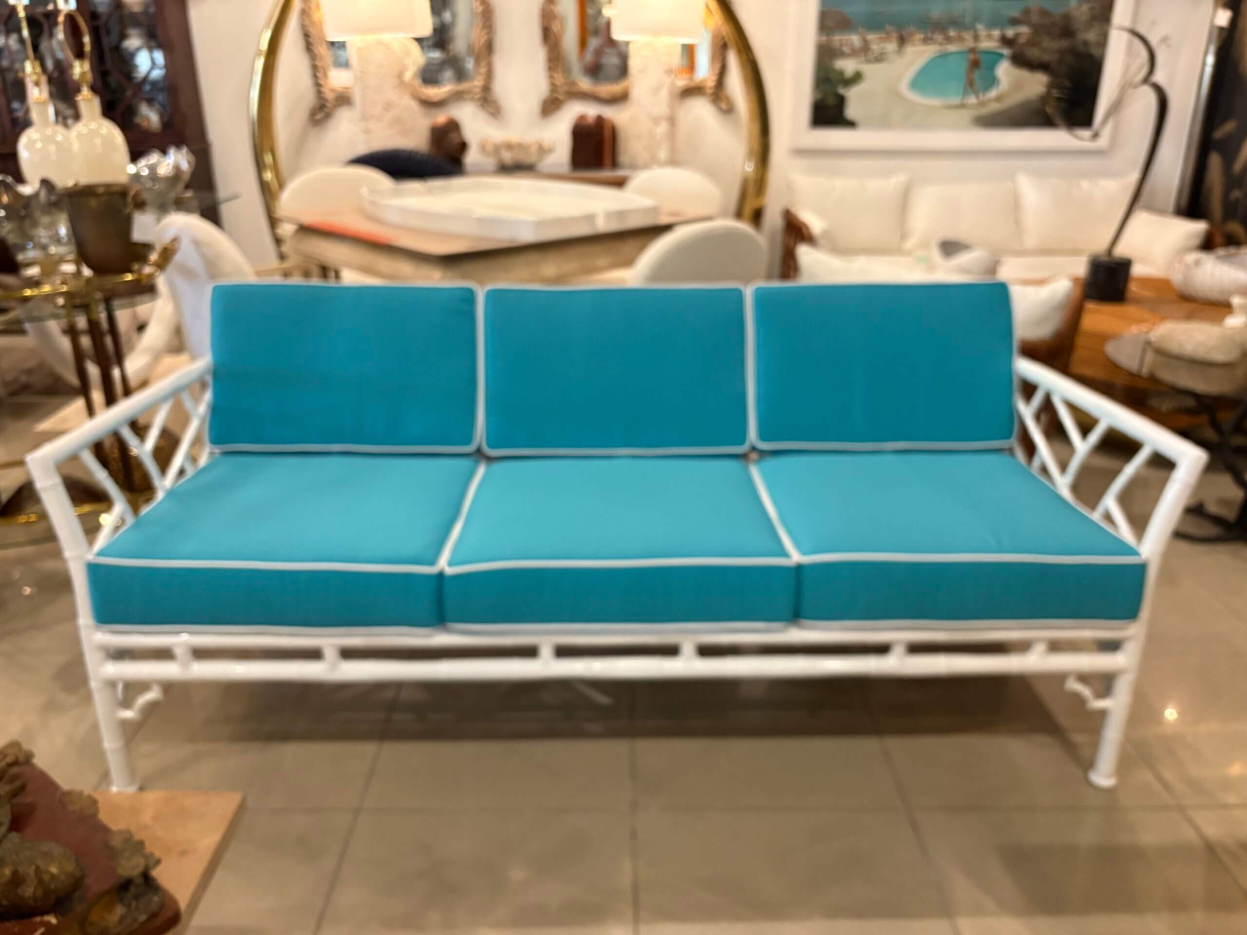 Vintage 1970s faux bamboo metal outdoor patio porch sofa. Chinese Chippendale with fretwork. This has been professionally powder-coated white. All cushions are custom & new. New foam, new Sunbrella upholstery & trim. These can flipped and also have zippers. I do have another sofa available if interested please inquire. Dimensions: 76 L x 30.5 H (top of back cushions) x 25.25 H (to back of sofa) x 30.5 D . Seat Height 19.5.