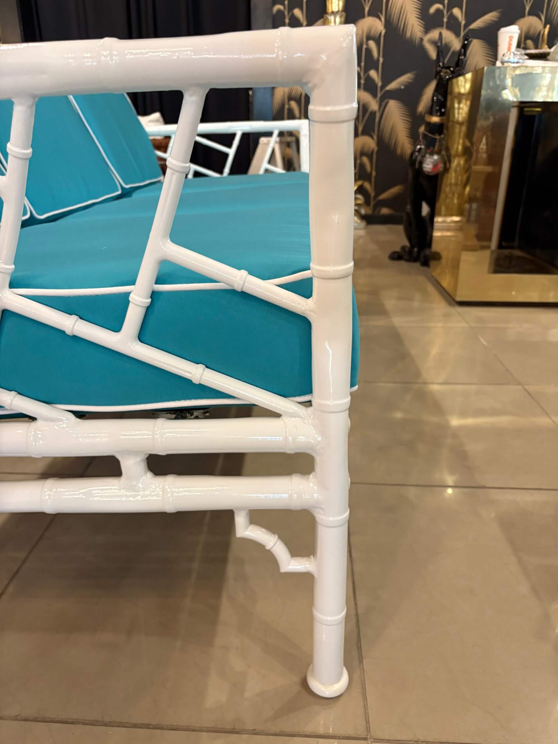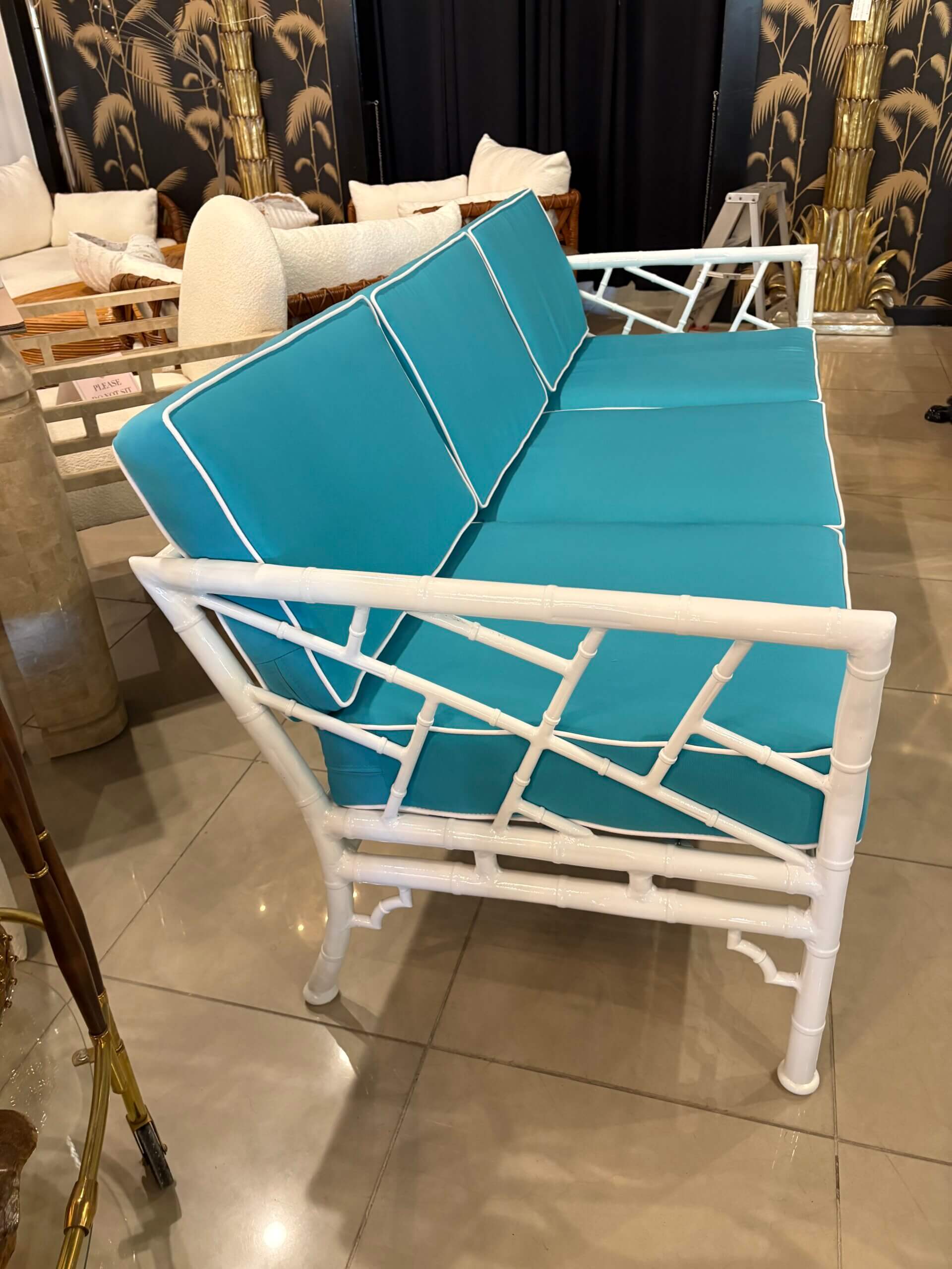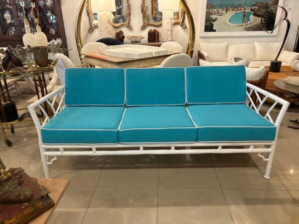 Vintage 1970s faux bamboo metal outdoor patio porch sofa. Chinese Chippendale with fretwork. This has been professionally powder-coated white. All cushions are custom & new. New foam, new Sunbrella upholstery & trim. These can flipped and also have zippers. I do have another sofa available if interested please inquire. Dimensions: 76 L x 30.5 H (top of back cushions) x 25.25 H (to back of sofa) x 30.5 D . Seat Height 19.5.