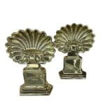 SOLD Polished Brass Pair Palm Beach Seashell Scalloped Shell Fireplace Andirons
