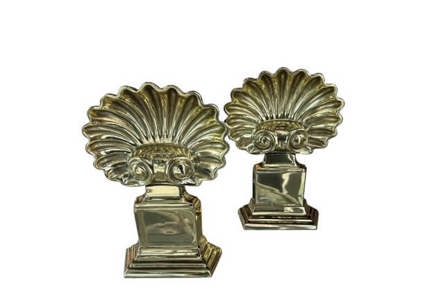SOLD Polished Brass Pair Palm Beach Seashell Scalloped Shell Fireplace Andirons