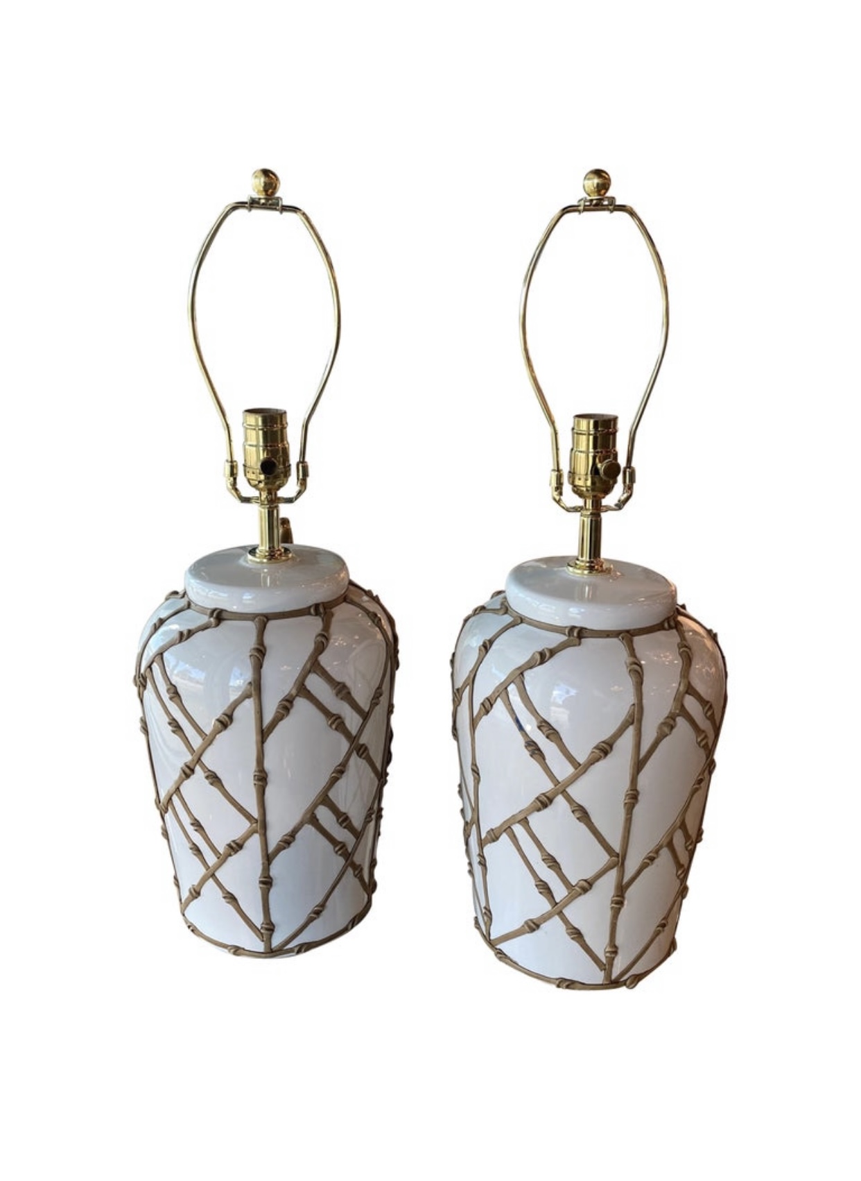 Vintage pair of white ceramic ginger jar lamps with faux bamboo. These have been newly wired, 3 way sockets and all new brass hardware. No chips or breaks.
