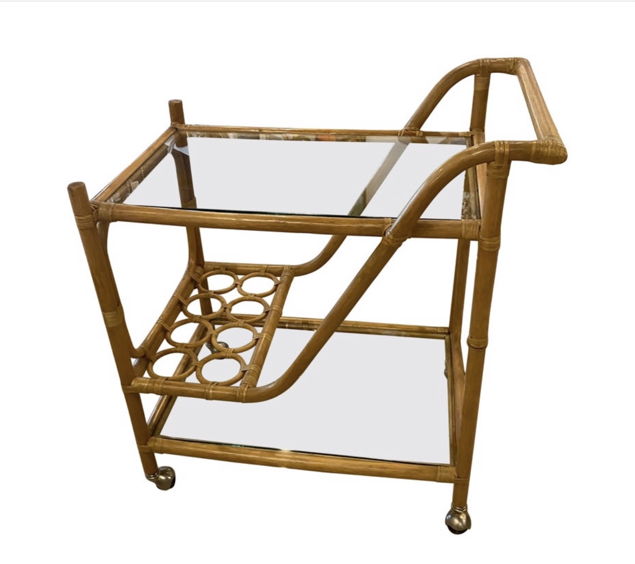 SOLD Vintage Palm Beach Rattan Bar Serving Trolley Cart