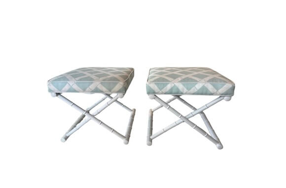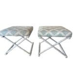 Beautiful pair of vintage 1970s metal, faux bamboo x benches, footstools, ottomans. These have been professionally powder-coated in white. All new upholstery, including insides. These can be used indoors, outdoors or patio. These have a 1″ inch tilt on the front so they can be used at a footstool ottoman if desired. I do have another pair available in another fabric if 4 are needed. Dimensions: 19 H x 20.5 W x 20 D.