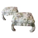 SOLD Vintage Pair French Linen Bird Upholstered Ming Benches Stools Ottomans