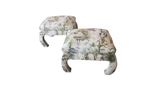 The most beautiful benches, ottomans, stools. These have been upholstered in a French linen with bird motif. They have amazing ming legs on a sides. Dimensions: 25.5 W x 19.5 D x 18.5 H.