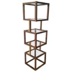 Vintage cube etagere with five glass shelves for display. The cubes are in a rose gold color and the straight connecting bars are in a gold brass color.