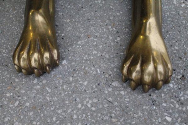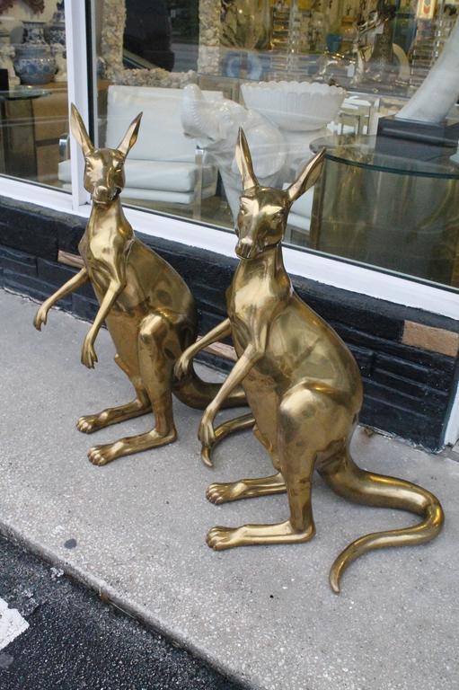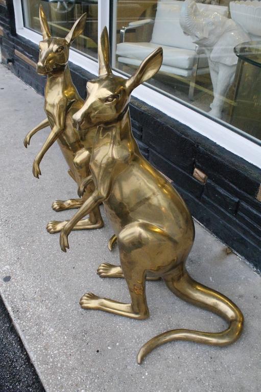 The most amazing pair of vintage Australian brass kangaroos. These were bought in Australia back in the 1970s and brought here when there owner moved here with her husband. Needless to say these are beyond stunning and one of a kind or should I say two of a kind! They have incredible details such as claws on each one of there paws and feet (pictured). They are beyond heavy! I have left them as they were found with natural patina I will leave it the new owner if he or she wants them to be shiny and polished. I have kept these for a few years as I was just so amazed by them I couldn’t bear to part with them right away. In the style of Hollywood Regency. Measures: 36″ tall.