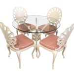 Vintage Brown Jordan Grotto 6 piece patio set which includes 5 dining chairs, table base, and round glass. The glass is original and may have some scratches. The glass can also be larger if needed. This set has been professionally powdercoated in a white gloss. The chaira have been upholstered in a coral pink blush Sunbrella fabric with matching white Sunbrella trim.