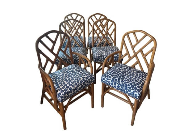 SOLD Vintage Set of 6 Rattan Chinese Chippendale Dining Chairs Newly Upholstered Blue