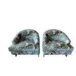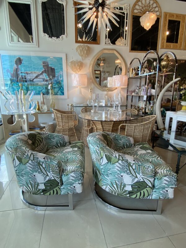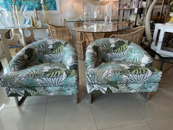 SOLD Vintage Pair Chrome Cantilever Barrel Tub Chairs Milo Baughman Style Upholstered Cockatoo Birds