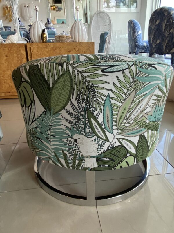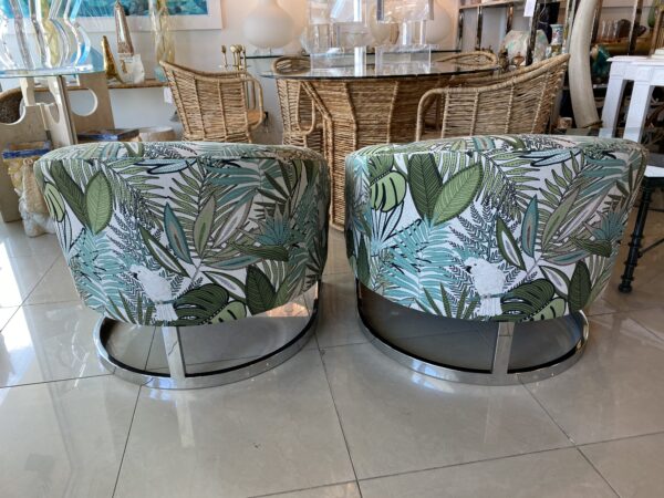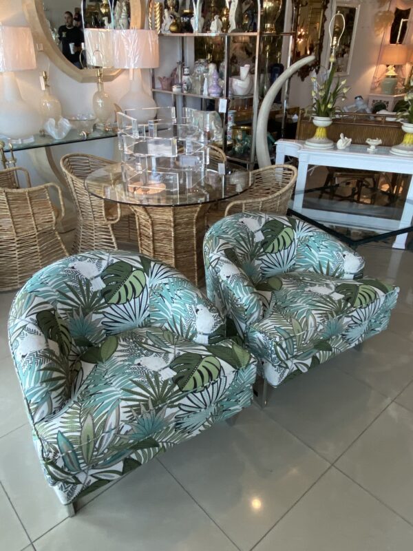 Tags: barrel tub chairs, beach, birds parrots, Chairs, chrome, cockatoo, Milo Baughman, newly upholstered, pair, Palm Tree, tropical, Vintage