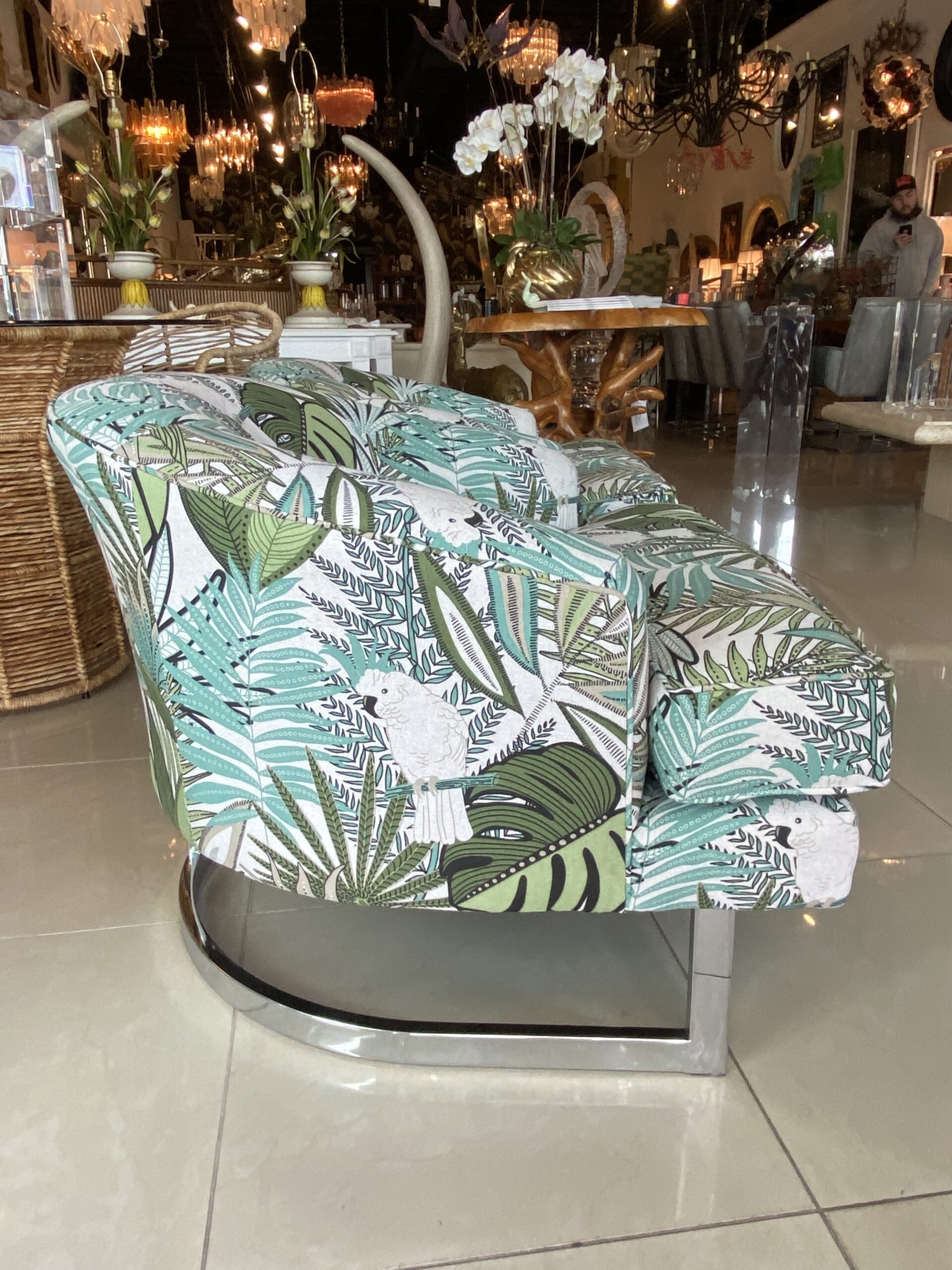 SOLD Vintage Pair Chrome Cantilever Barrel Tub Chairs Milo Baughman Style Upholstered Cockatoo Birds