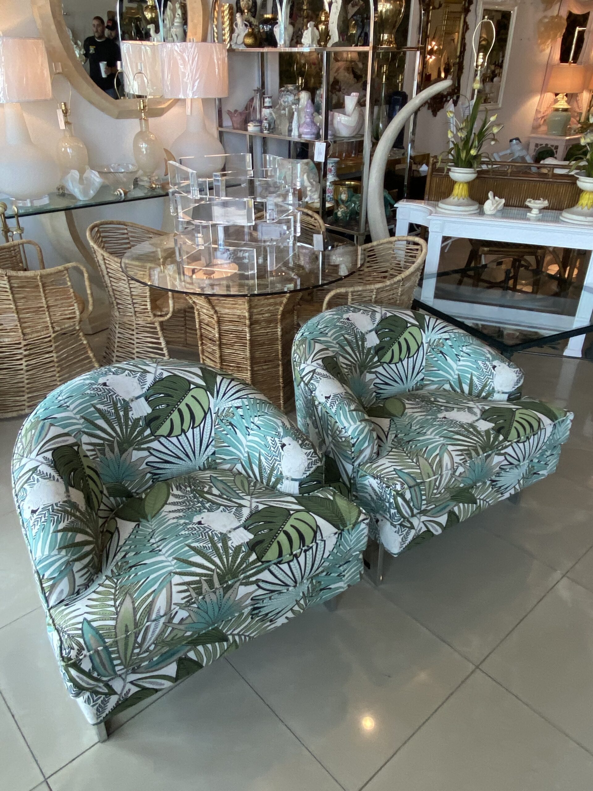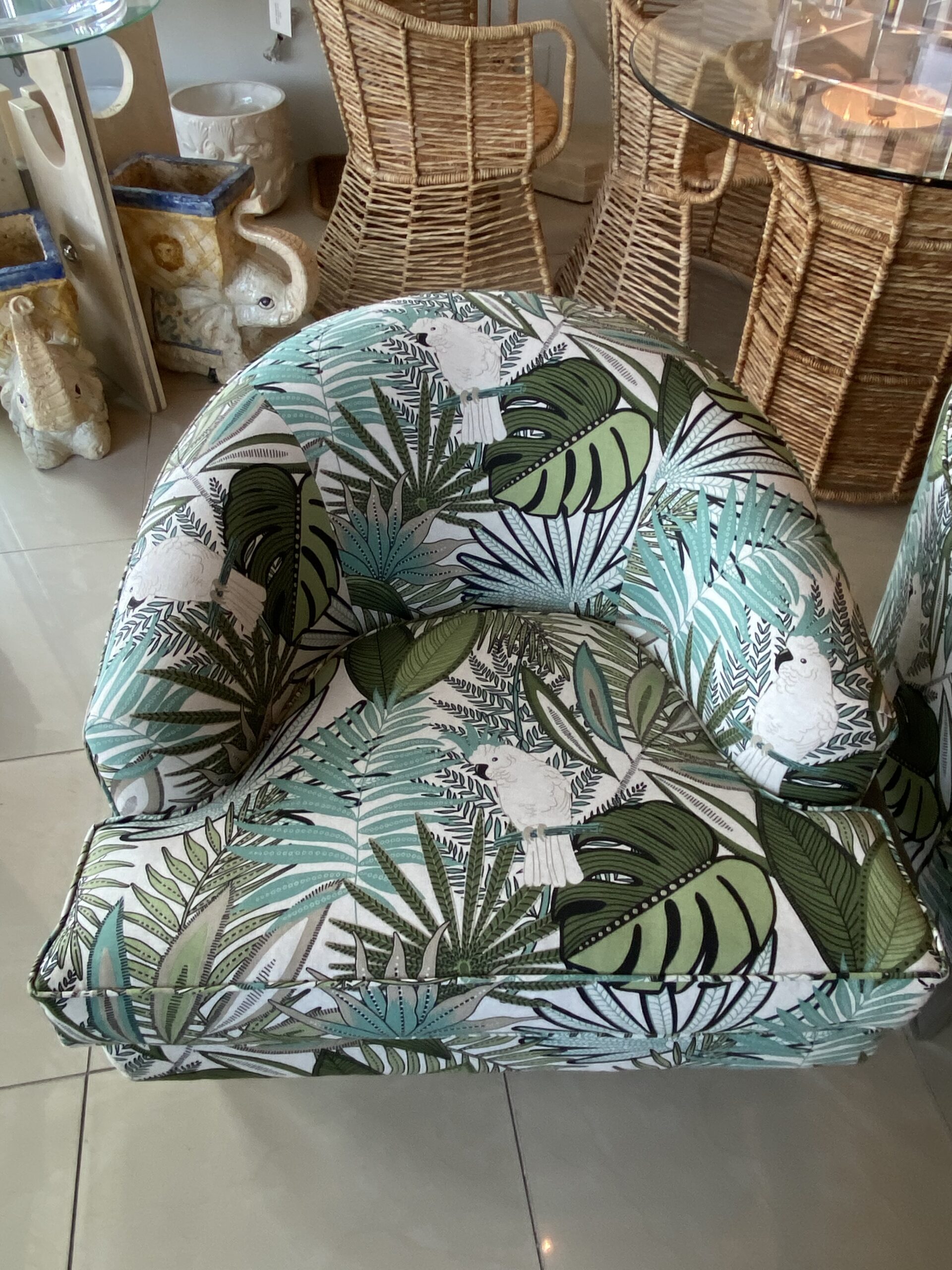 Tags: barrel tub chairs, beach, birds parrots, Chairs, chrome, cockatoo, Milo Baughman, newly upholstered, pair, Palm Tree, tropical, Vintage