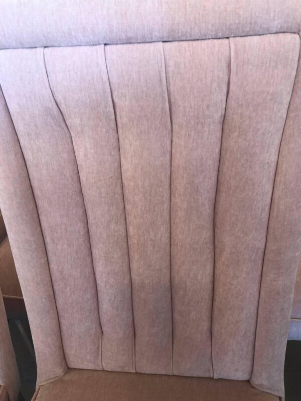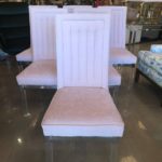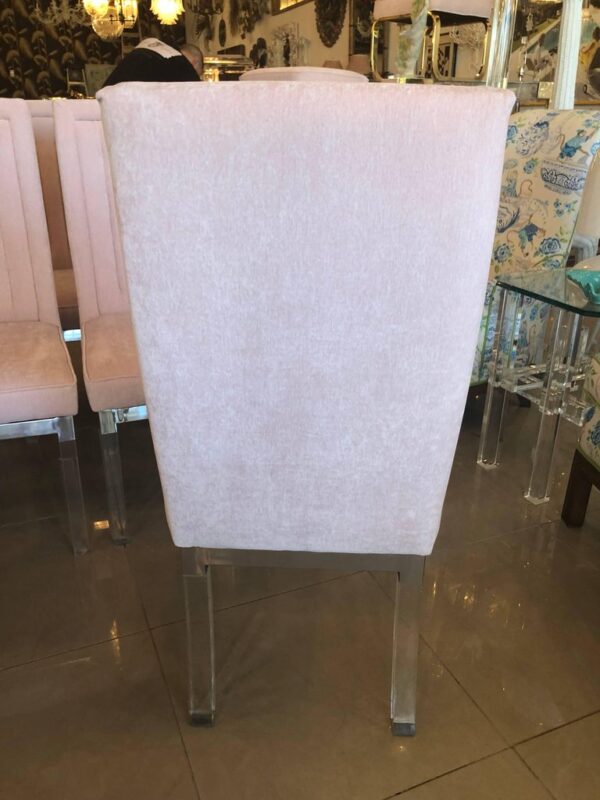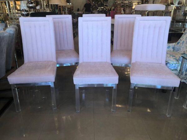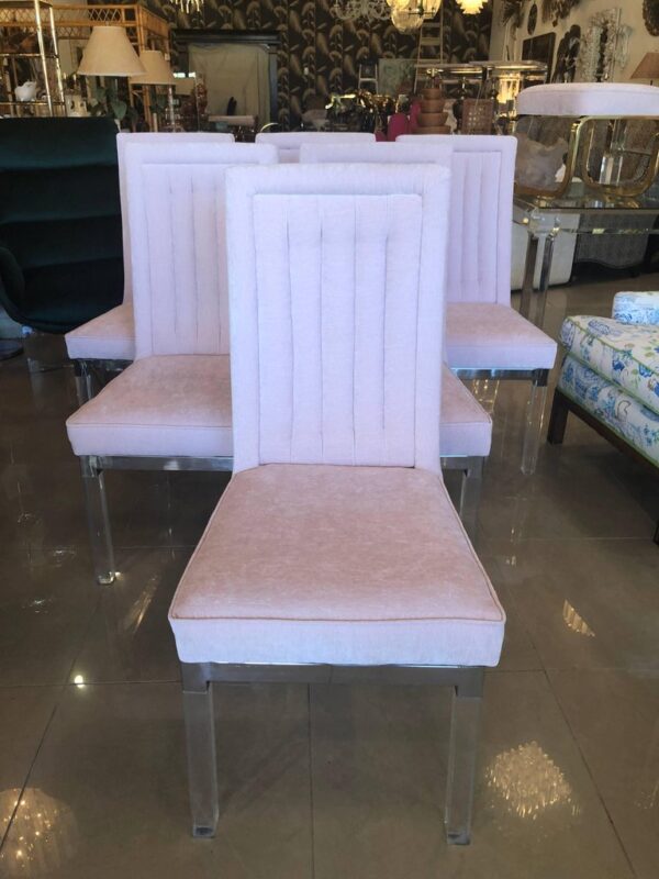 Set of 6 vintage lucite and chrome Charles Hollis Jones CHJ channel back side dining chairs. Meticulously restored with new blush pink velvet upholstery, polished lucite and chrome. I have 18 available. Option to provide COM is available.